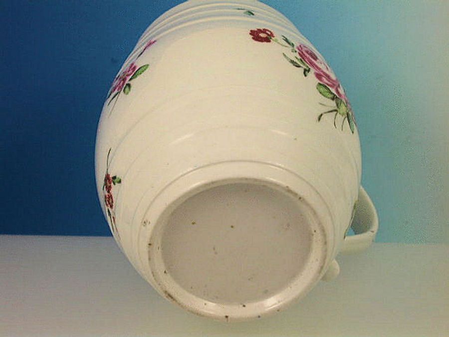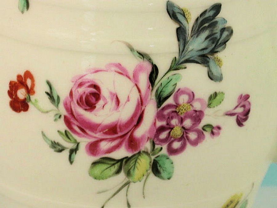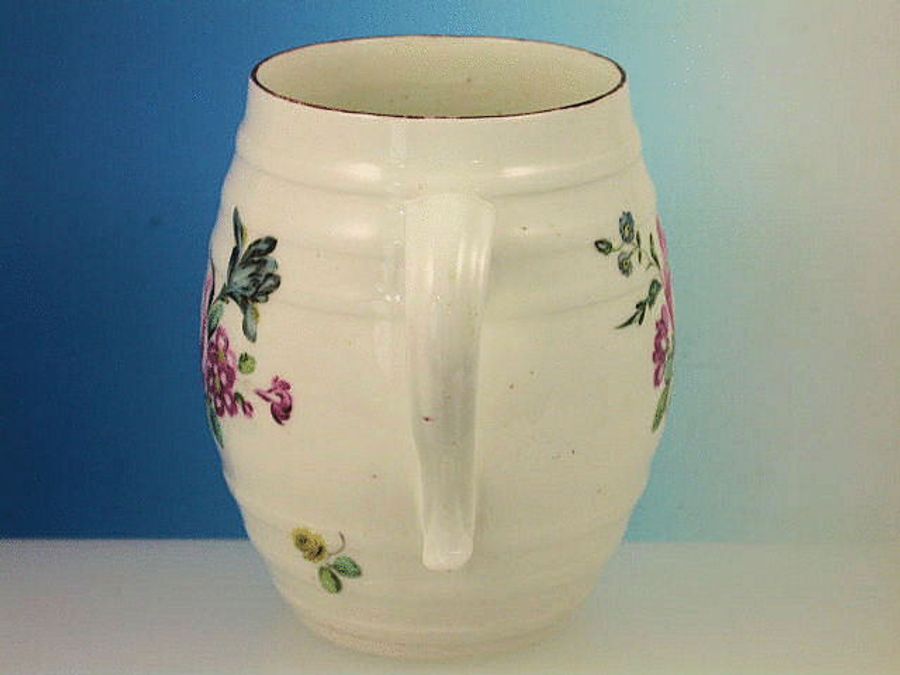 A Duesbury Derby Barrel shaped Mug with solid strap handle, painted in polychrome enamels with sprays and bouquets of English flowers within a chocolate line border to the rim.