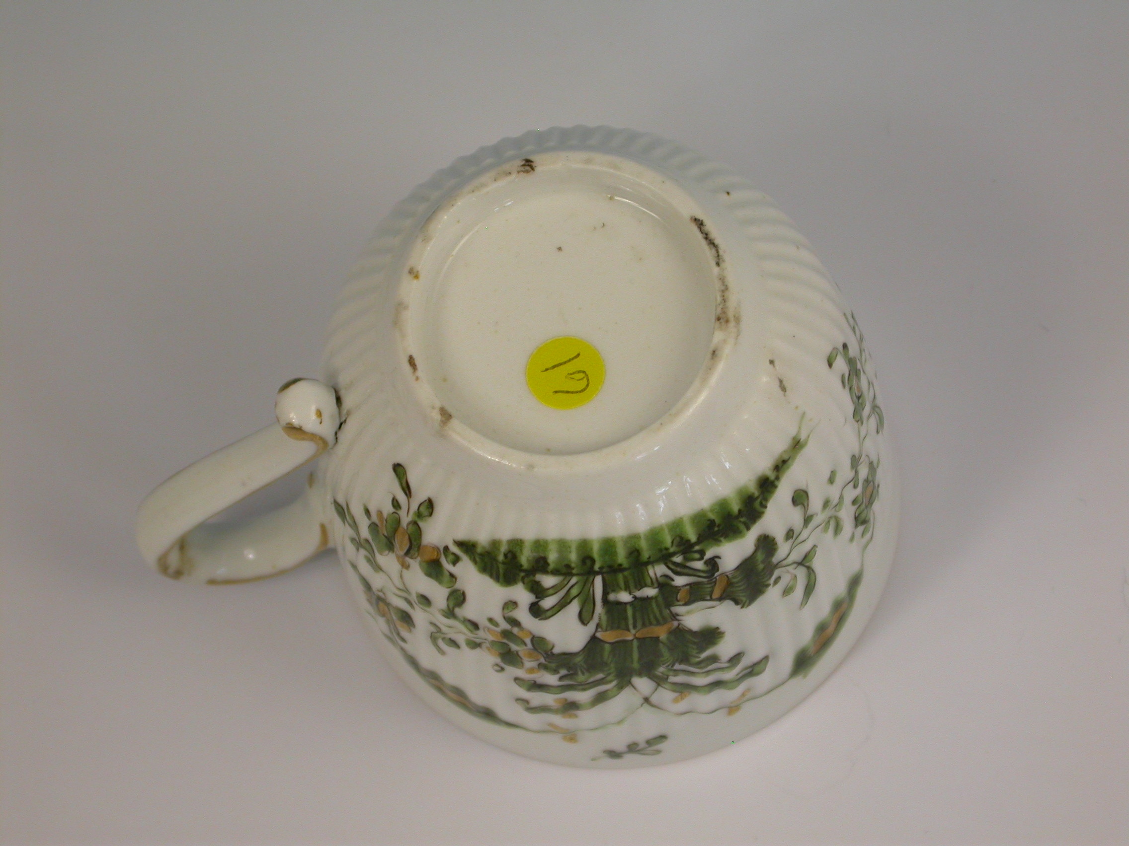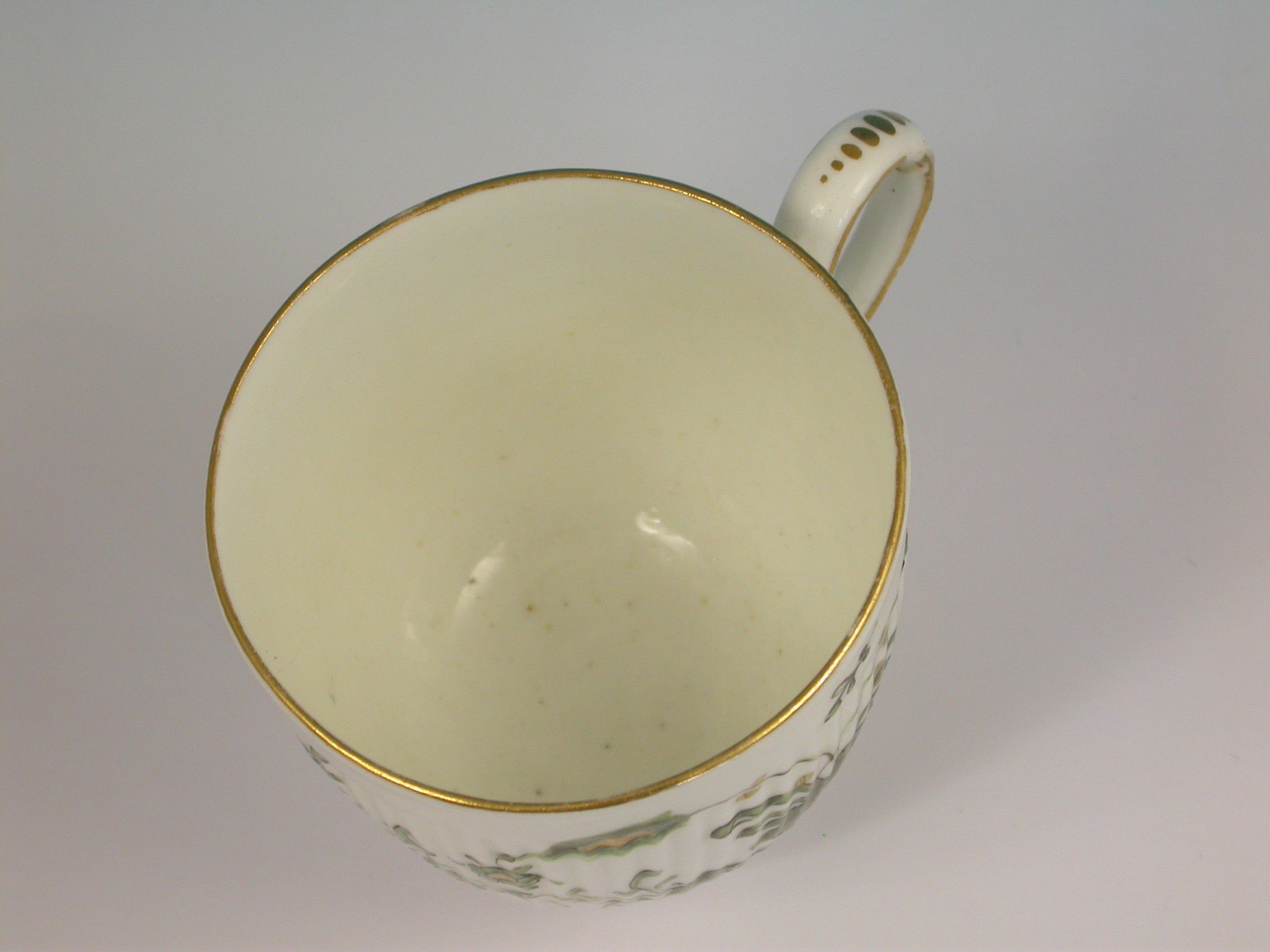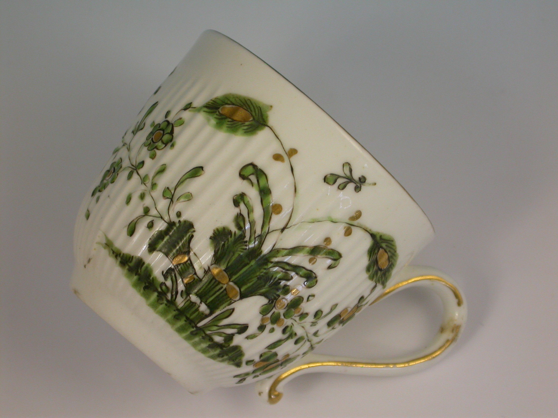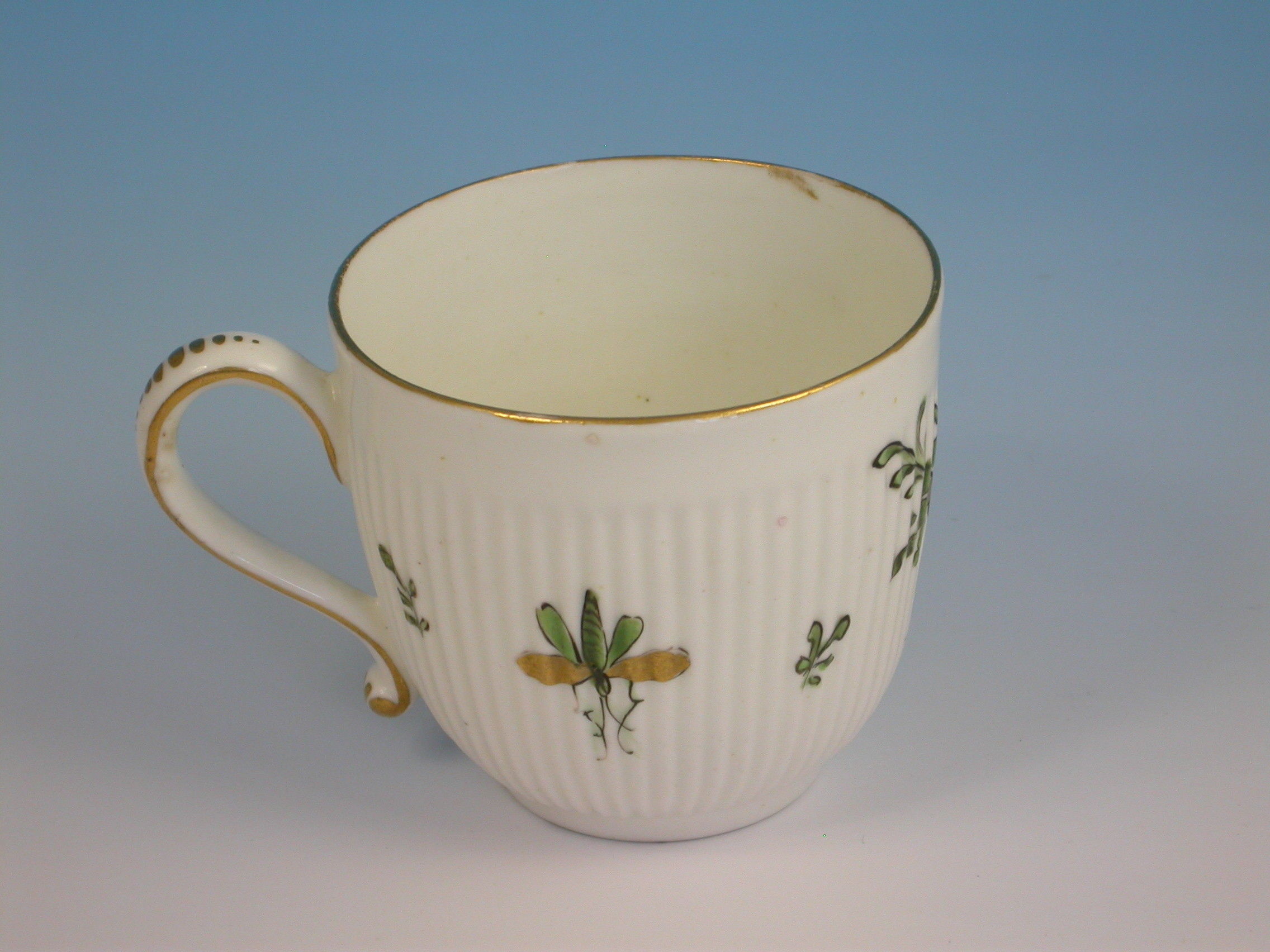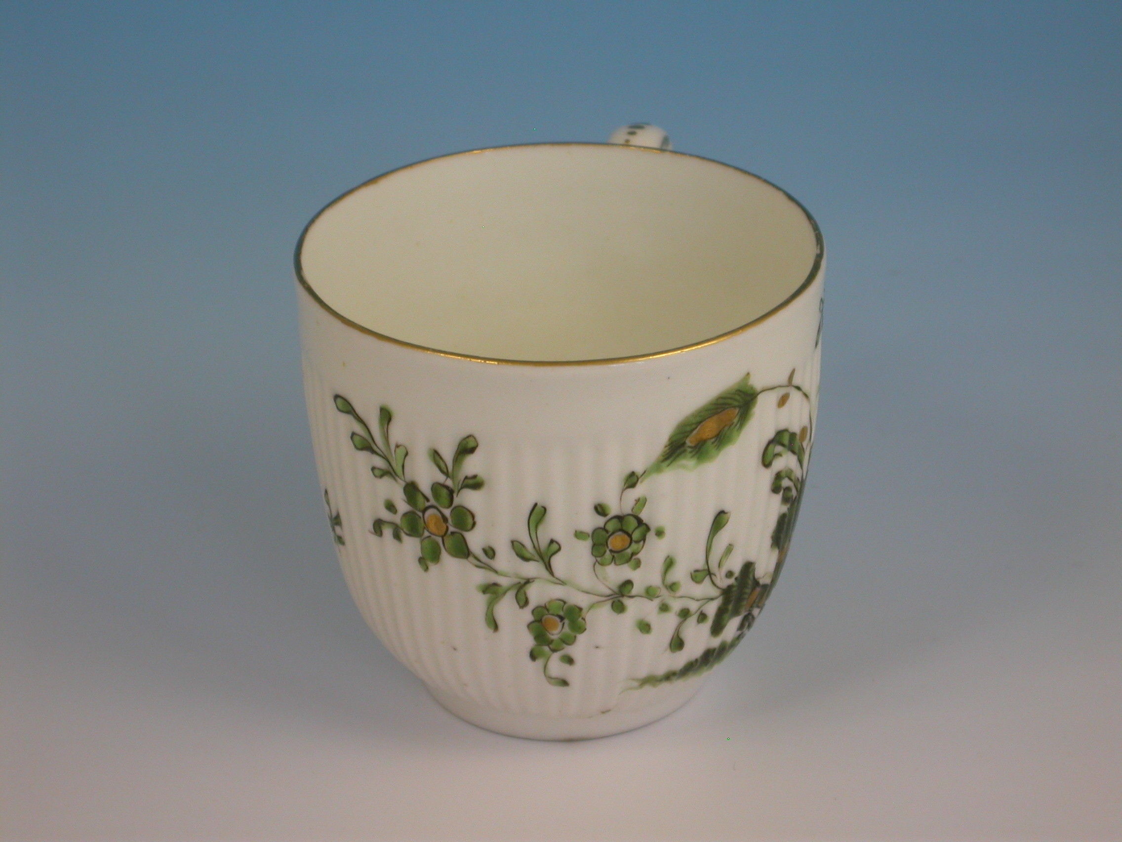 A fine and rare Duesbury Derby spiral moulded Coffee Cup with solid loop handle, painted in famille verte style with a variant of the banded hedge pattern, all within a gilt line border.