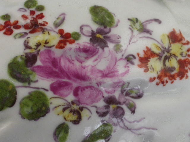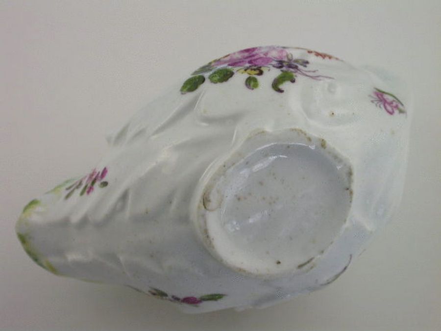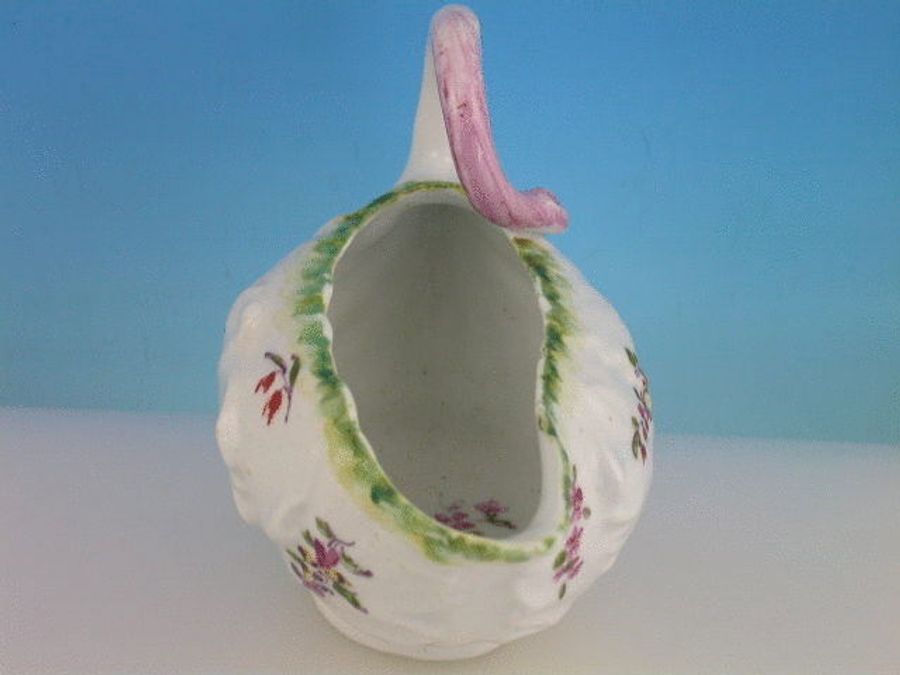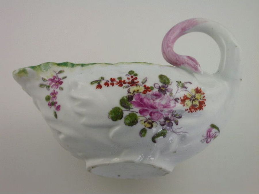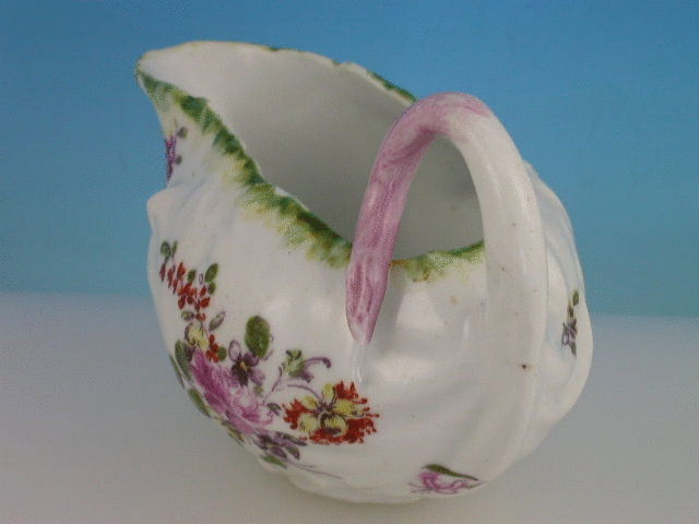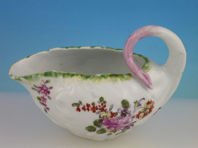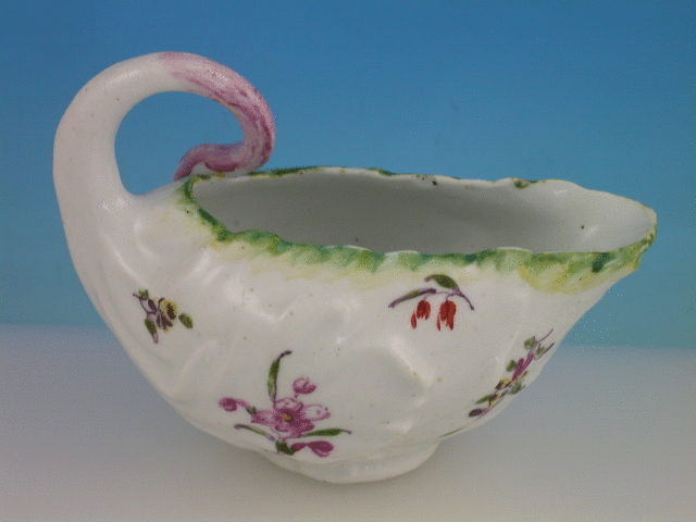 A good Duesbury Derby moulded leaf shaped Creamboat of small size, with curled stalk handle, painted in polychrome enamels with floral bouquets, washed puce handle. c1770.