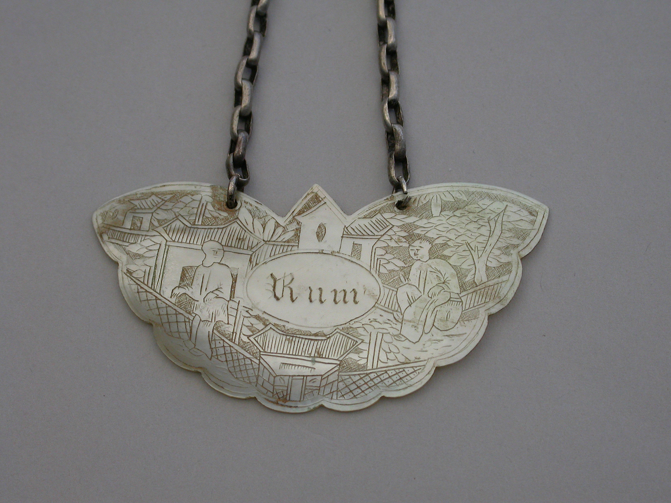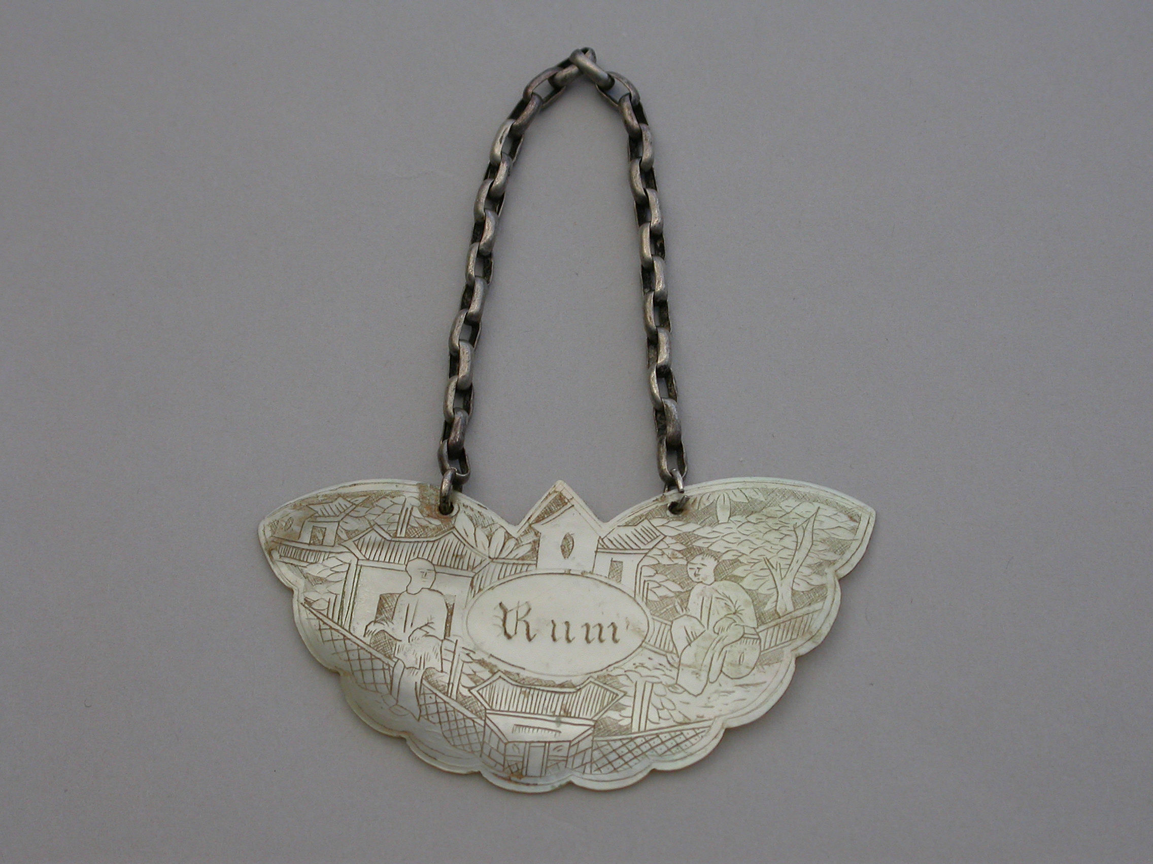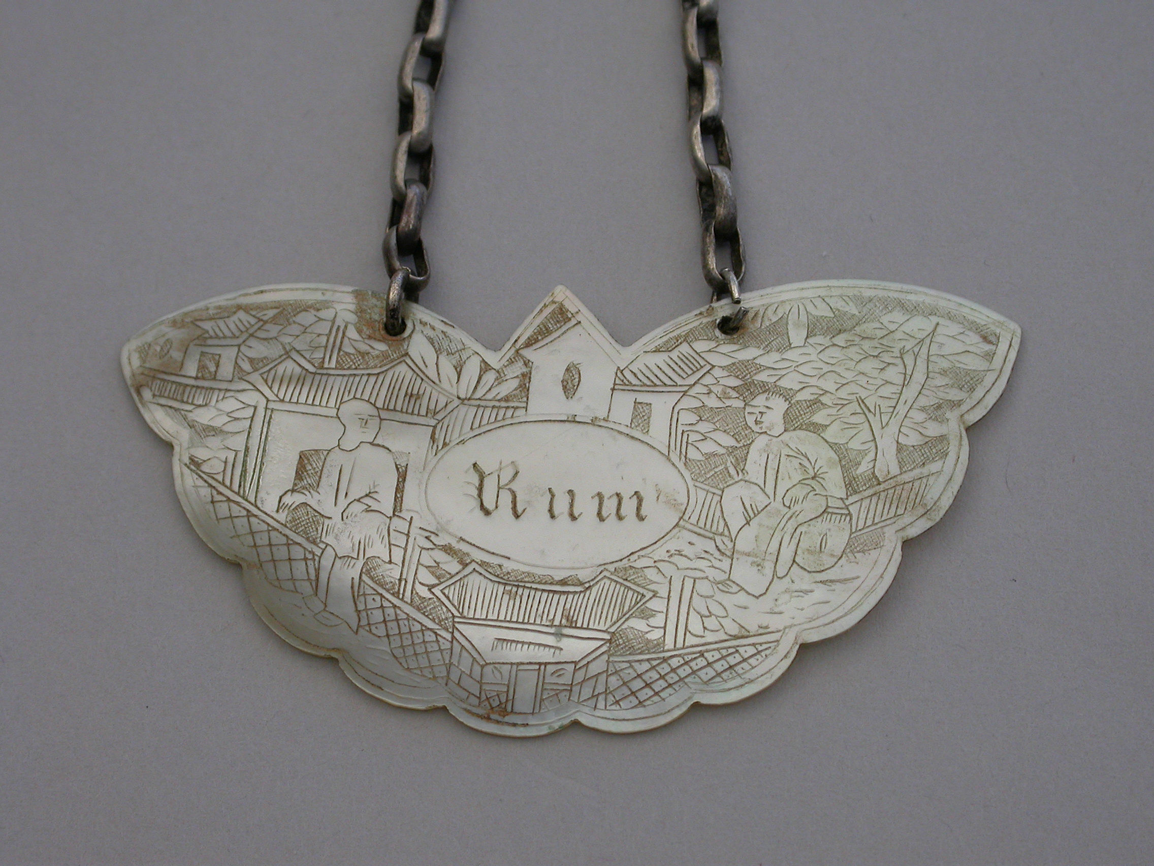 An early 19th century Chinese Export Mother of Pearl Wine Label made in the form of a butterfly and carved with oriental figures in landscape scenes surrounding a name plate engraved for Rum.