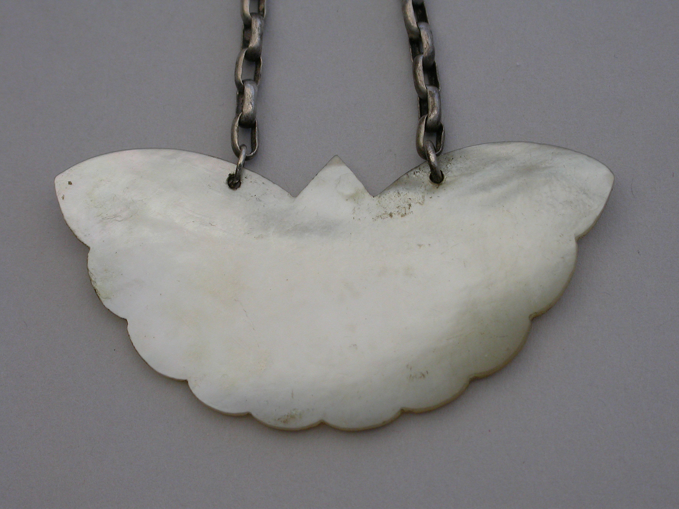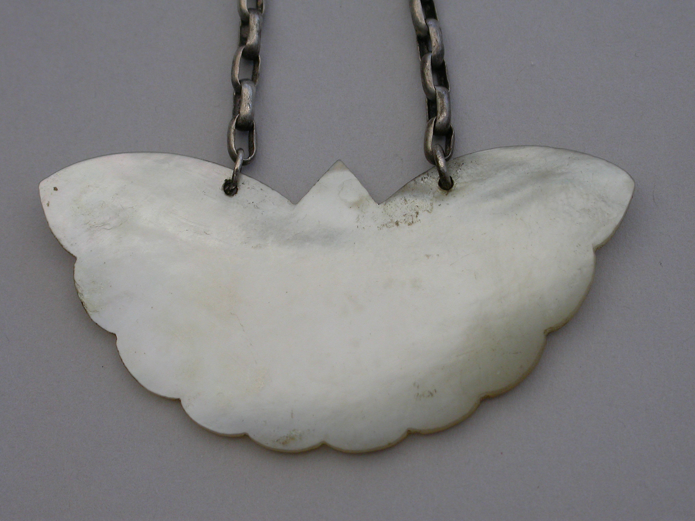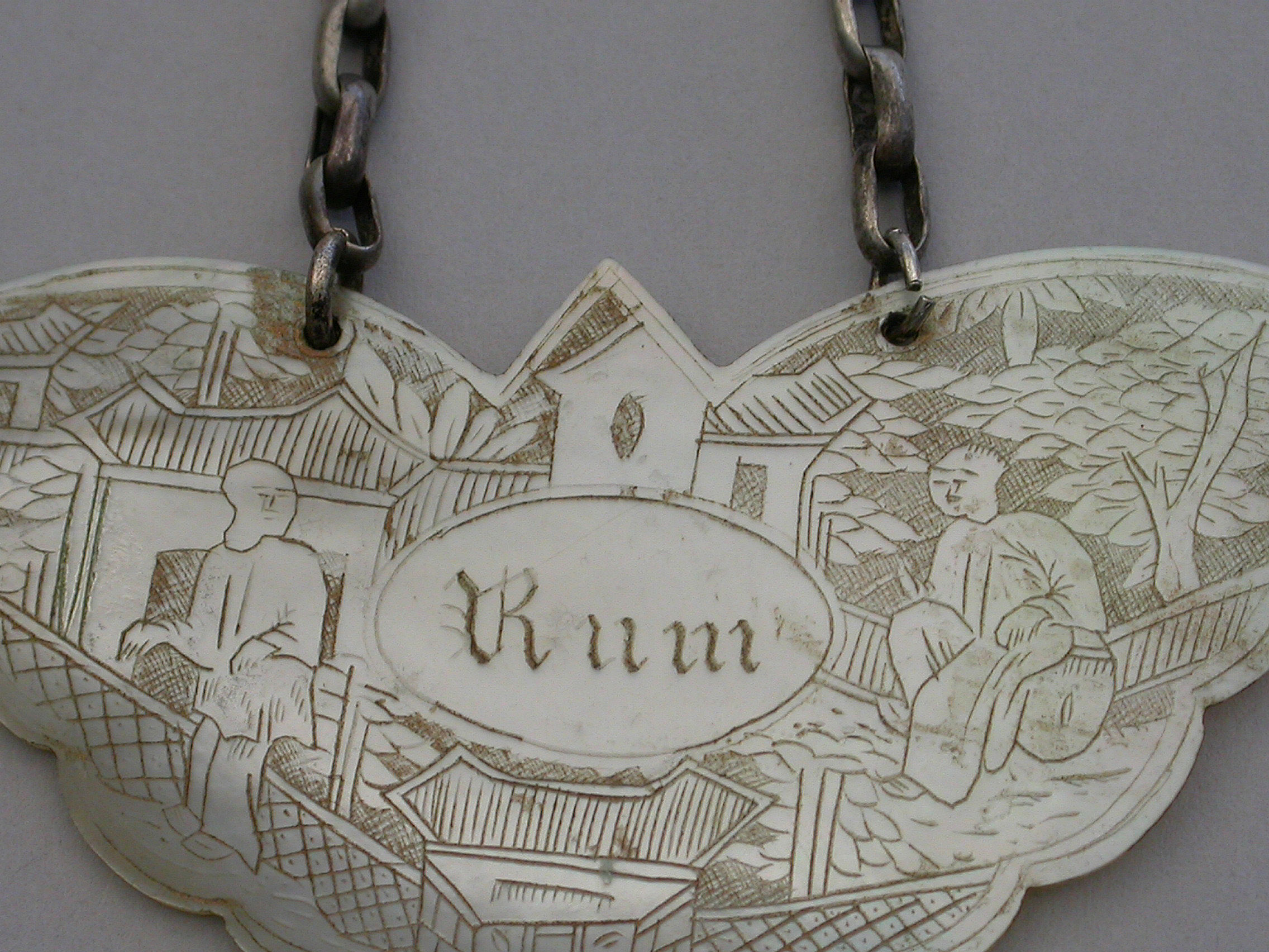 An early 19th century Chinese Export Mother of Pearl Wine Label made in the form of a butterfly and carved with oriental figures in landscape scenes surrounding a name plate engraved for Rum.