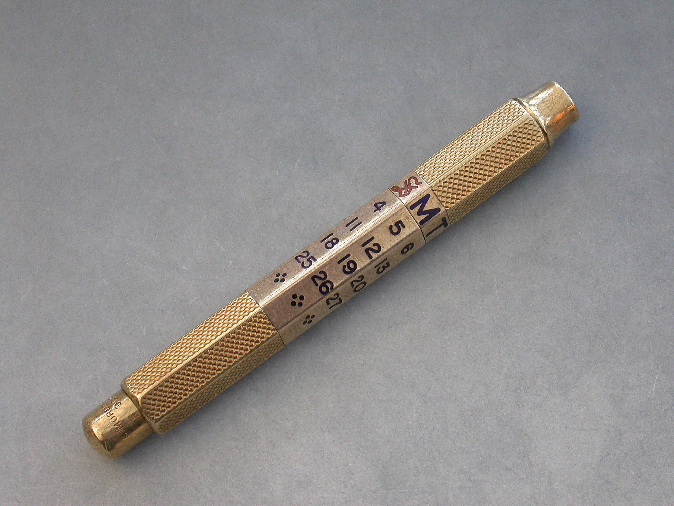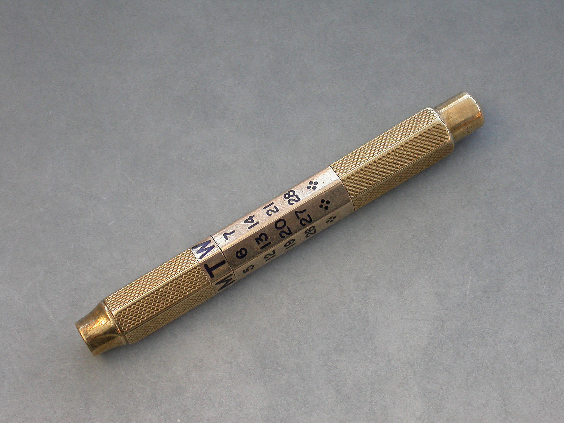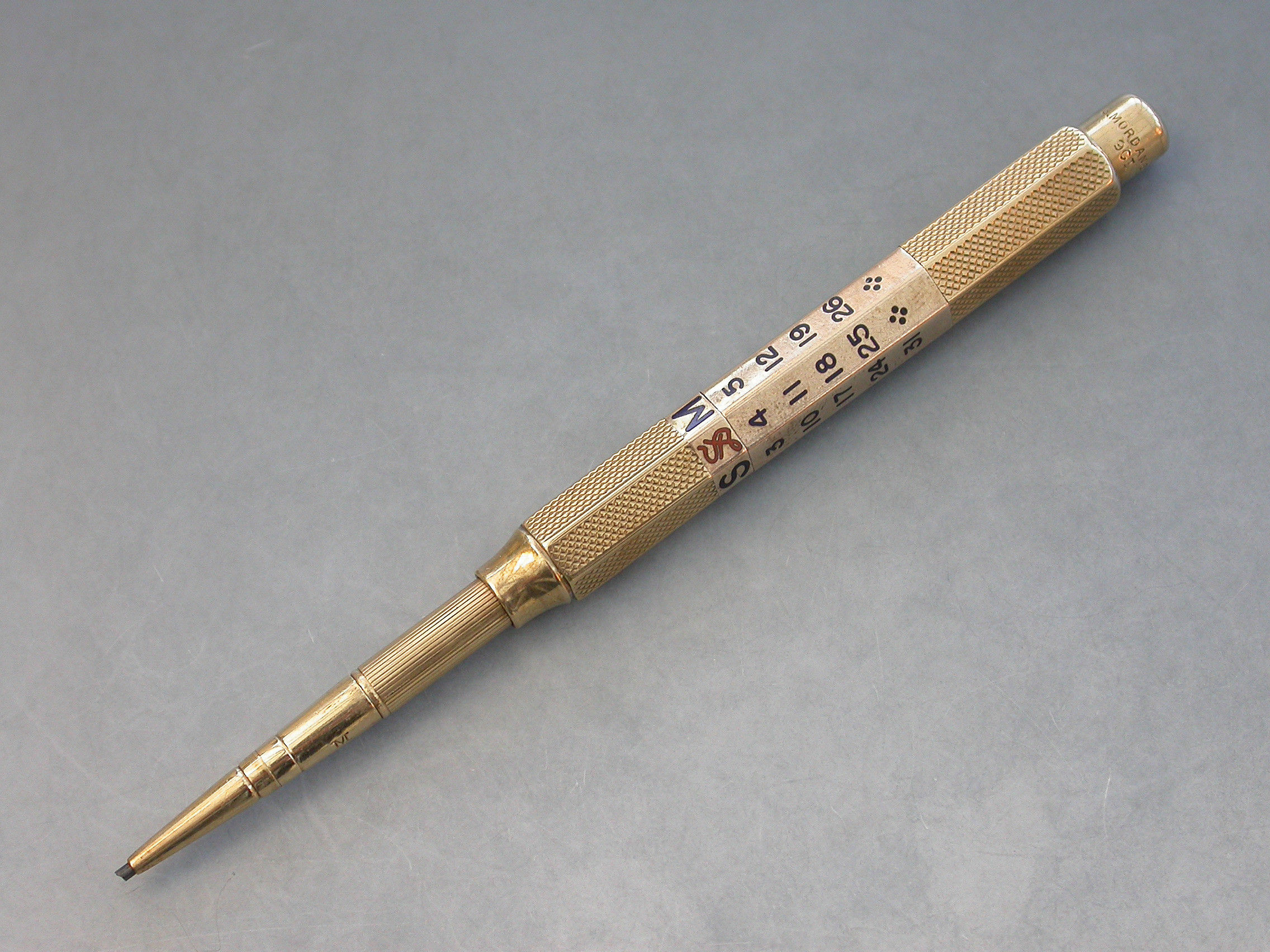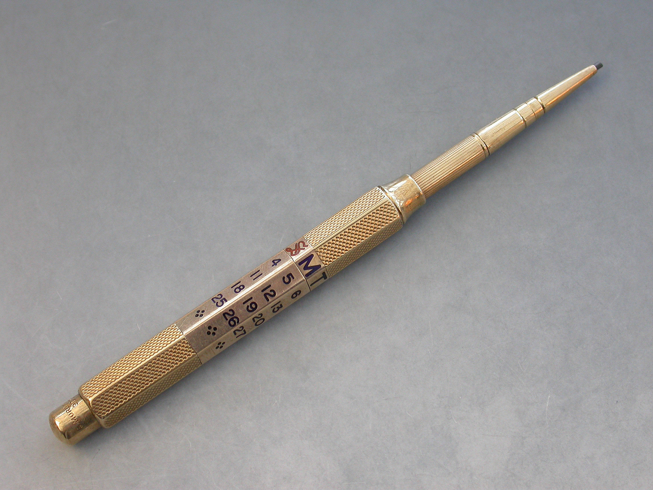 A good quality early 20th century 9 carat gold and enamel Propelling Pencil with push button ""Gravity Drop"" opening mechanism, the engine turned octagonal body with integral swivelling perpetual calender with enamelled numbers and letters for days of the week, Sunday in red.