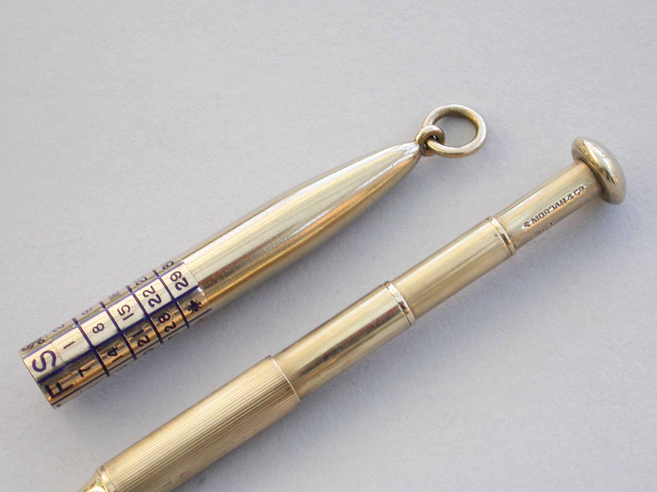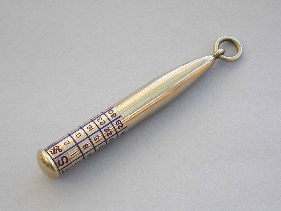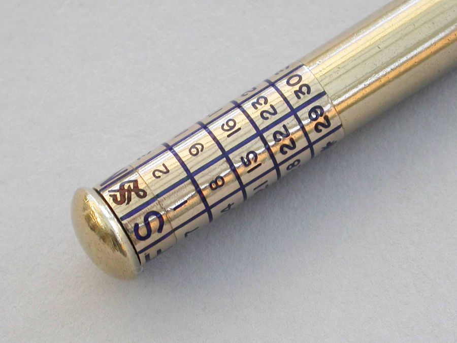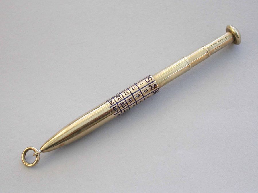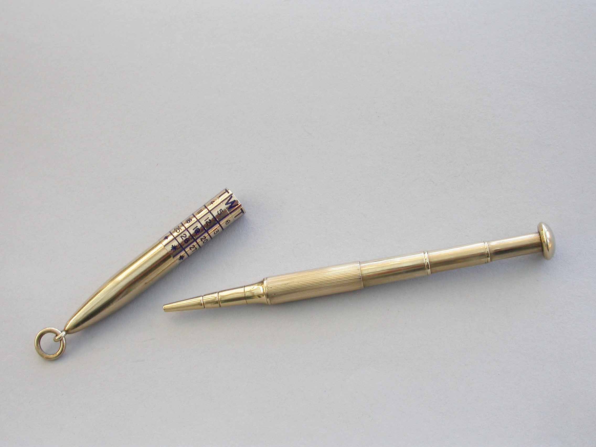 A good quality early 20th century 9 carat gold Telescopic Propelling Pencil housed within a torpedo shaped sheath with enamelled revolving Perpetual Calendar.