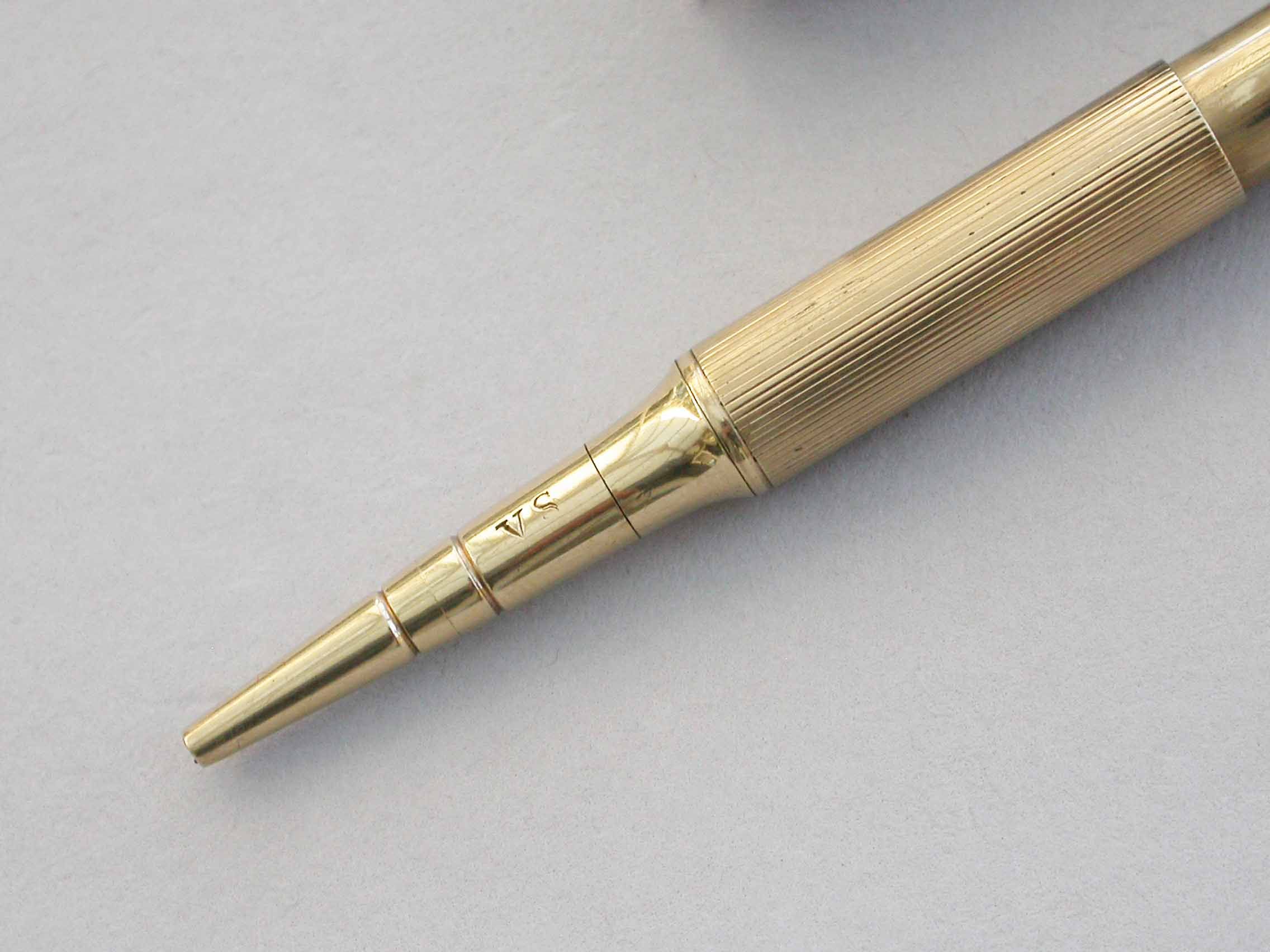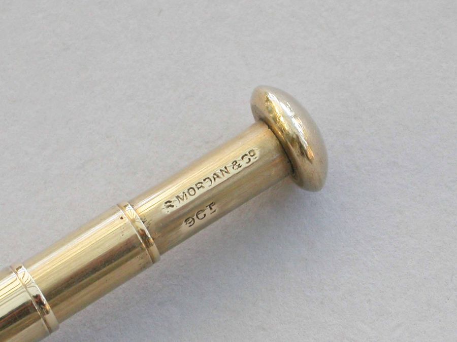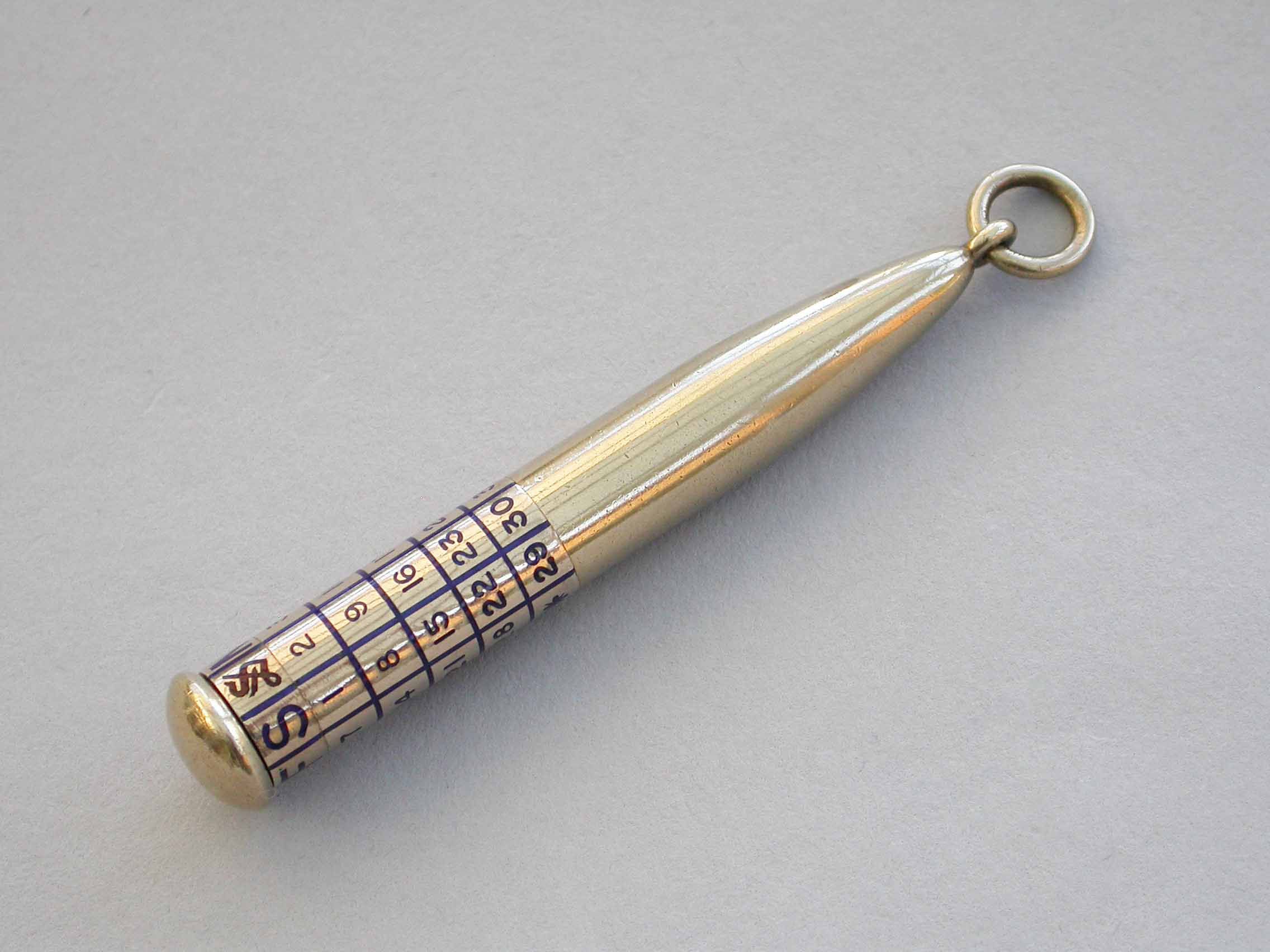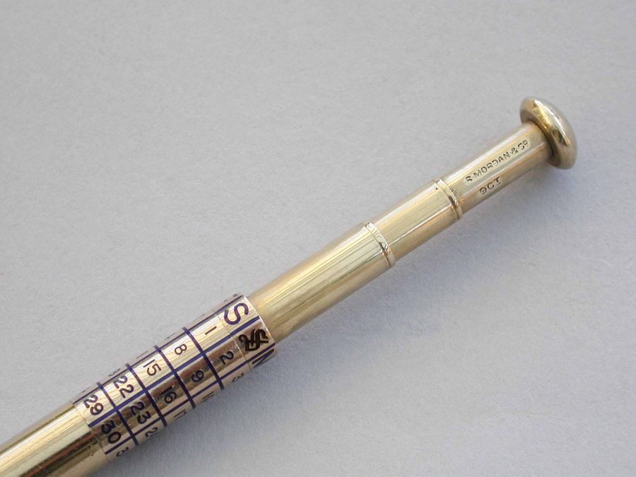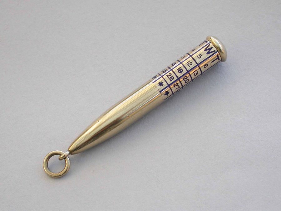 A good quality early 20th century 9 carat gold Telescopic Propelling Pencil housed within a torpedo shaped sheath with enamelled revolving Perpetual Calendar.