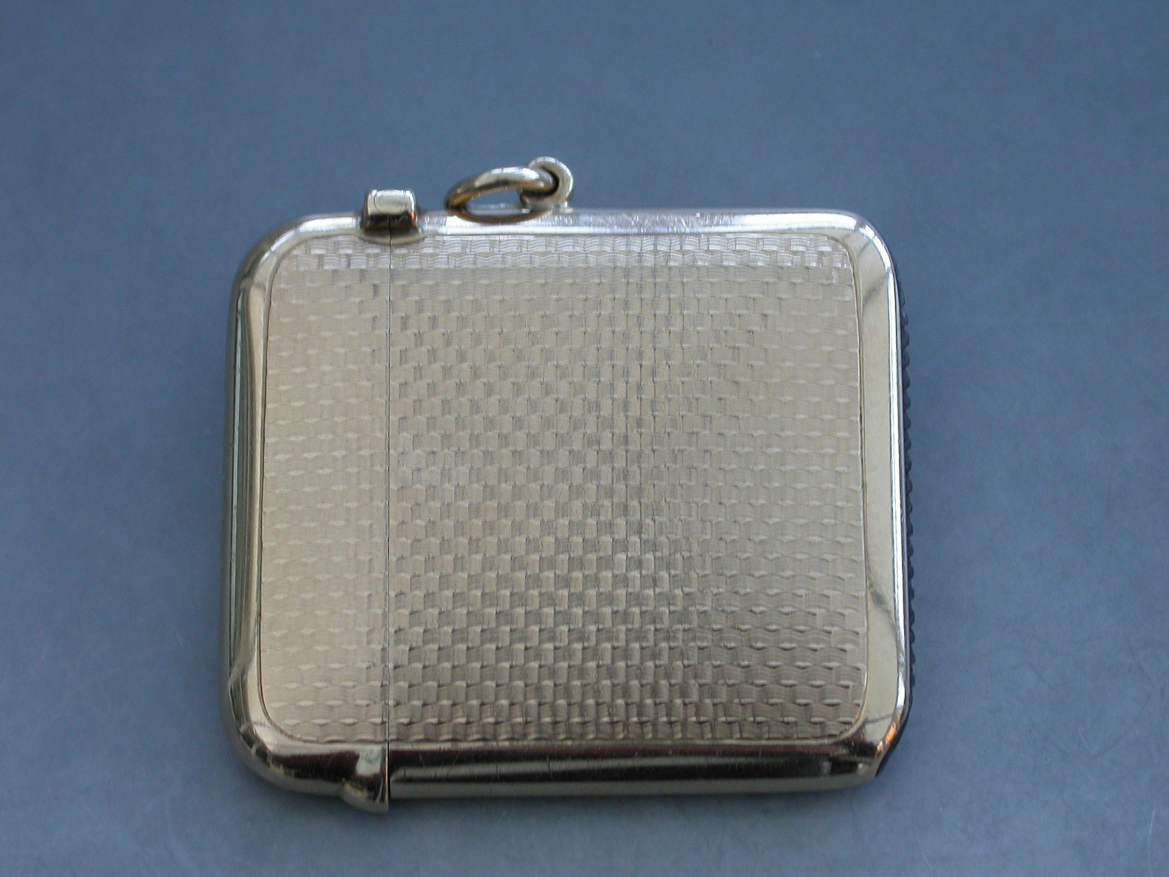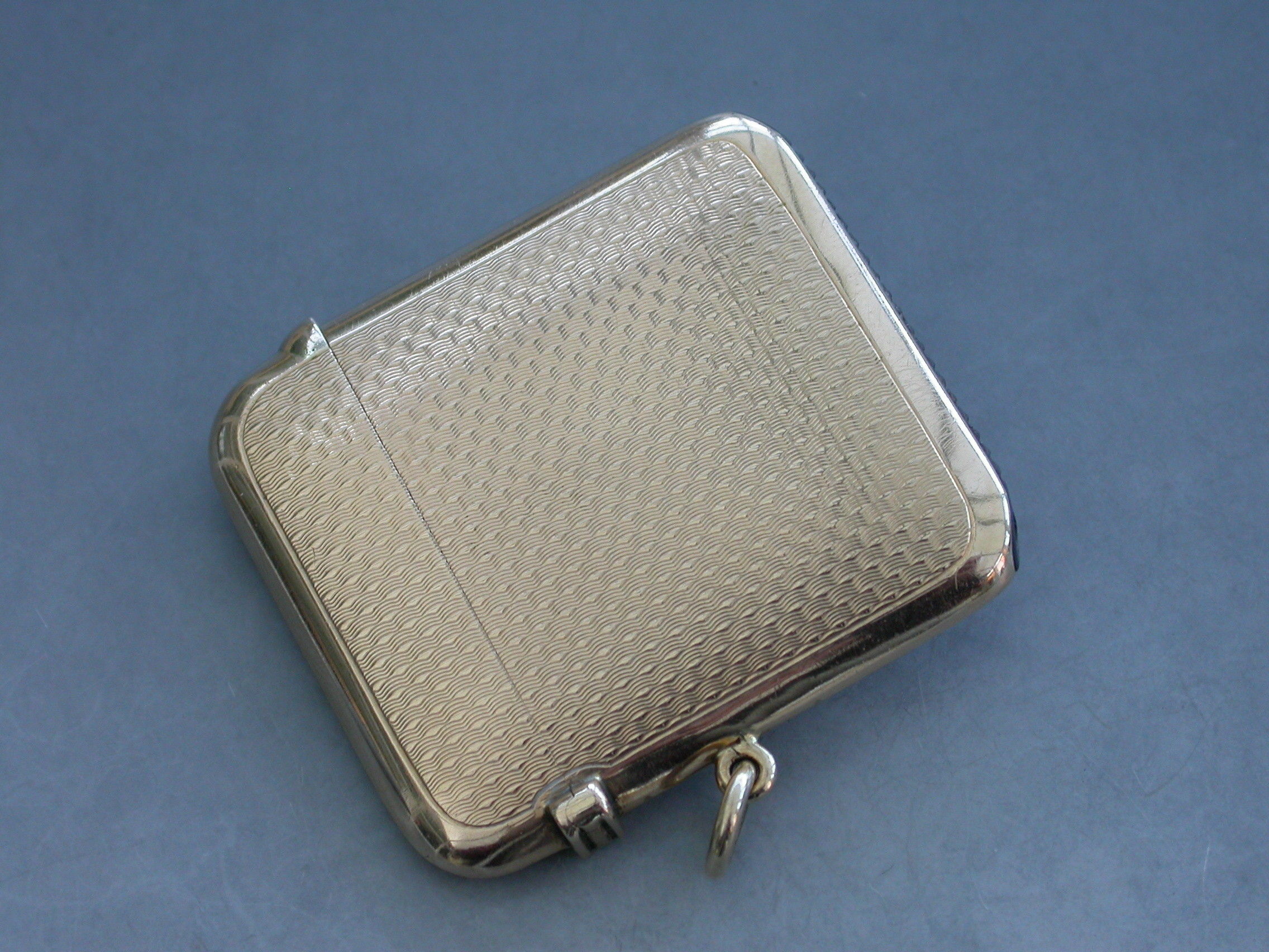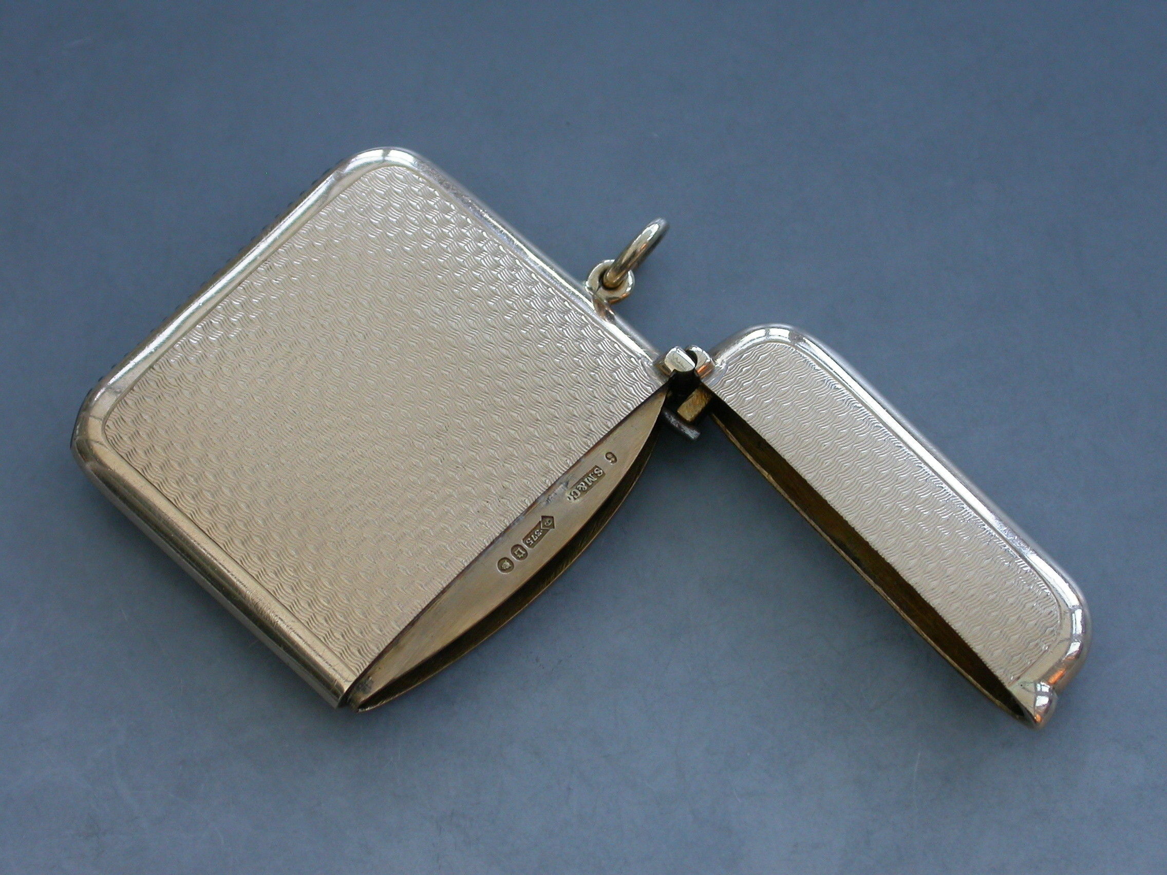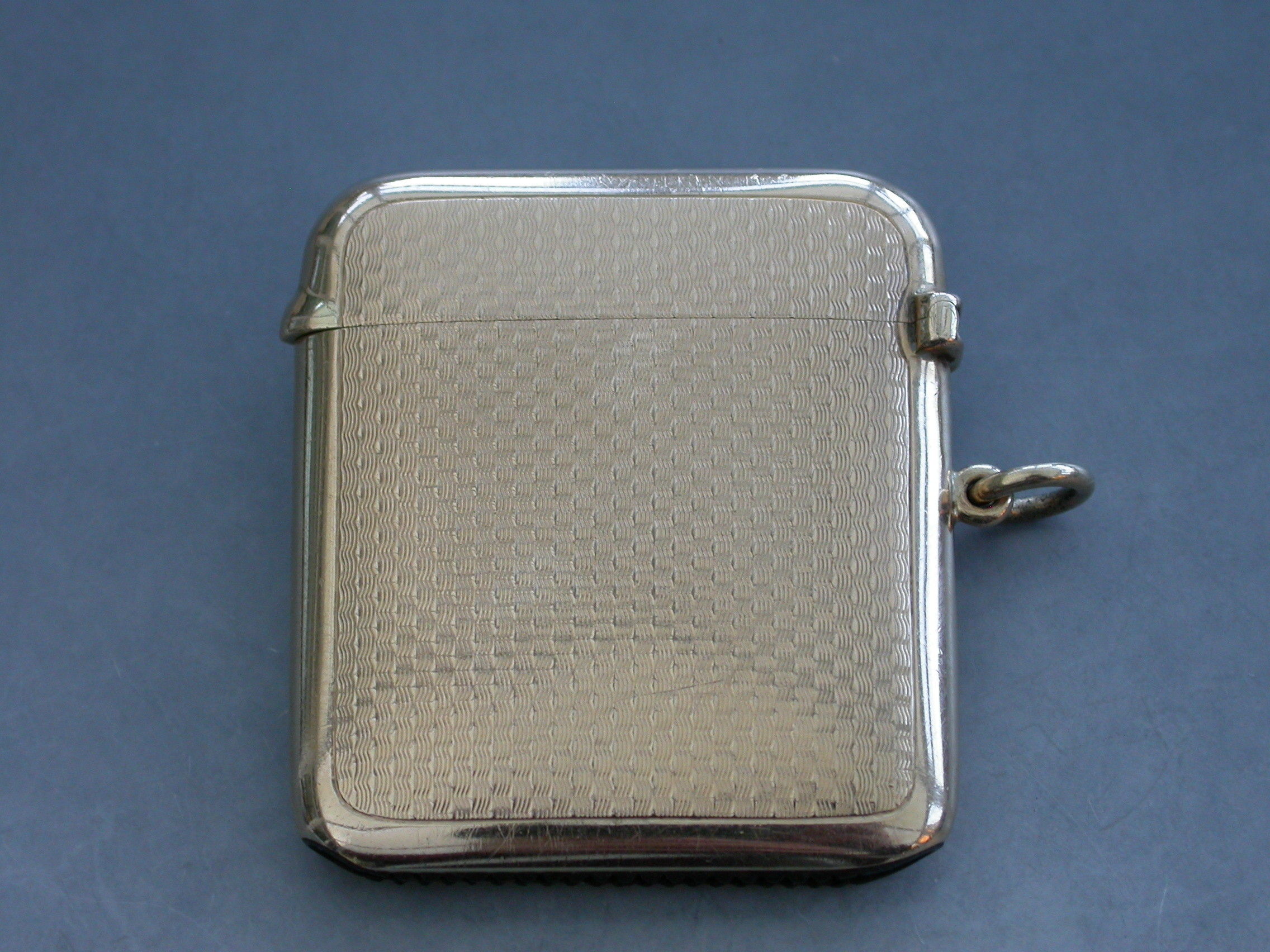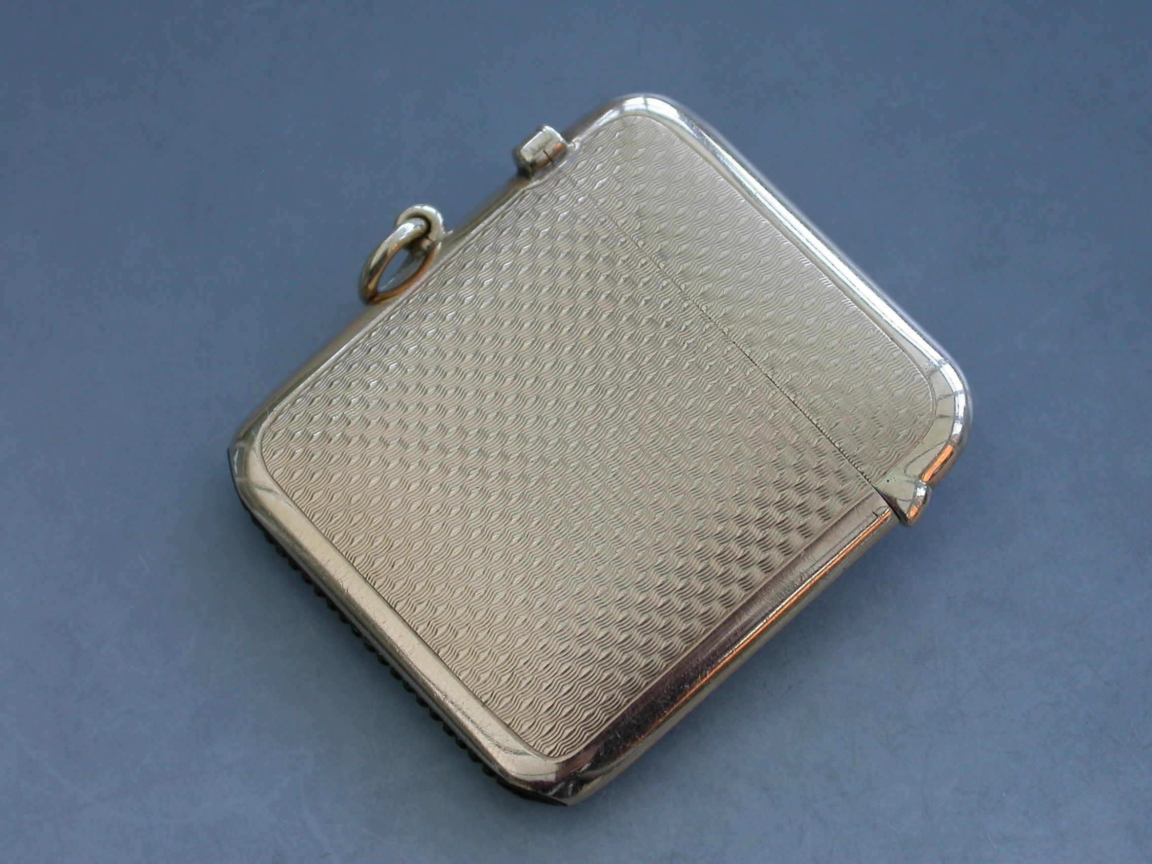 A good quality early 20th century 9 carat gold Vesta Case, of rounded rectangular form with hinged flip-top lid and attached suspension ring. The body with plain engine turned decoration.