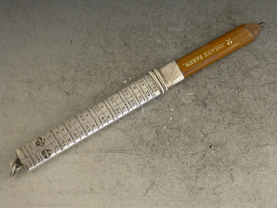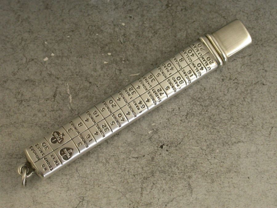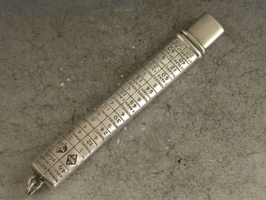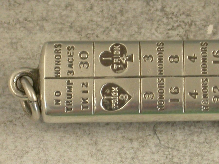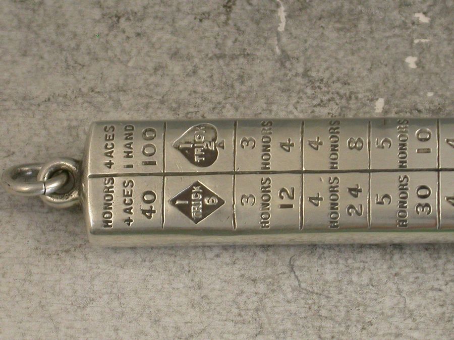 A good early 20th century American Patented sterling silver Bridge Scoring Pencil, the sheath engraved and enamelled in black with four tables detailing the various Bridge Scores, attached suspension ring. Complete with original Johann Faber cedar Pencil.