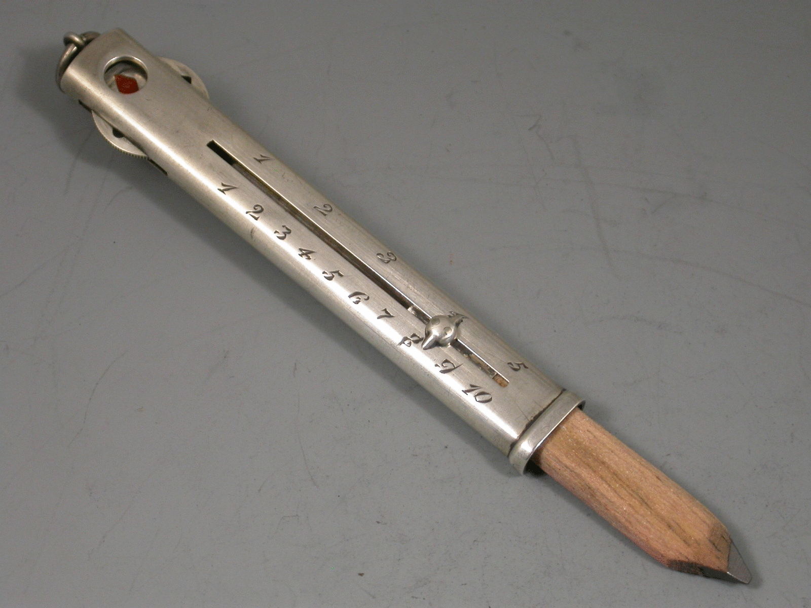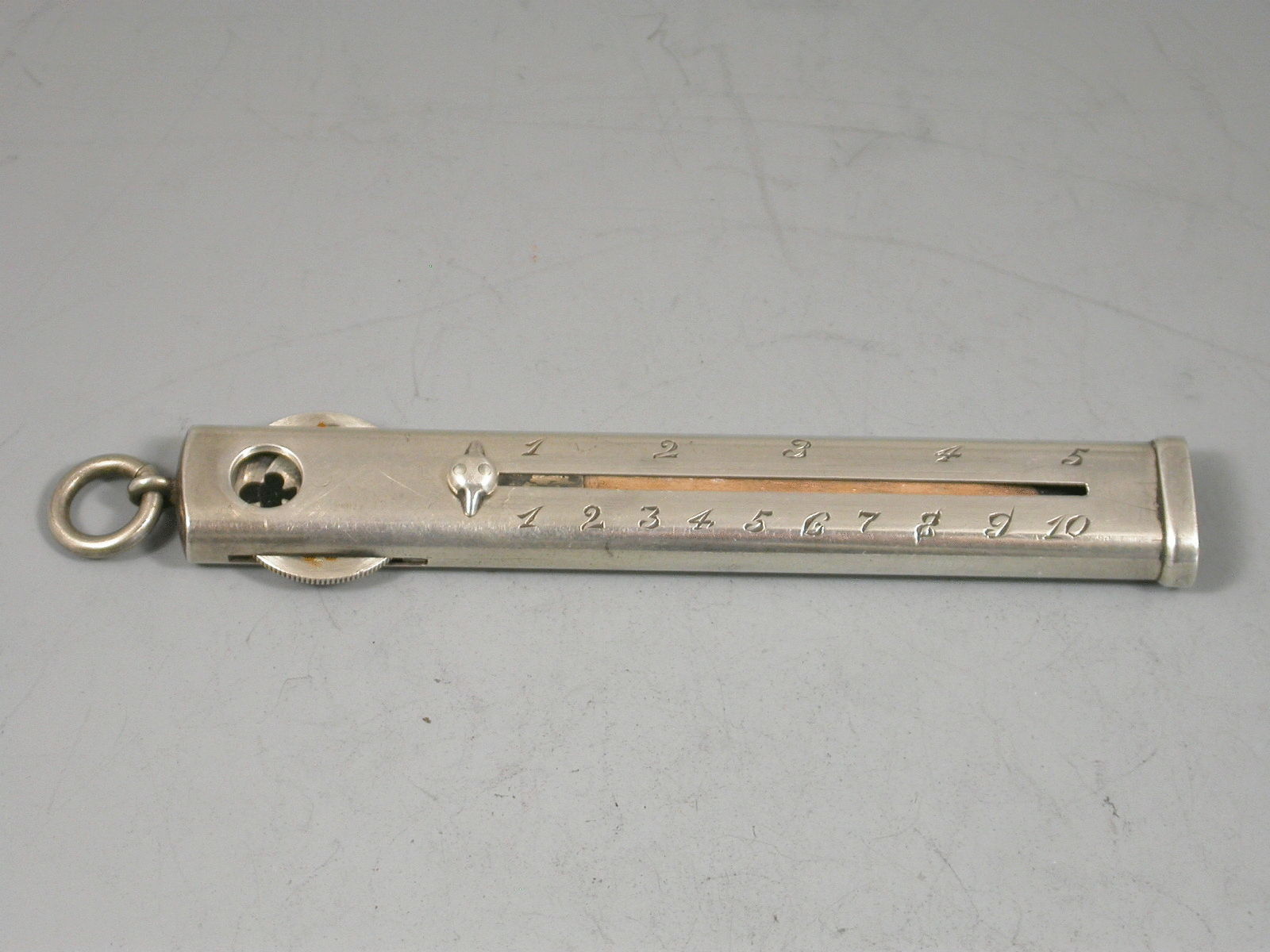An early 20th century sterling silver slide action Carpenters' style Pencil, the case engraved with two scales 1 - 5 and 1 - 10, the top of the pencil set with a rotating wheel displaying enamelled trumps symbols, hearts, spades, diamonds and clubs, with attached suspension ring.