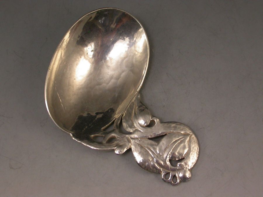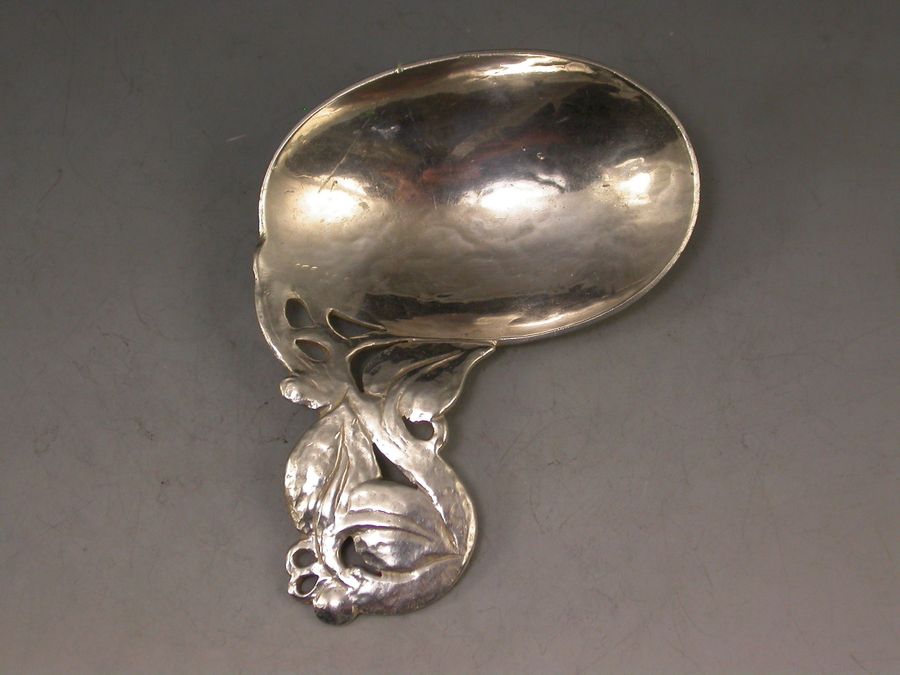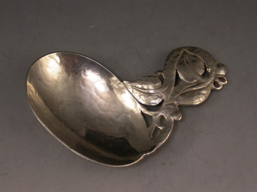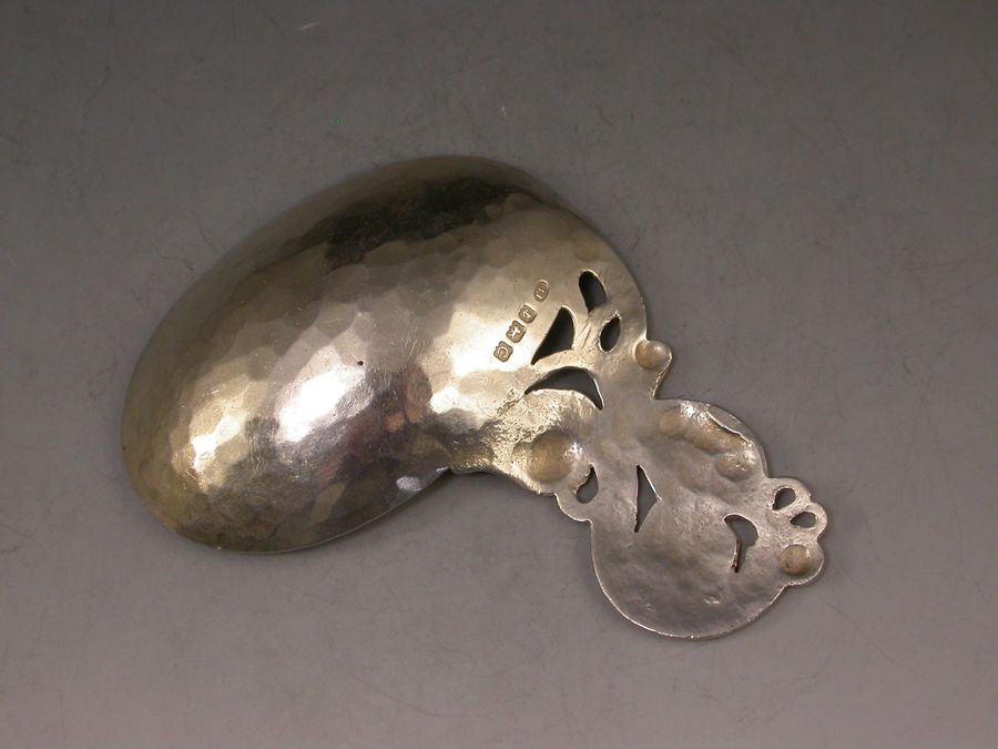 A good quality early 20th century hammered silver Caddy Spoon made in the Arts & Crafts style, with oval bowl and pierced entwined leaf and berry handle.