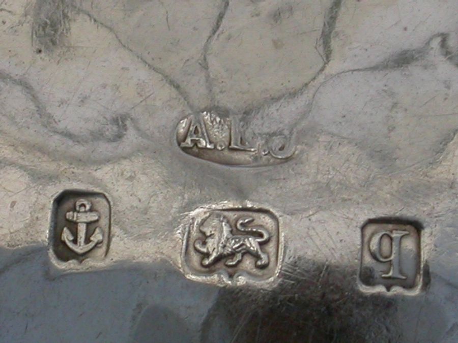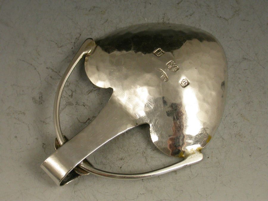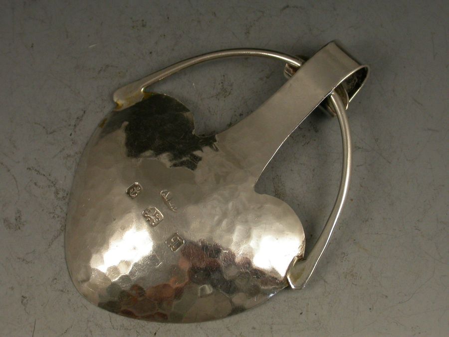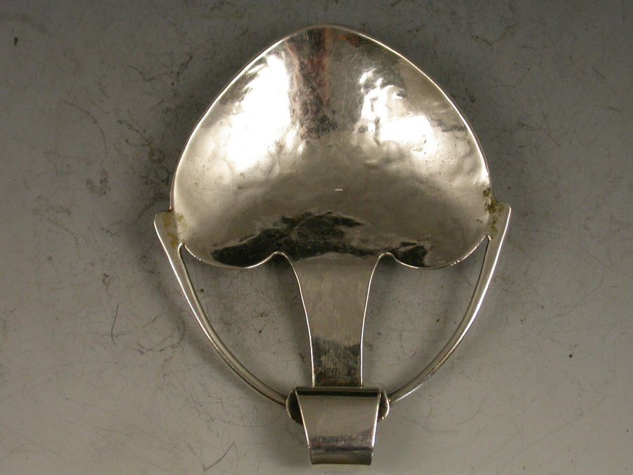 A good quality early 20th century hammered silver Caddy Spoon, made in the Arts & Crafts style with heart shape bowl and curled over handle with two wire supports.