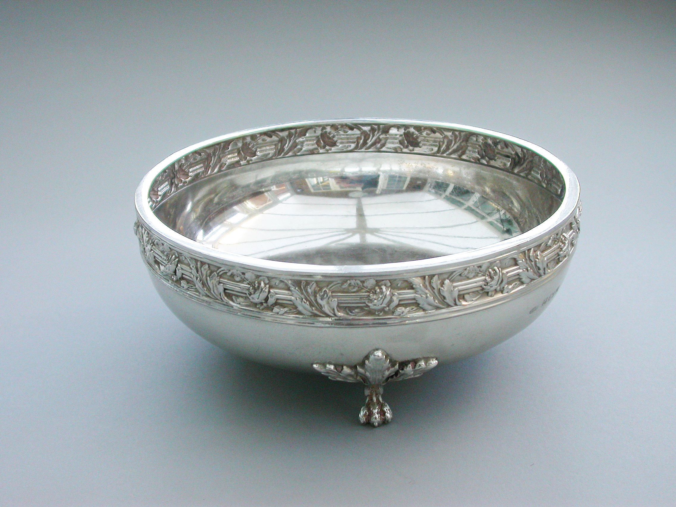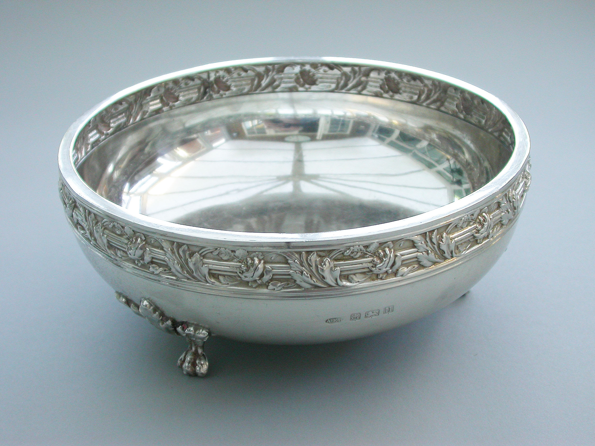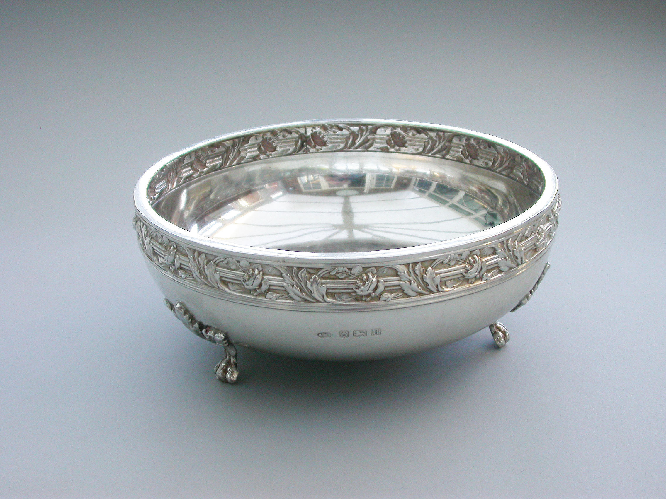 An early 20th century Arts & Crafts period silver Bowl of circular form with embossed band of trailing roses, standing on three paw feet with leaf supports.