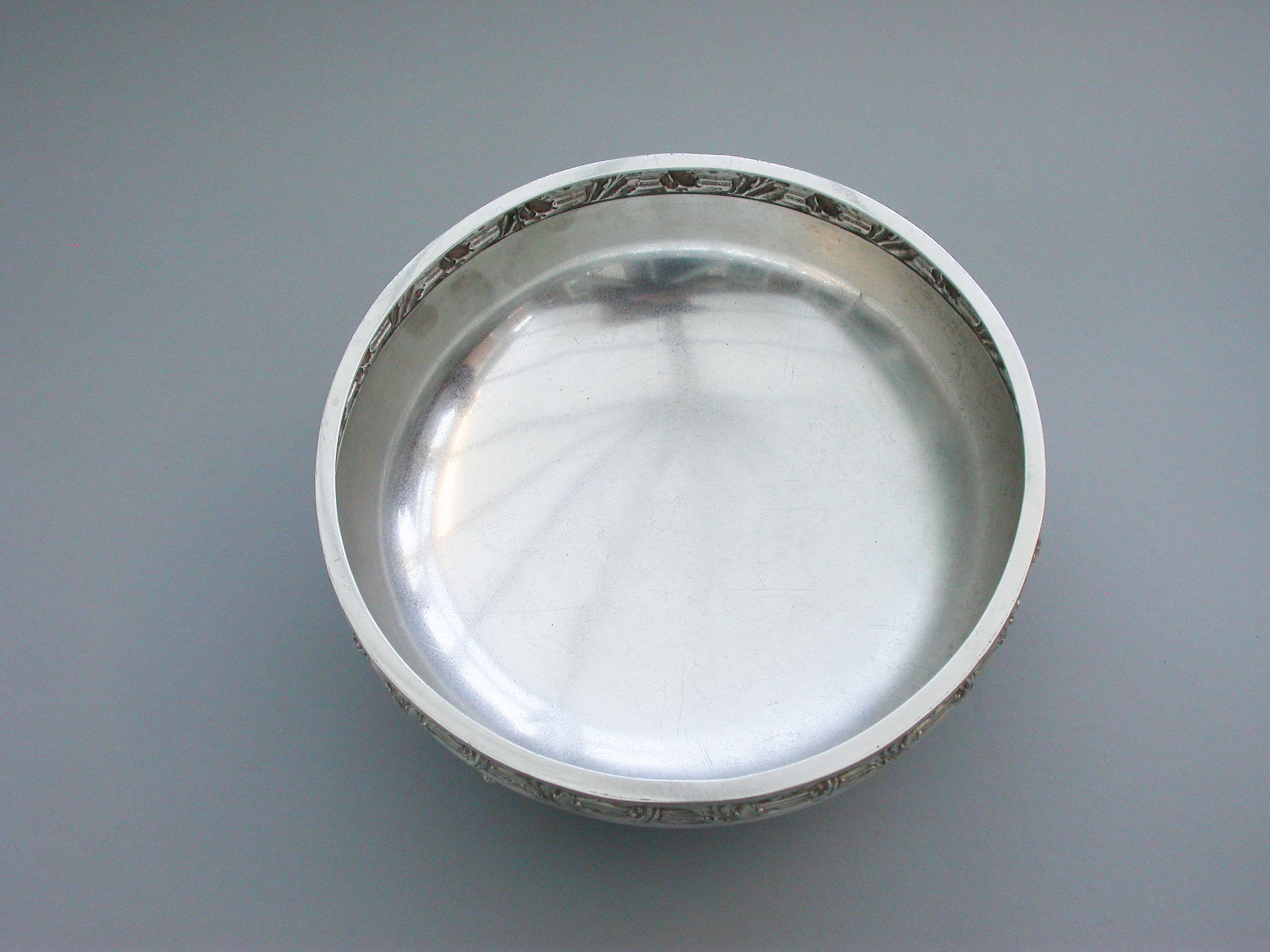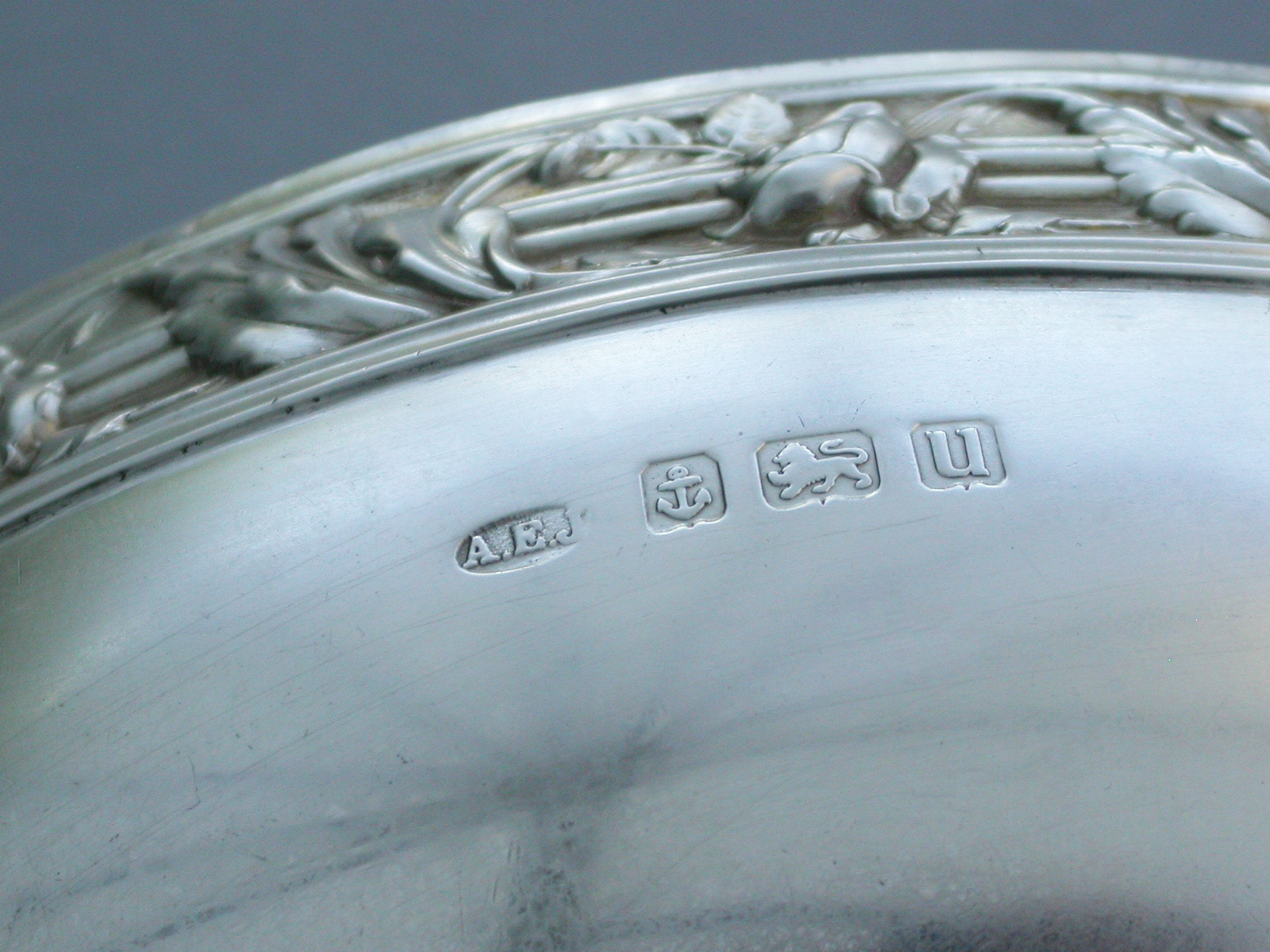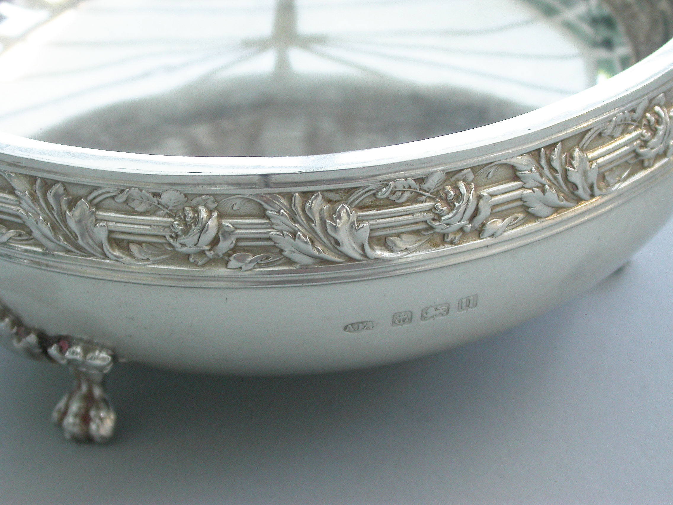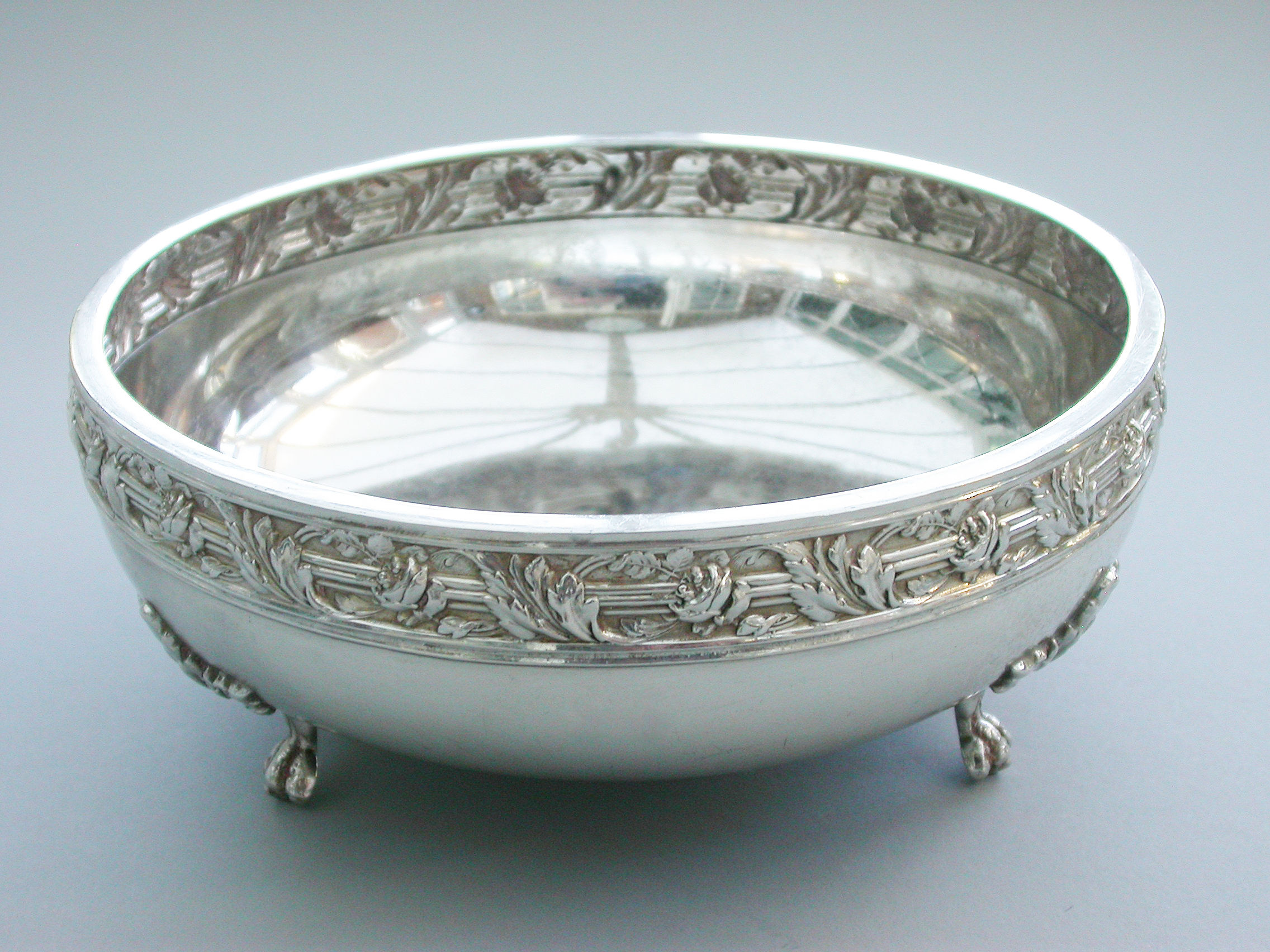 An early 20th century Arts & Crafts period silver Bowl of circular form with embossed band of trailing roses, standing on three paw feet with leaf supports.