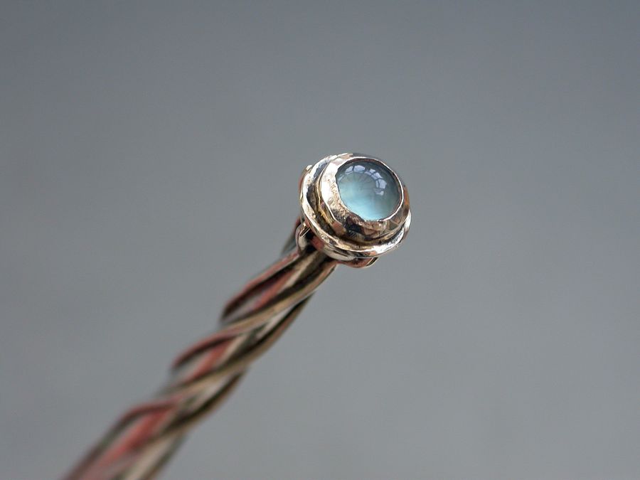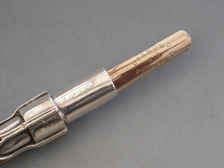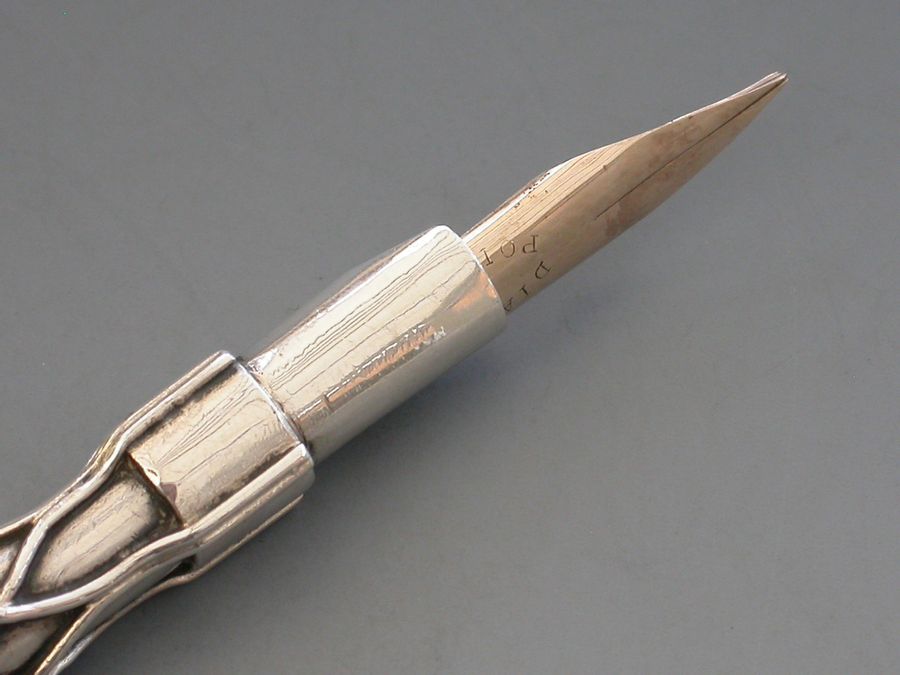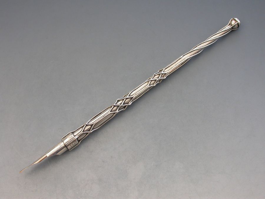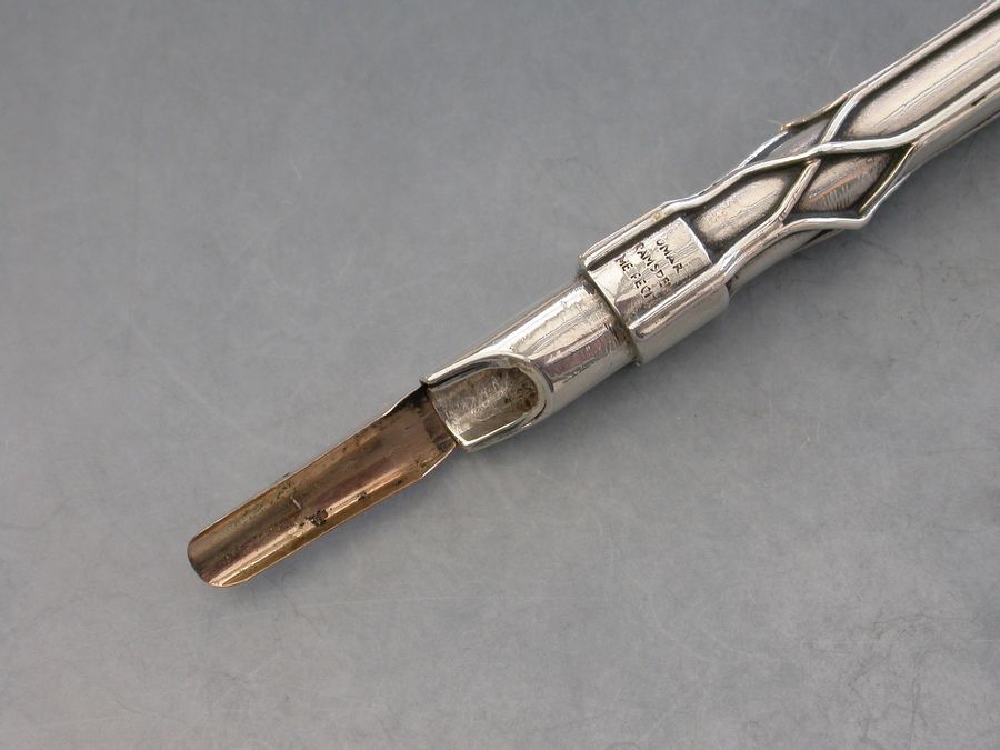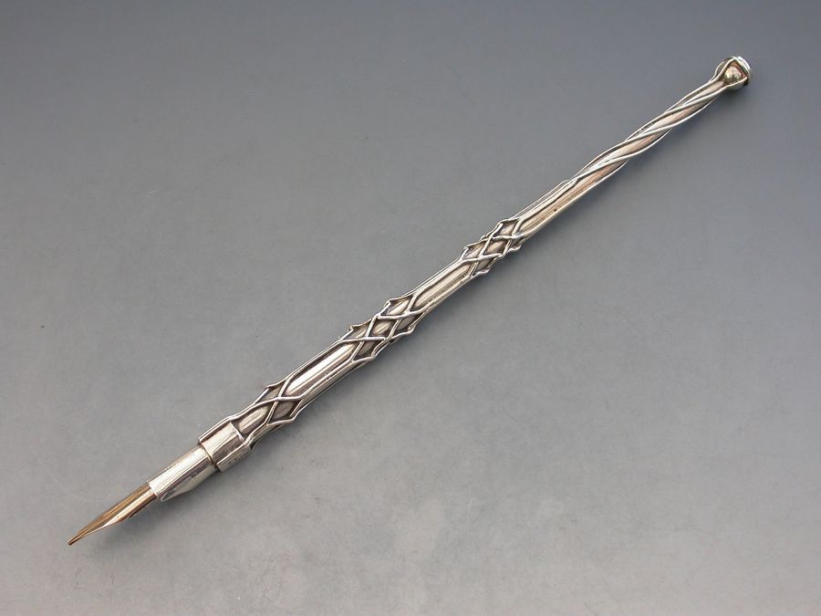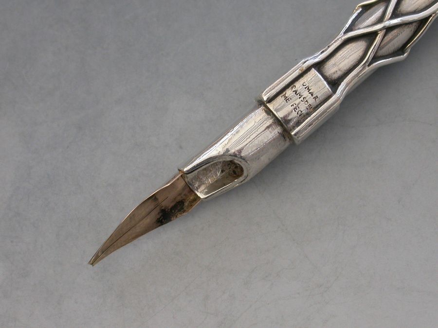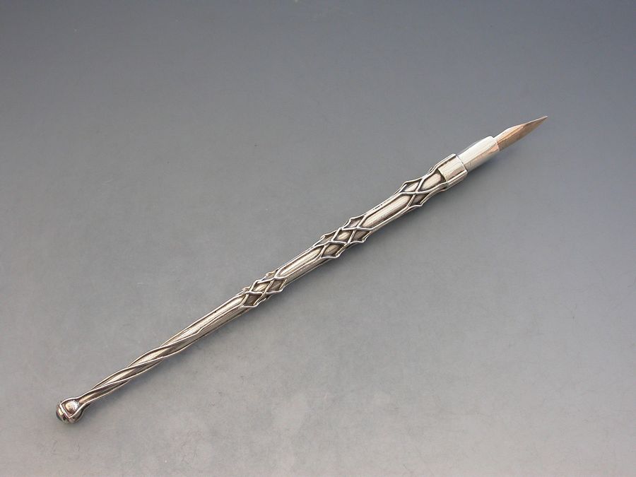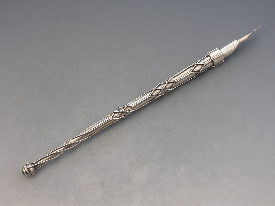 A rare early 20th century silver Dip Pen made in the Arts & Crafts style, the tapering stem applied with twisted wire cagework decoration, the terminal set with moonstone. Complete with a gold nib.