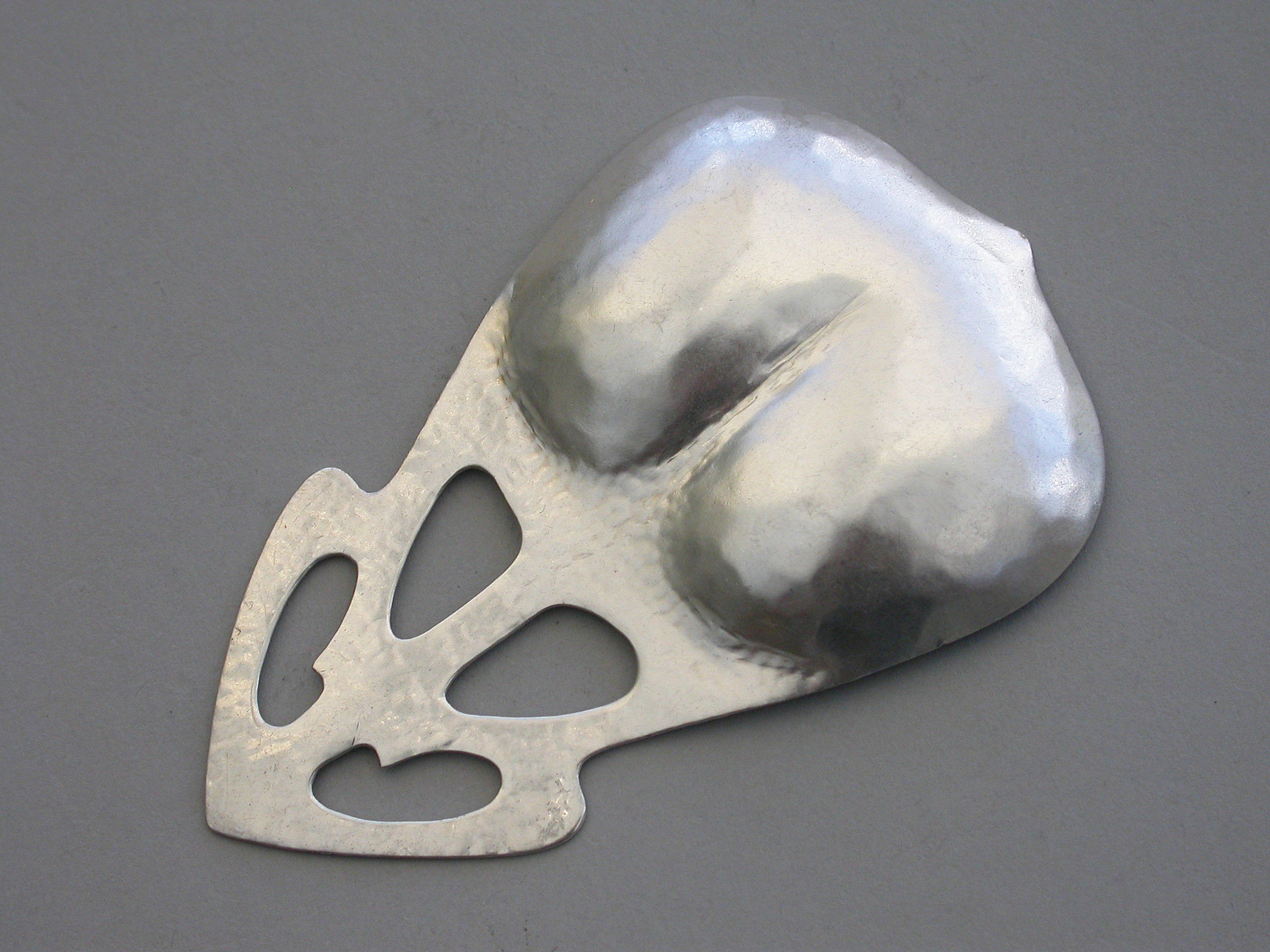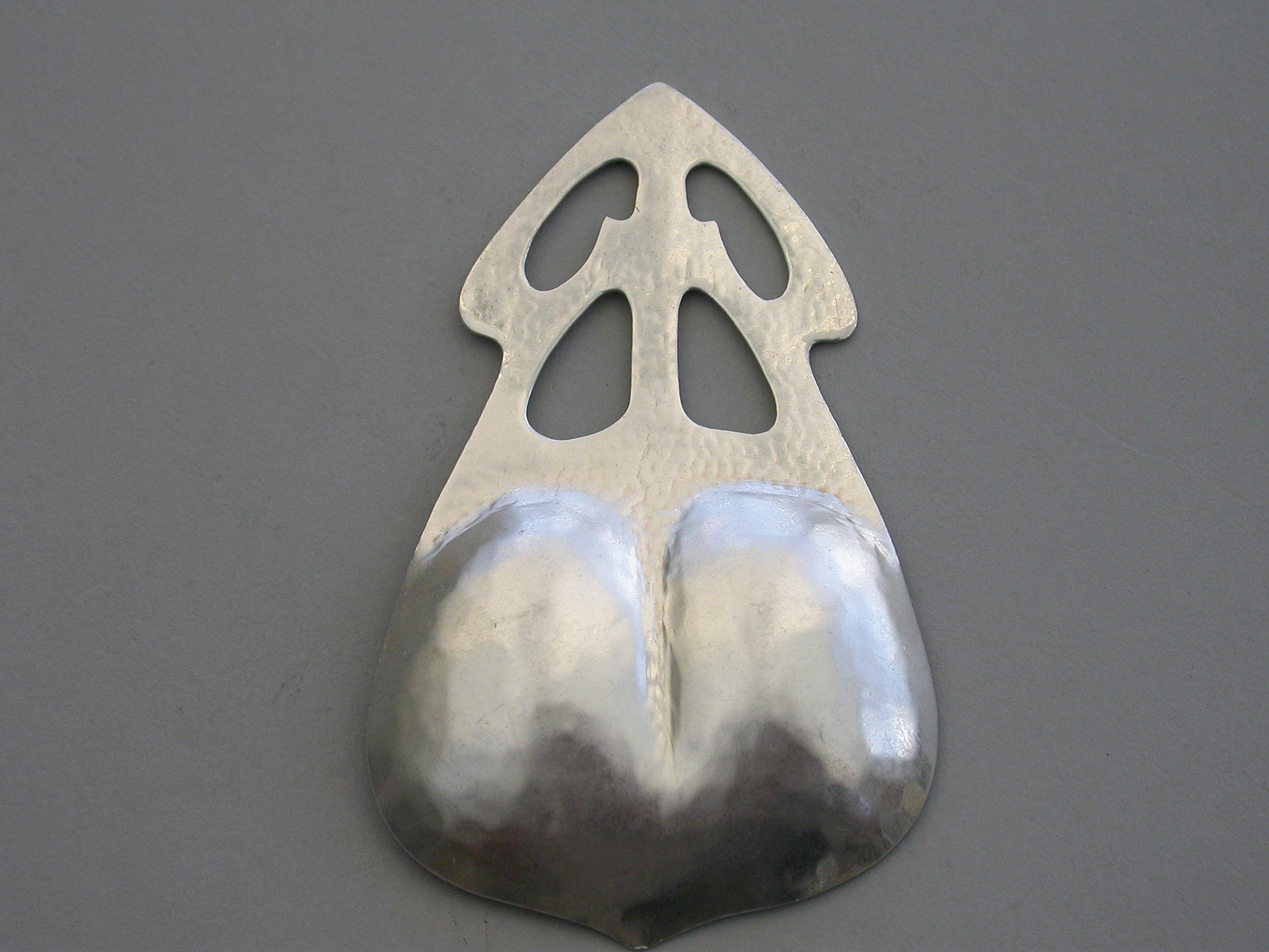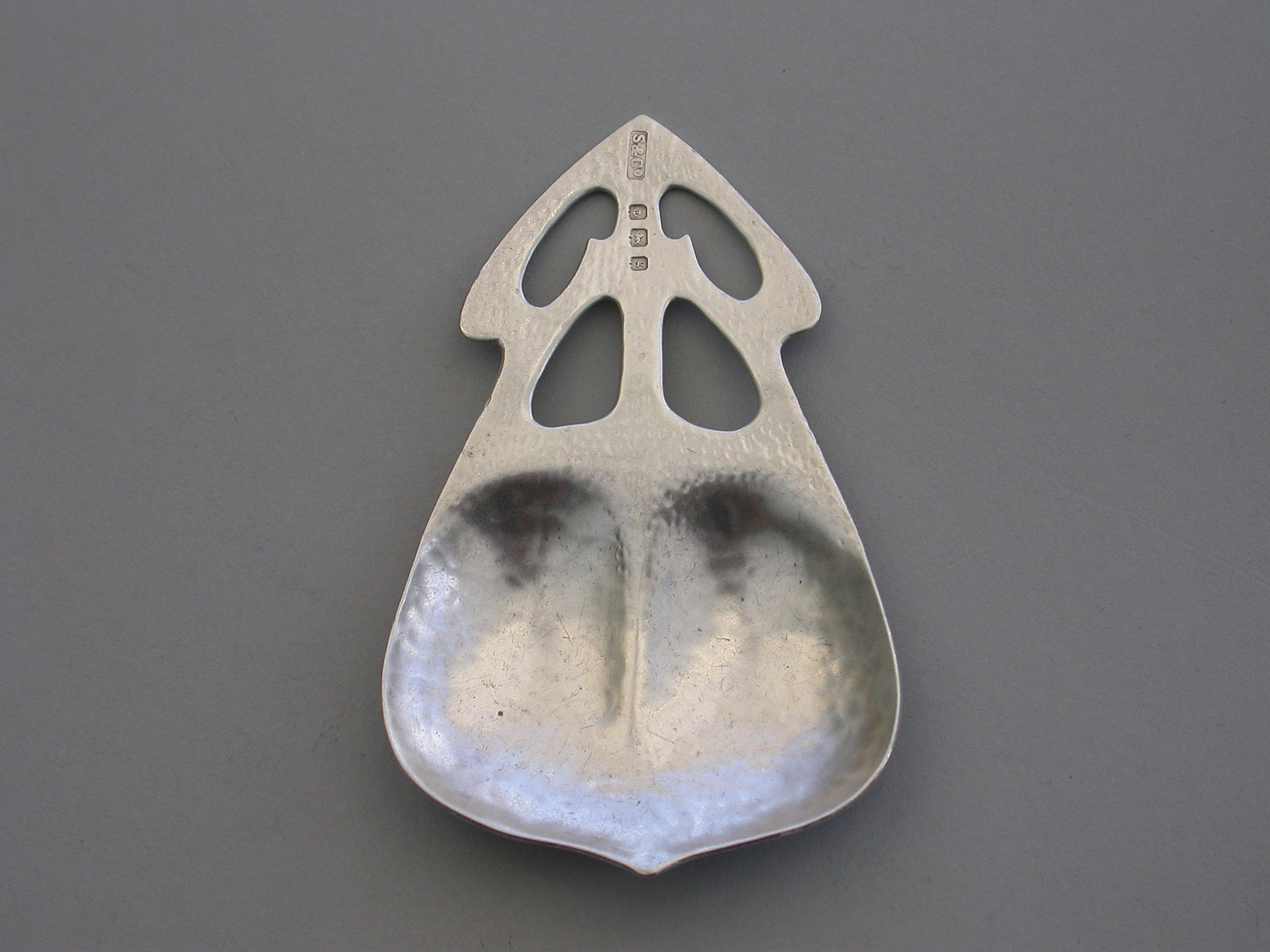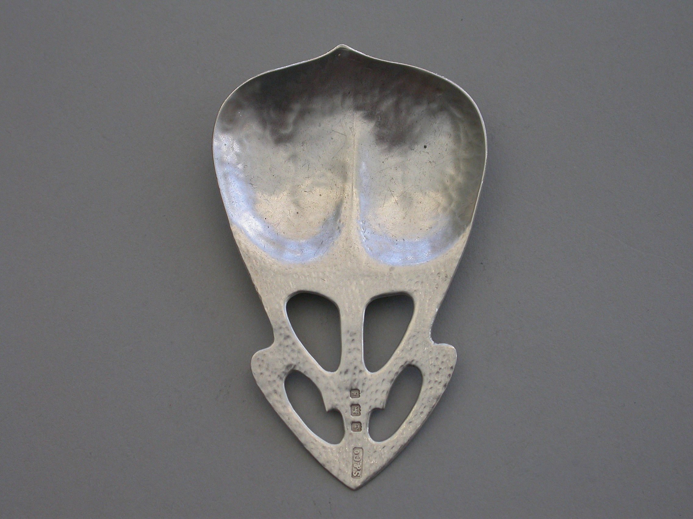 A rare early 20th century hammered silver Caddy Spoon made in the Arts & Crafts style with coco de mer shaped bowl and pierced arrowhead handle.
