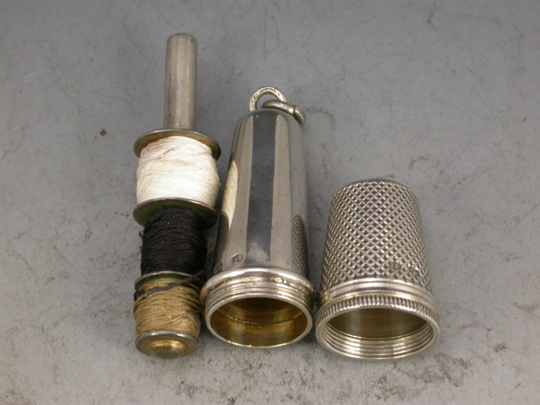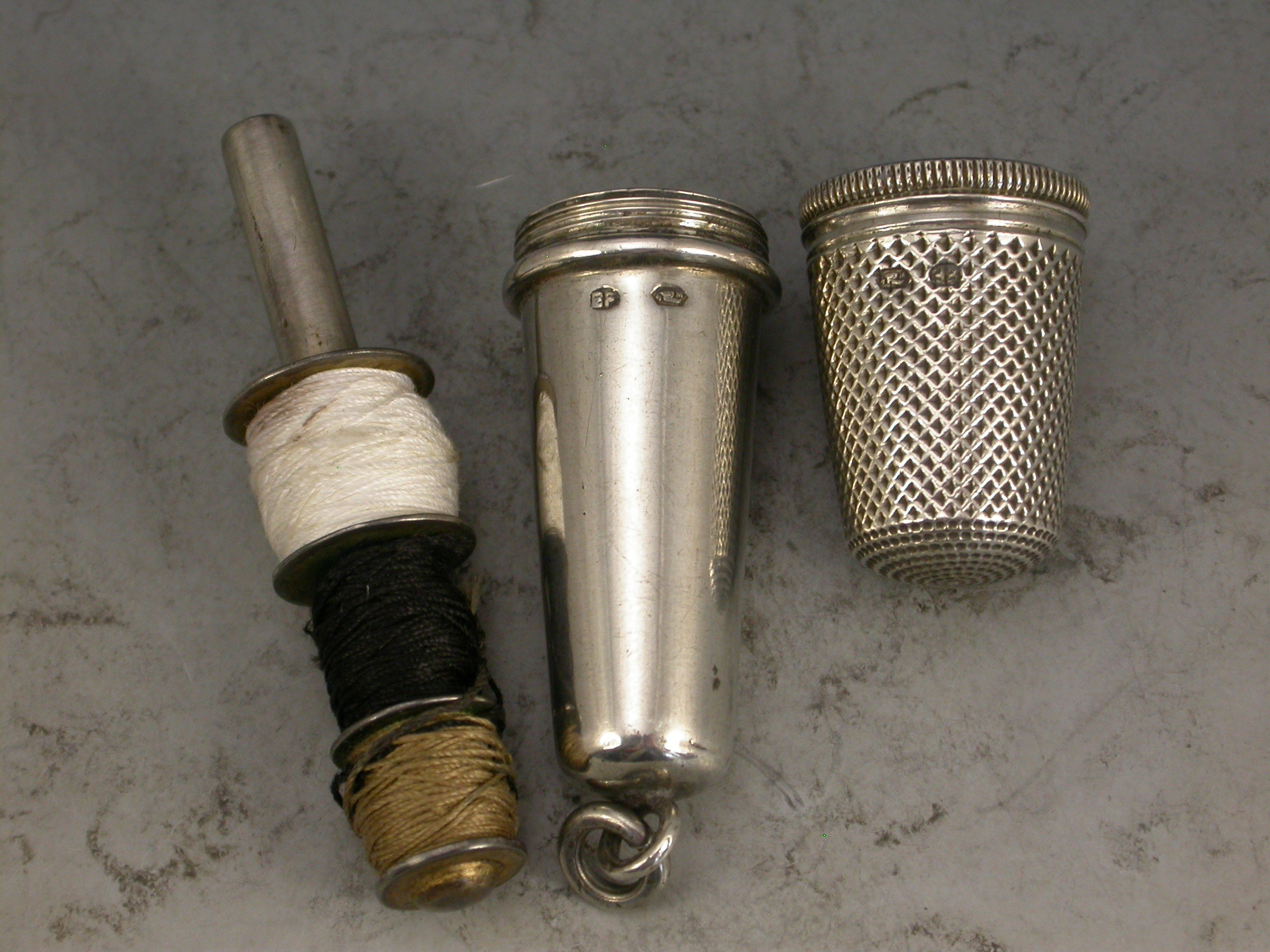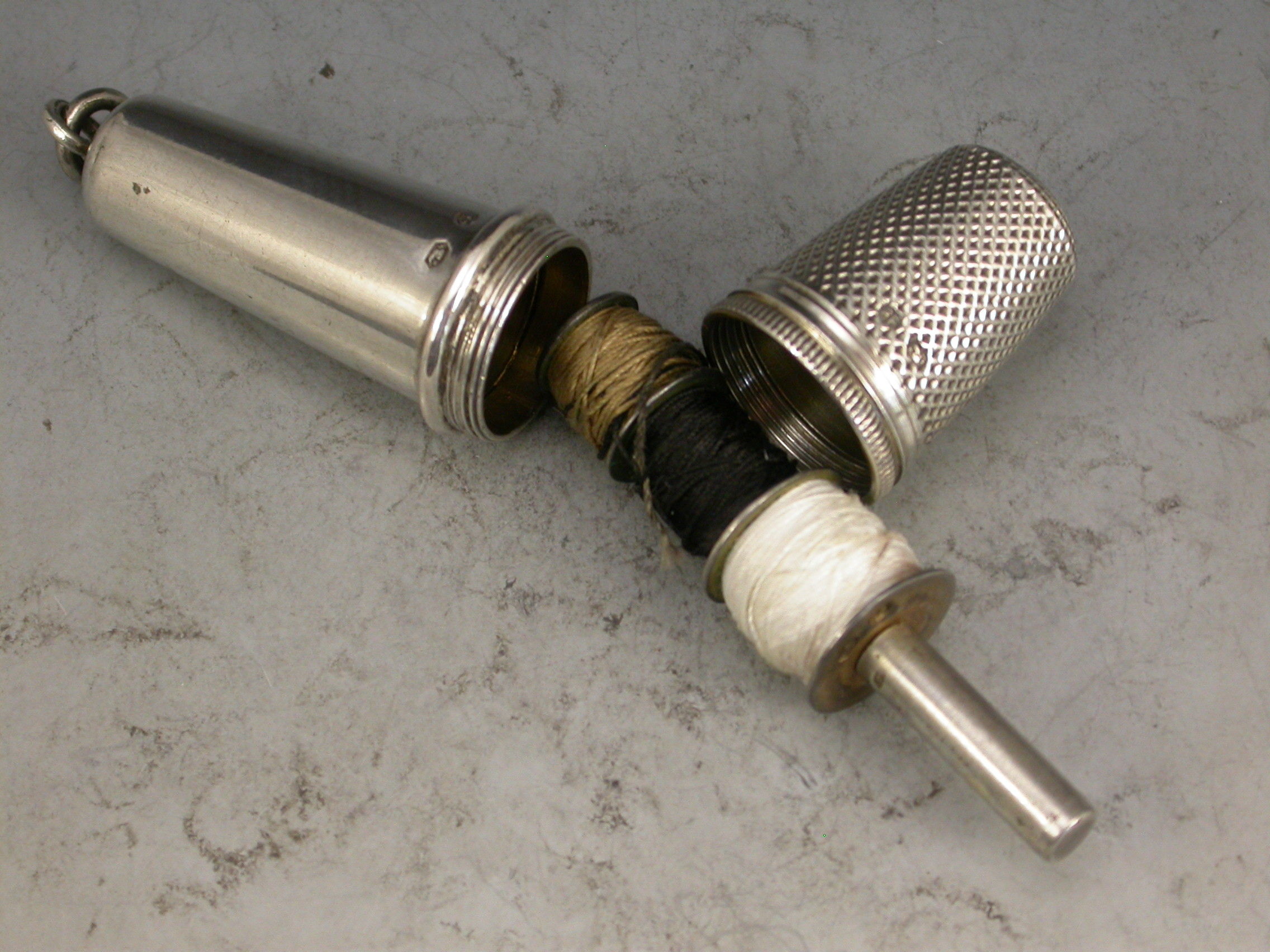 A good quality early 20th century Austrian silver Chatelaine Sewing Etui consisting of a Thimble, a needle case and cotton spools contained within a tapering silver case. Attached suspension ring.