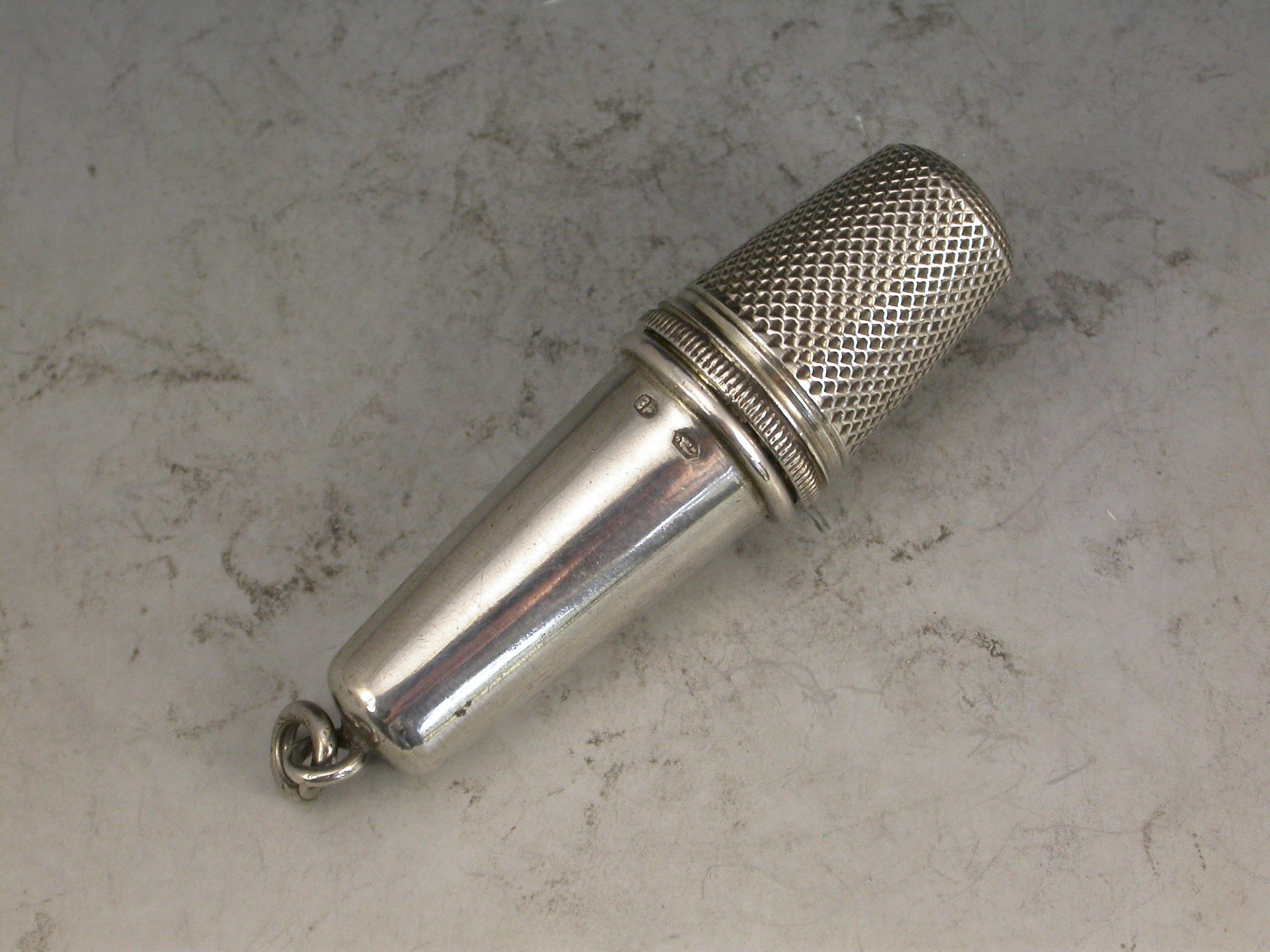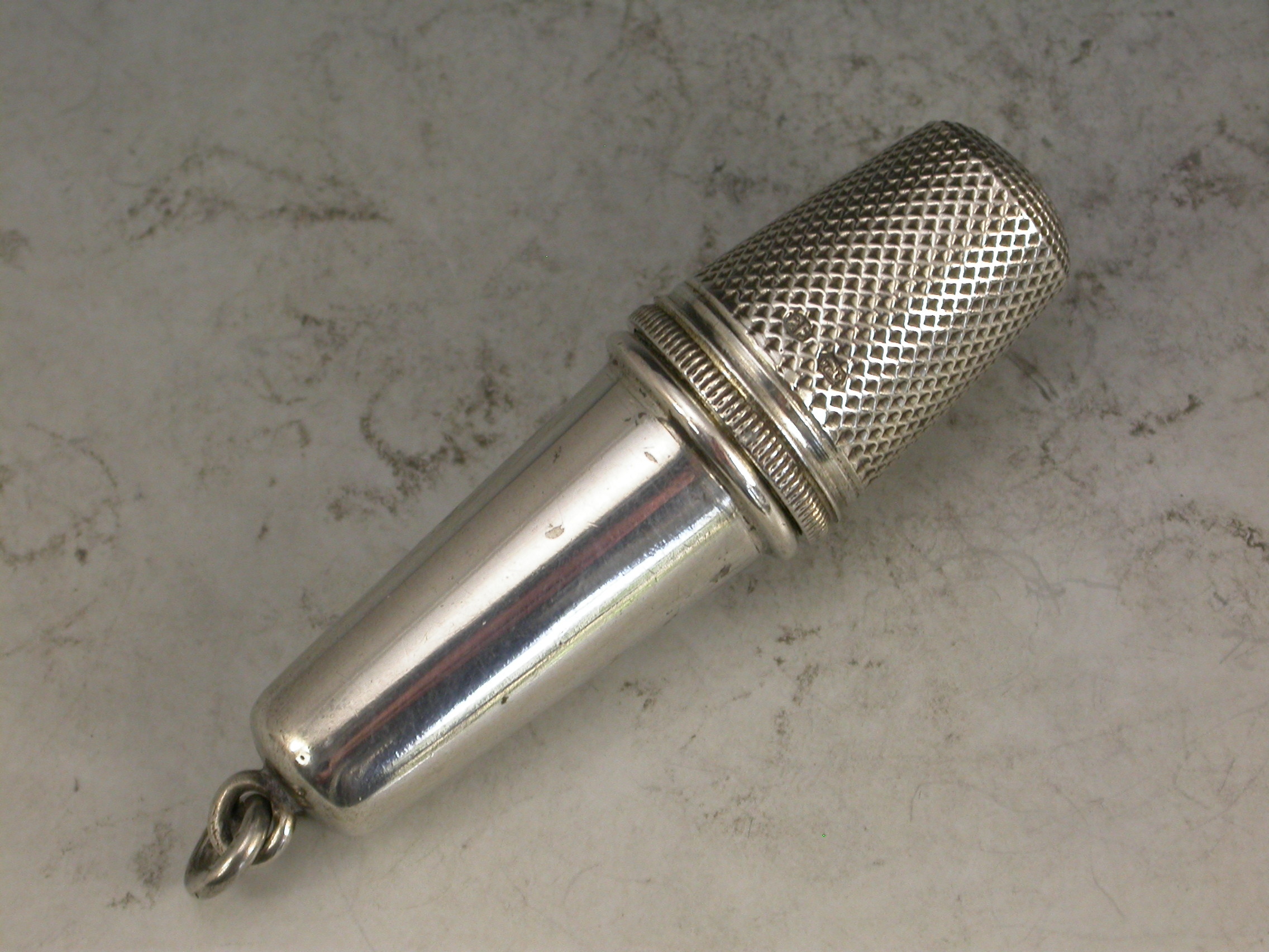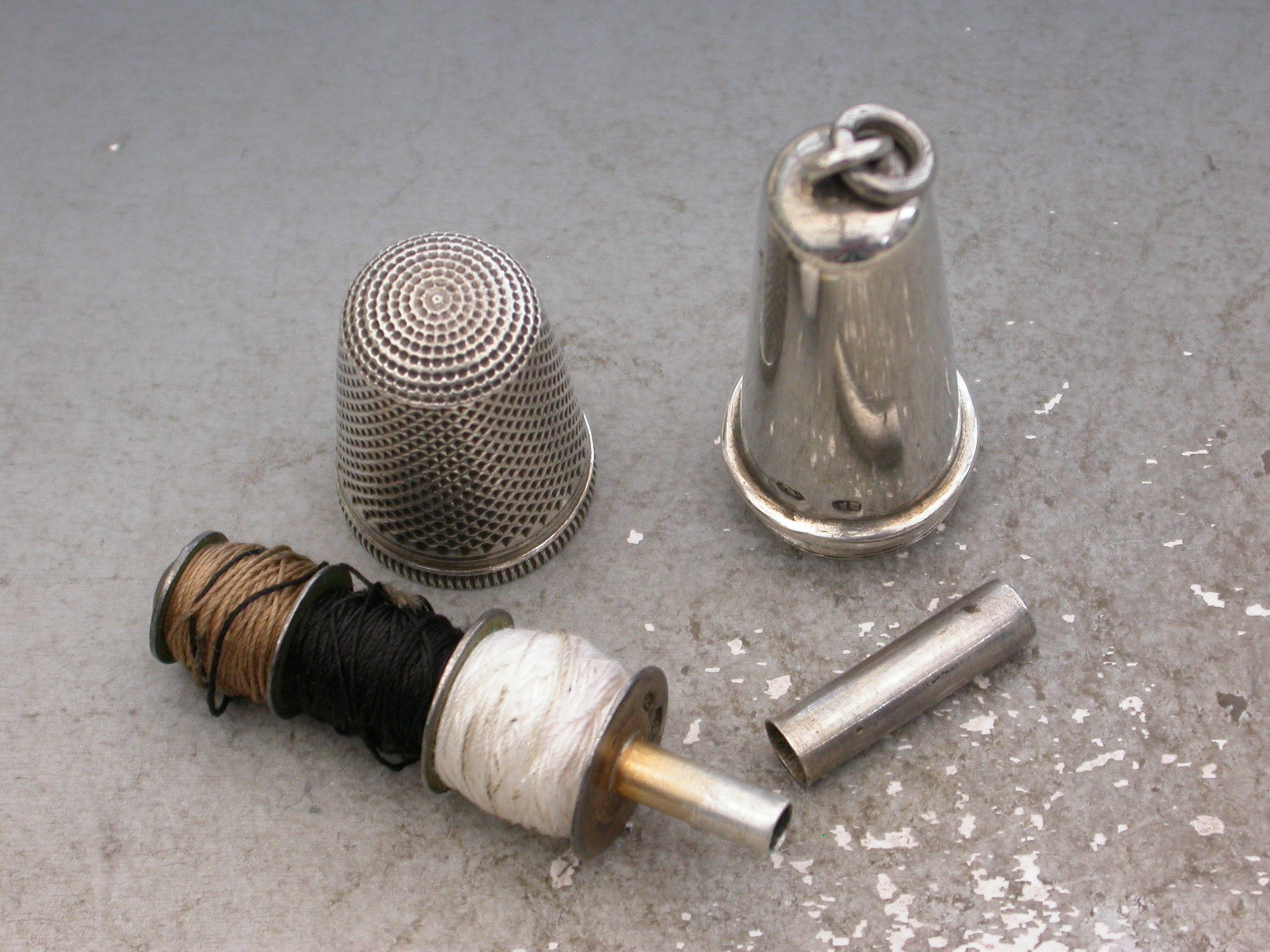 A good quality early 20th century Austrian silver Chatelaine Sewing Etui consisting of a Thimble, a needle case and cotton spools contained within a tapering silver case. Attached suspension ring.