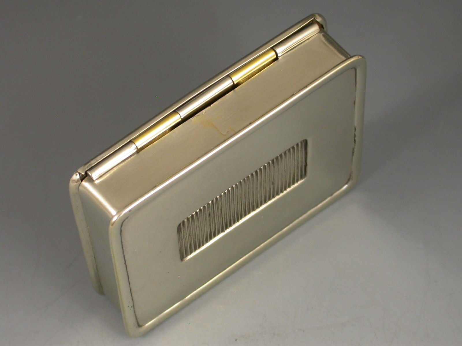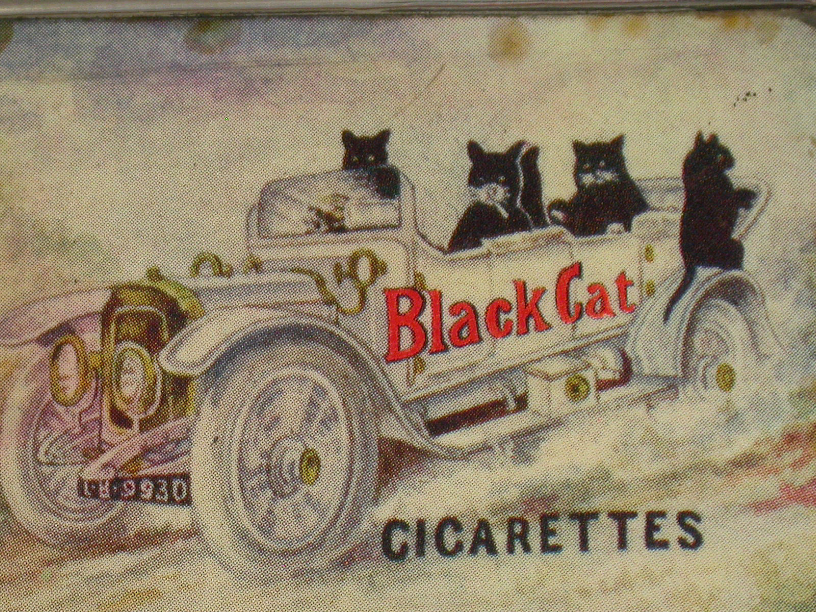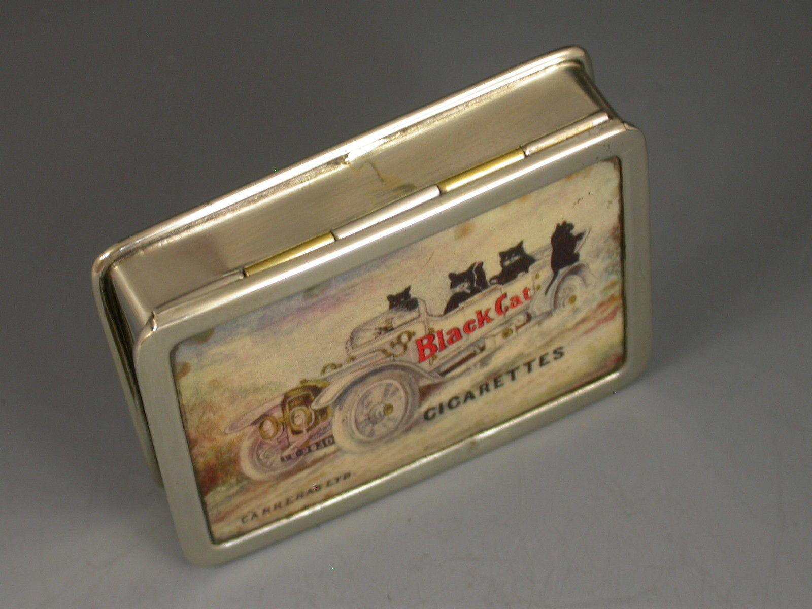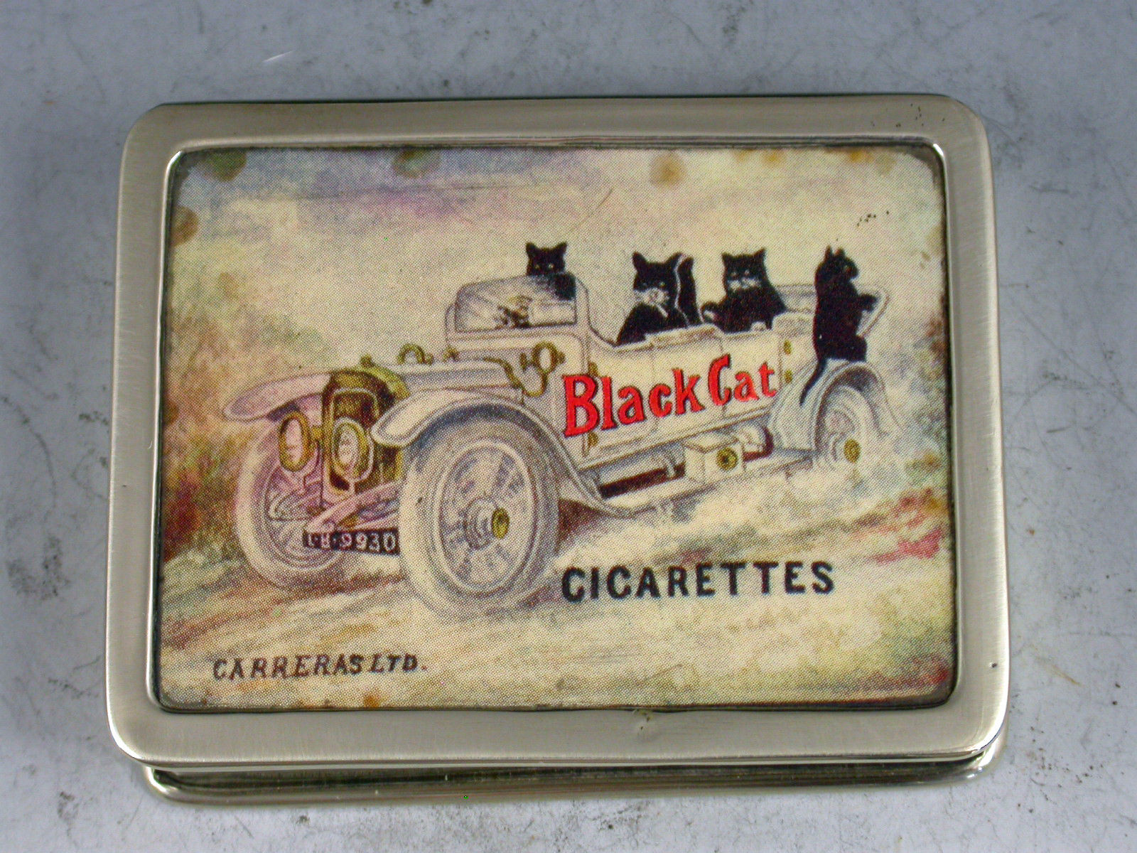 An early 20th century silver plated trick opening Carreras Cigarettes advertising Vesta Case with a celluloid panel to the lid depicting four black cats in a contemporary automobile, with gilded interior and striker to the base. The box has a patented trick opening mechanism that releases a catch when the central knuckle of the hinge is depressed.