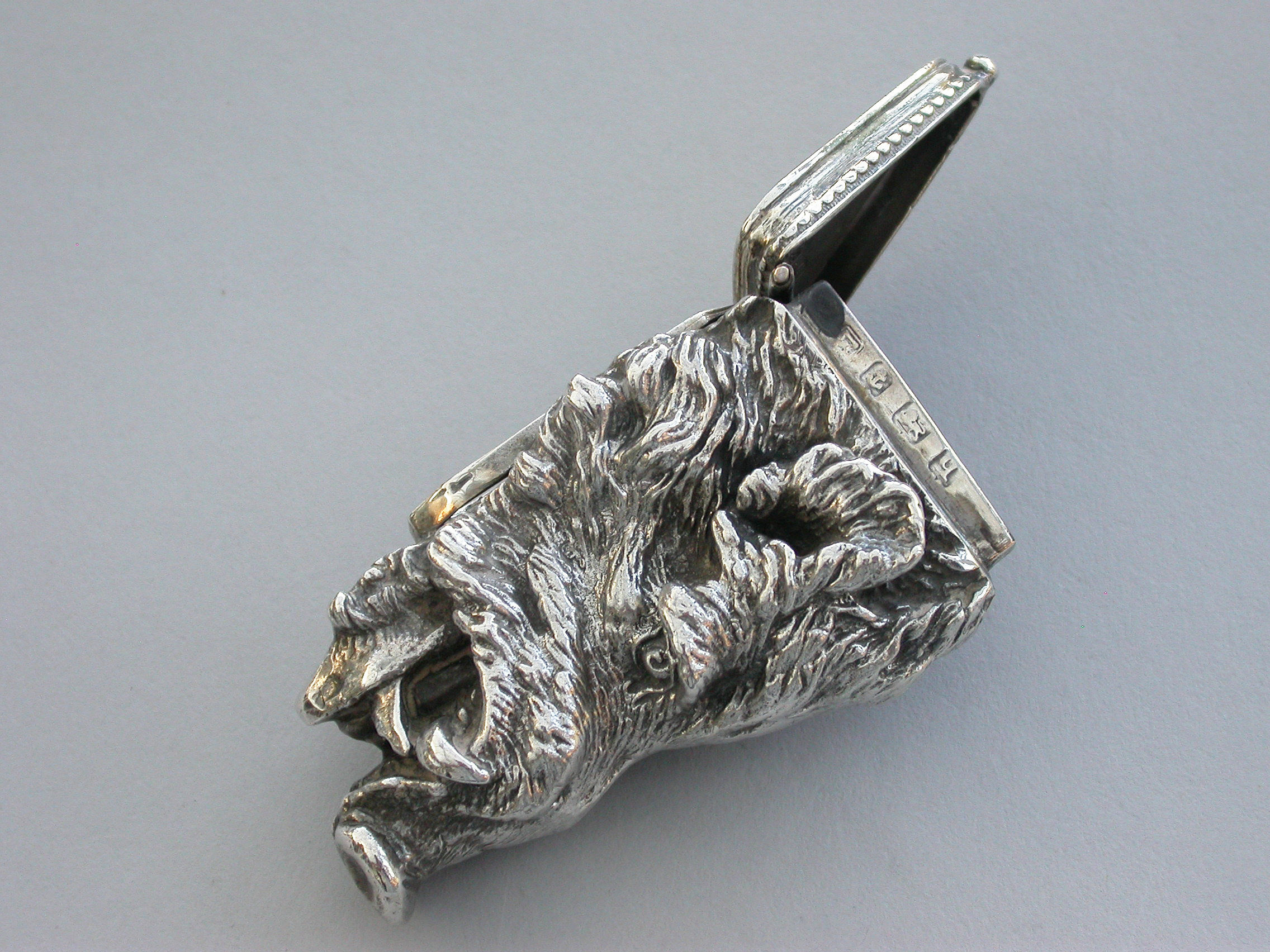 A rare and unusual early 20th century heavy cast silver Vesta Case made in the form of a wild boars head, the hinged lid engraved as the striker.