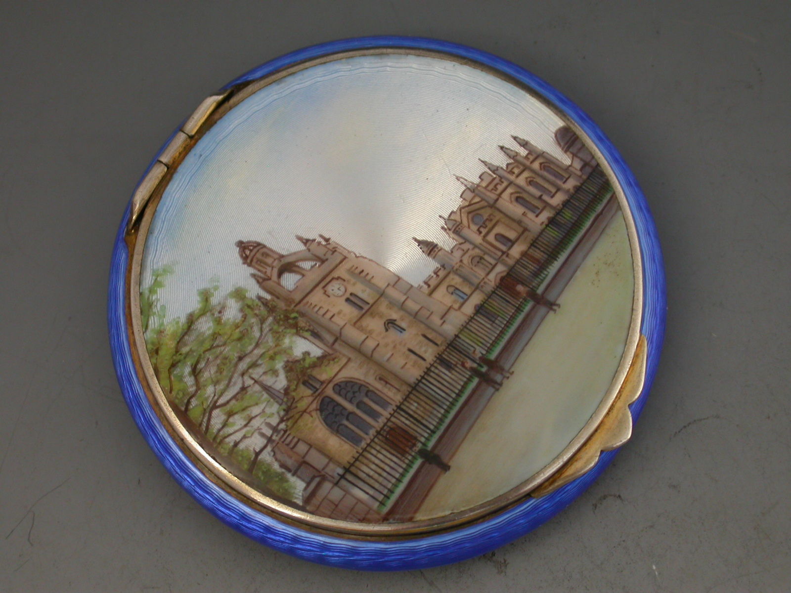 A rare and unusual early 20th century silver gilt and guilloche enamel Compact of circular form, the base with striking blue guilloche design, the lid decorated with a view of Kings College University in Aberdeen, Scotland. The silver gilt interior with powder compartment with revolving cover and a mirror to the interior lid.