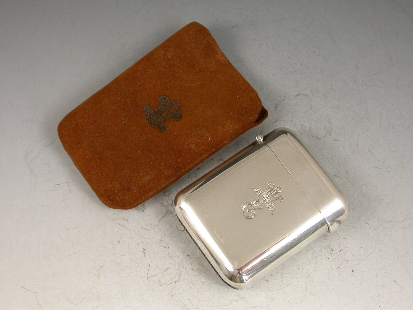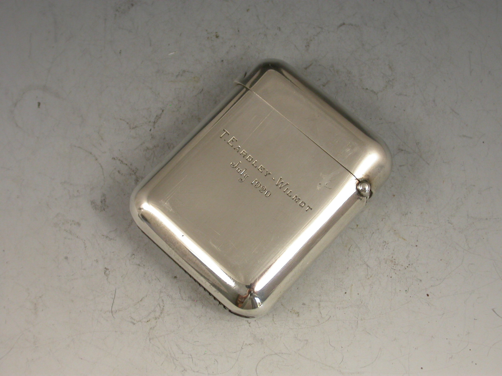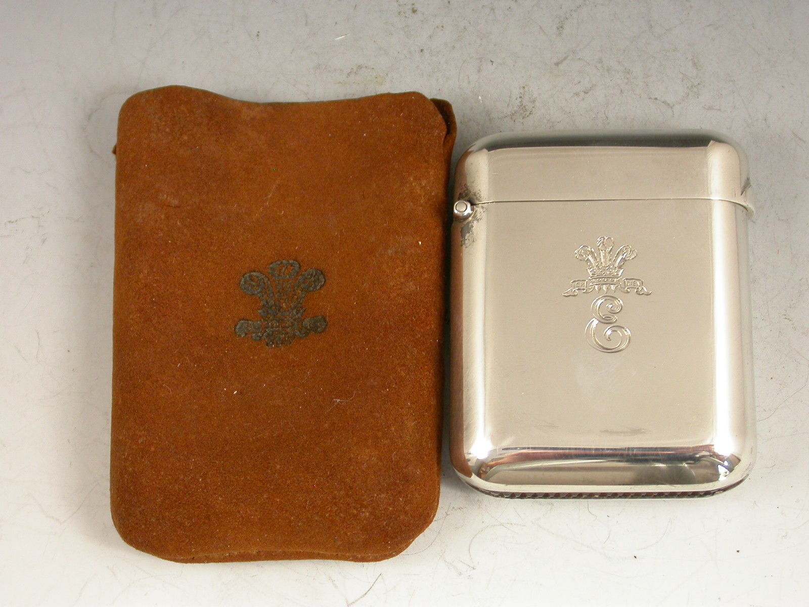 A fine quality early 20th century silver Vesta Case complete with original leather pouch, the case of rounded rectangular form with hinged flip top lid and silver gilt interior, engraved to the front with the cypher of Edward Prince of Wales (the POW feathers above the initial letter E) and inscribed on the reverse; ""T. Eardley-Wilmot July 1920"".