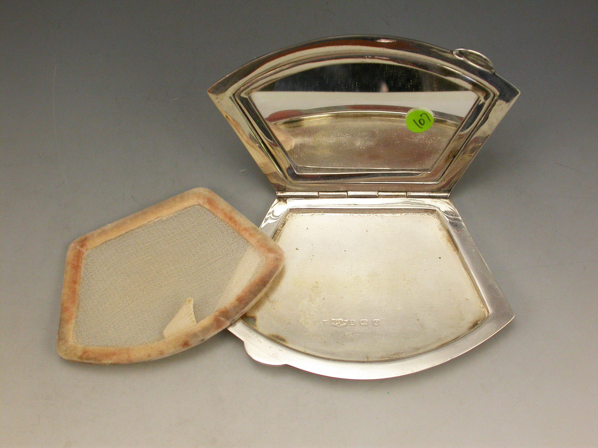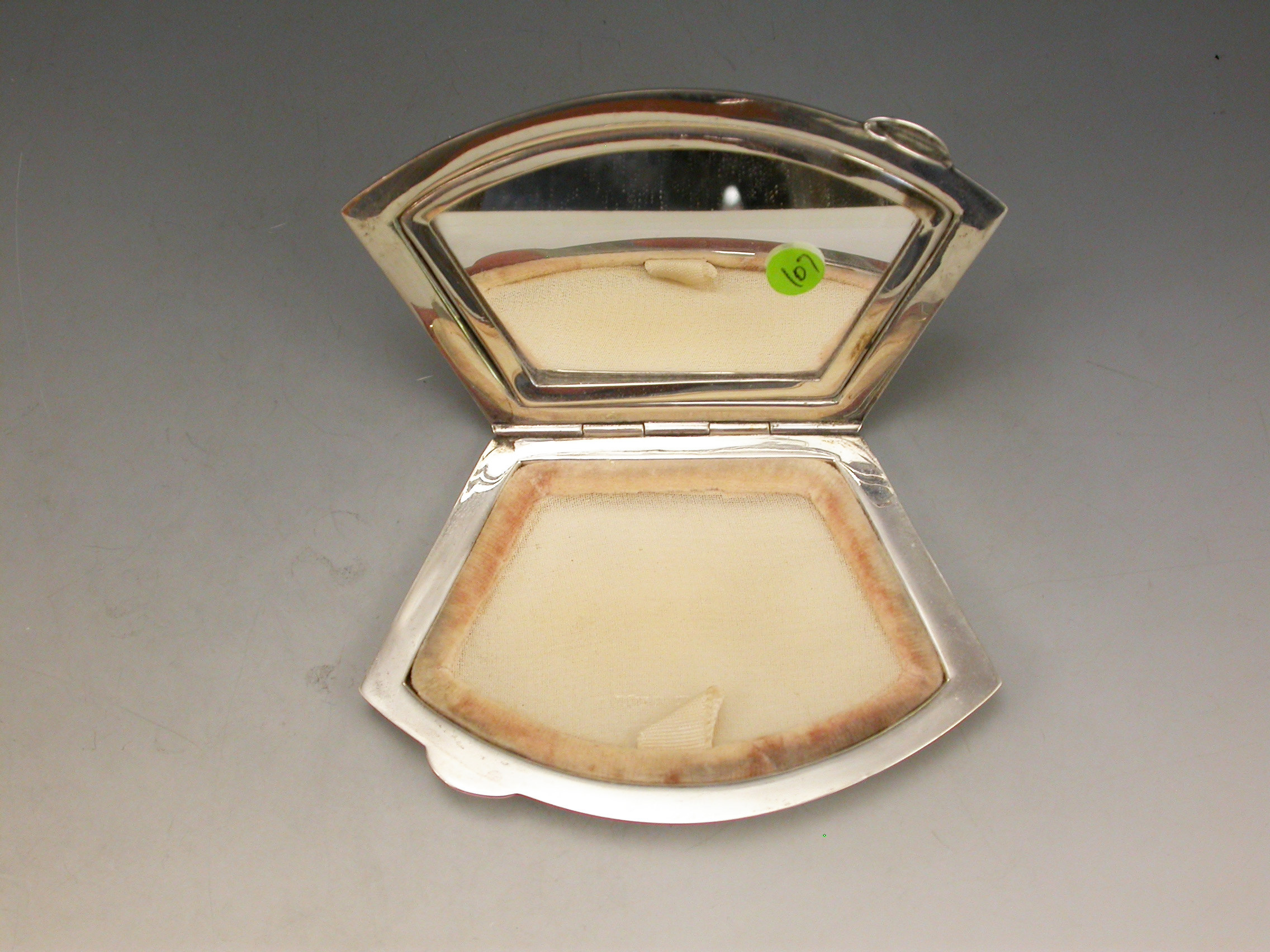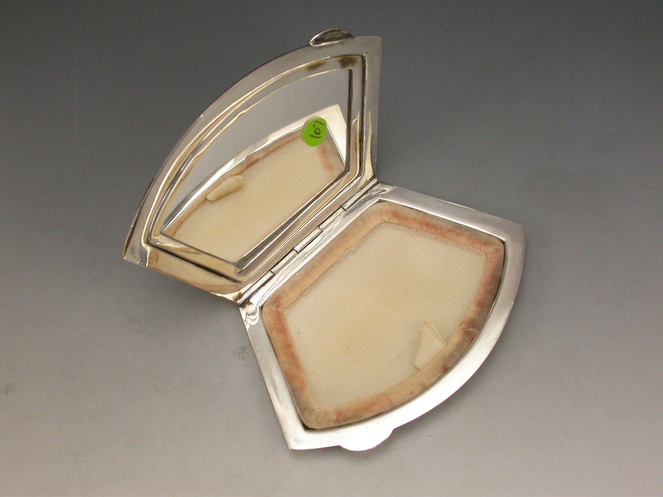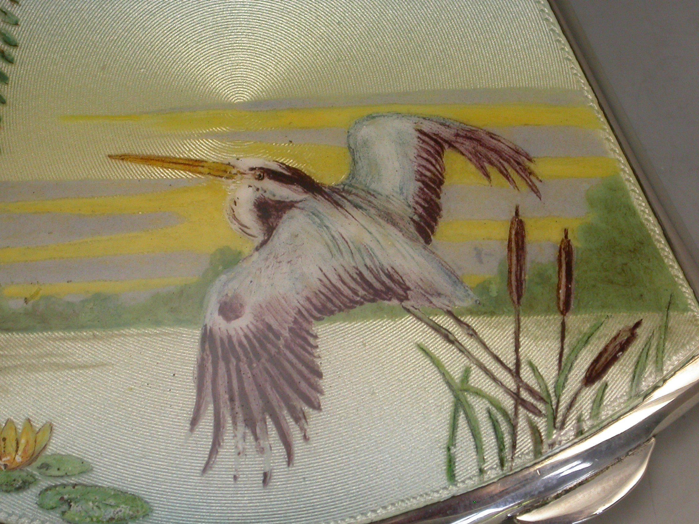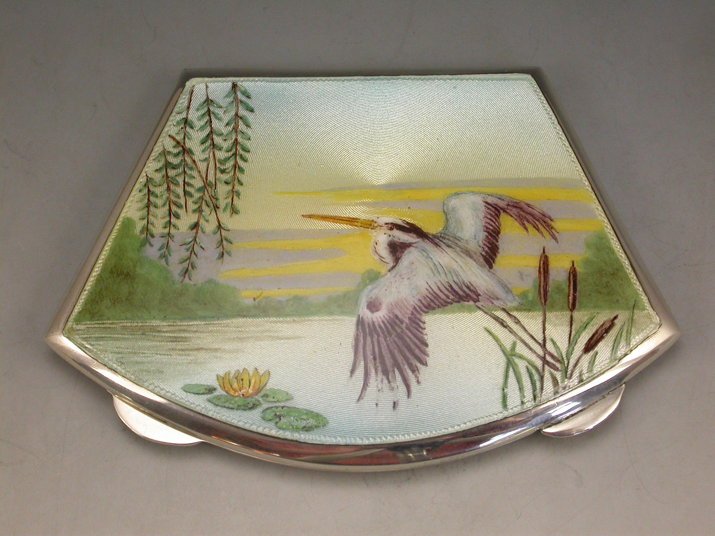 A good quality early 20th century silver and enamel fan shaped Compact, the cover decorated with an enamelled scene depicting a Heron flying over a lake. The interior with mirror and powder compartment.