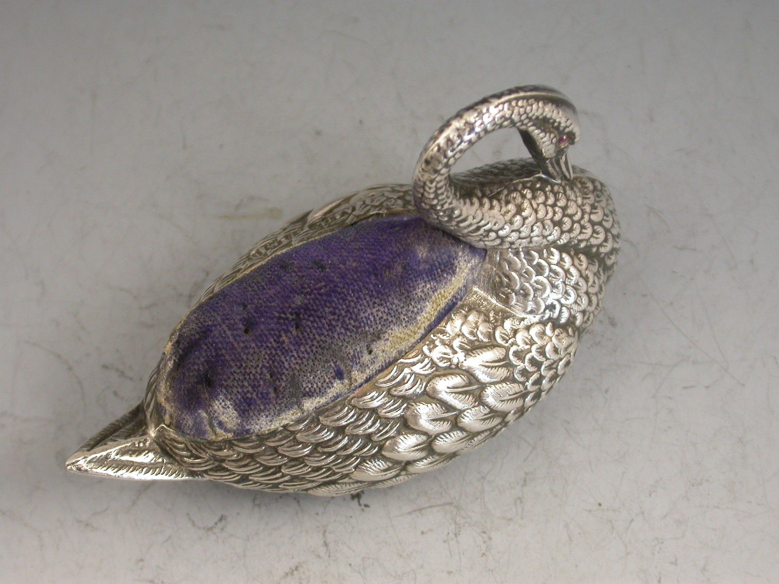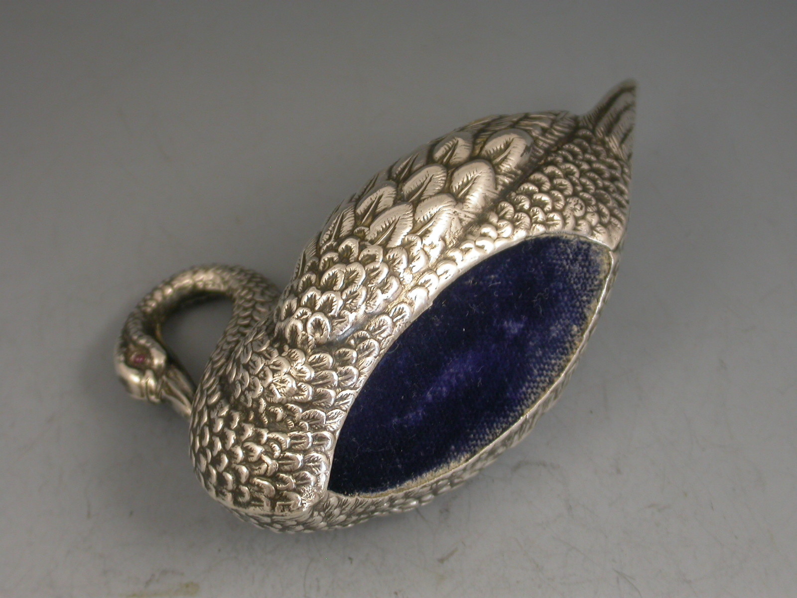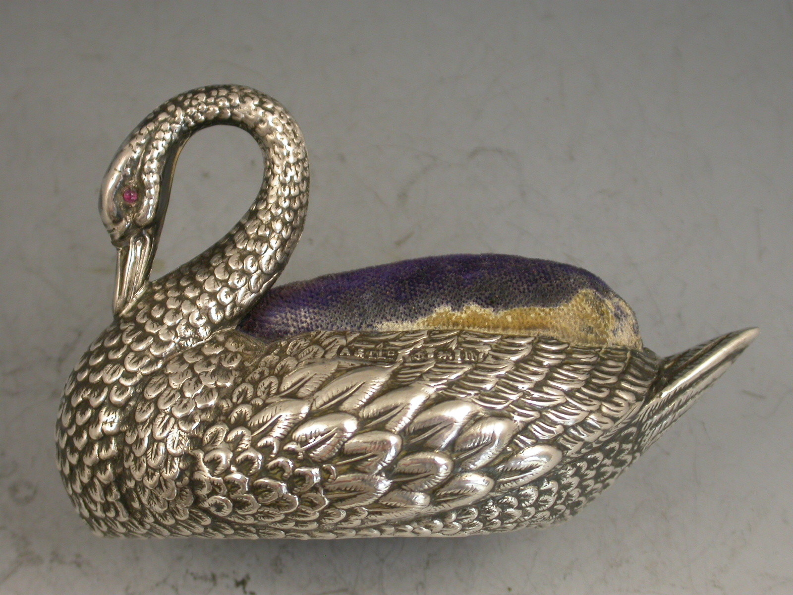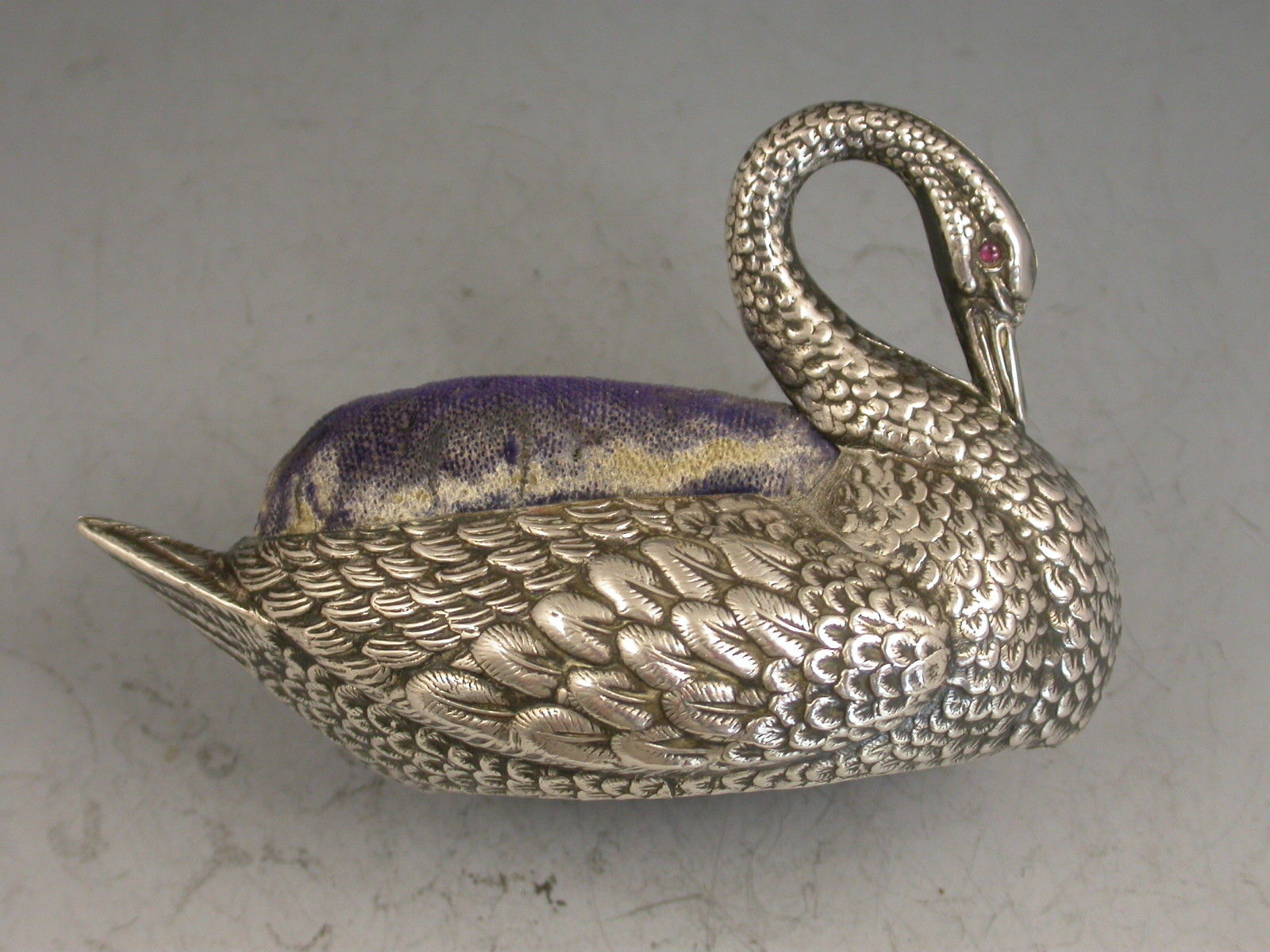 A good early 20th century novelty silver Pin Cushion, made in the form of a Swan with ruby red glass eyes and original blue velvet cushion.