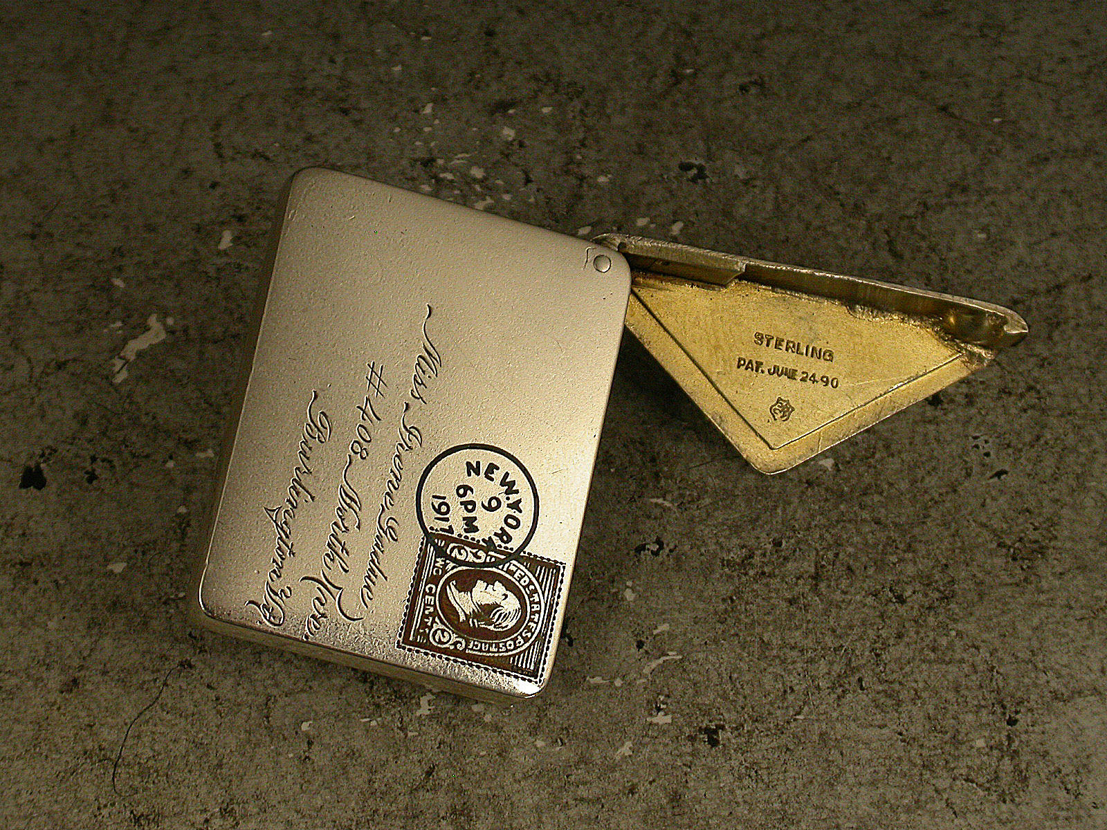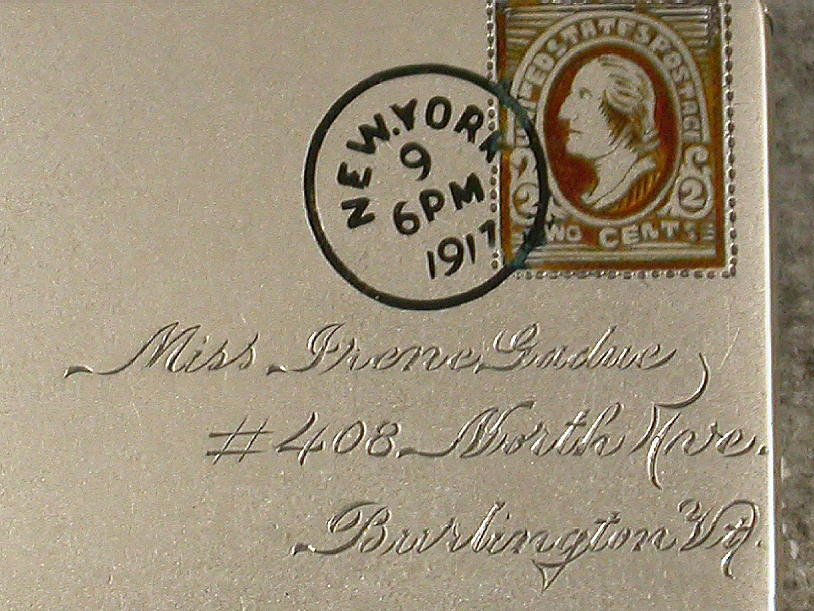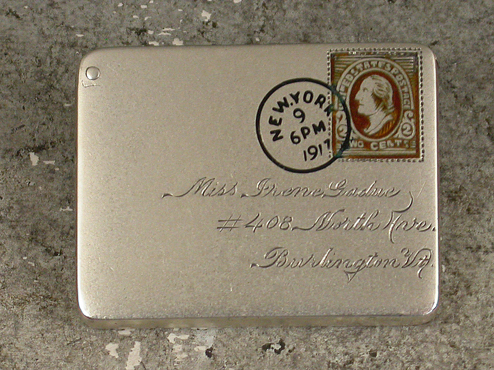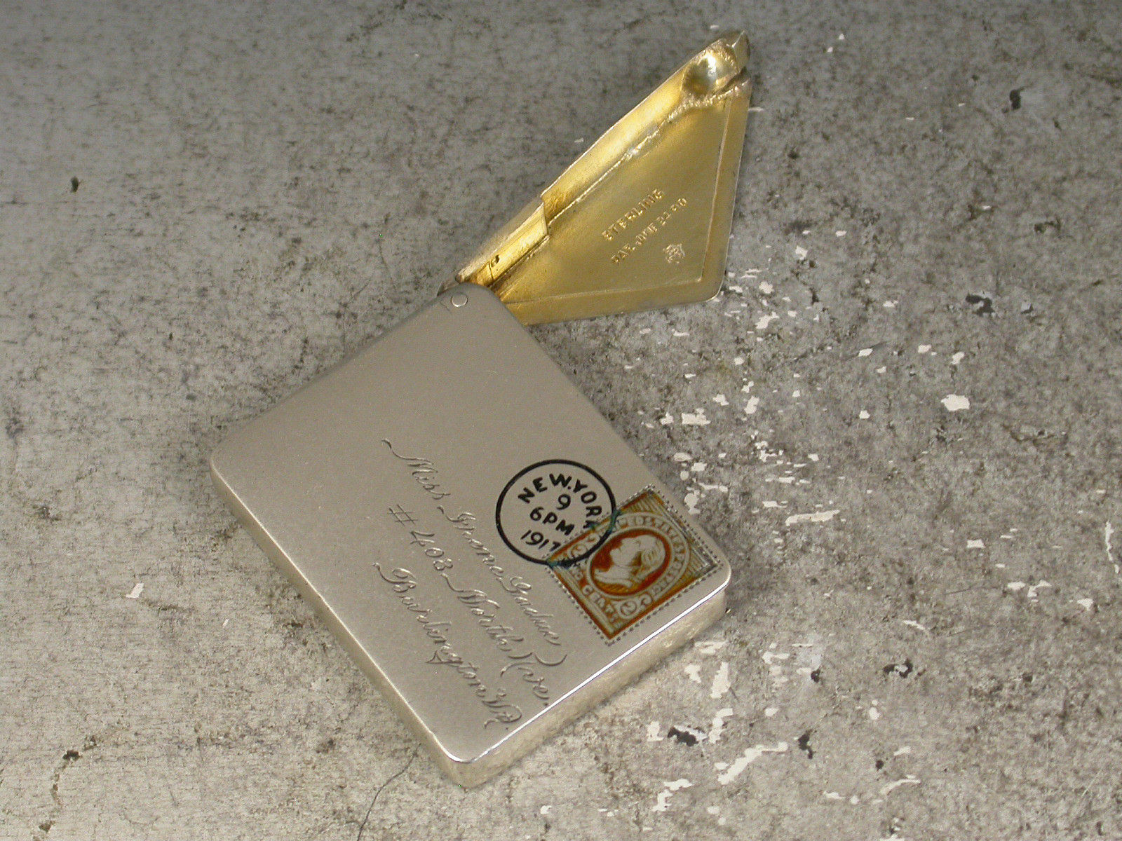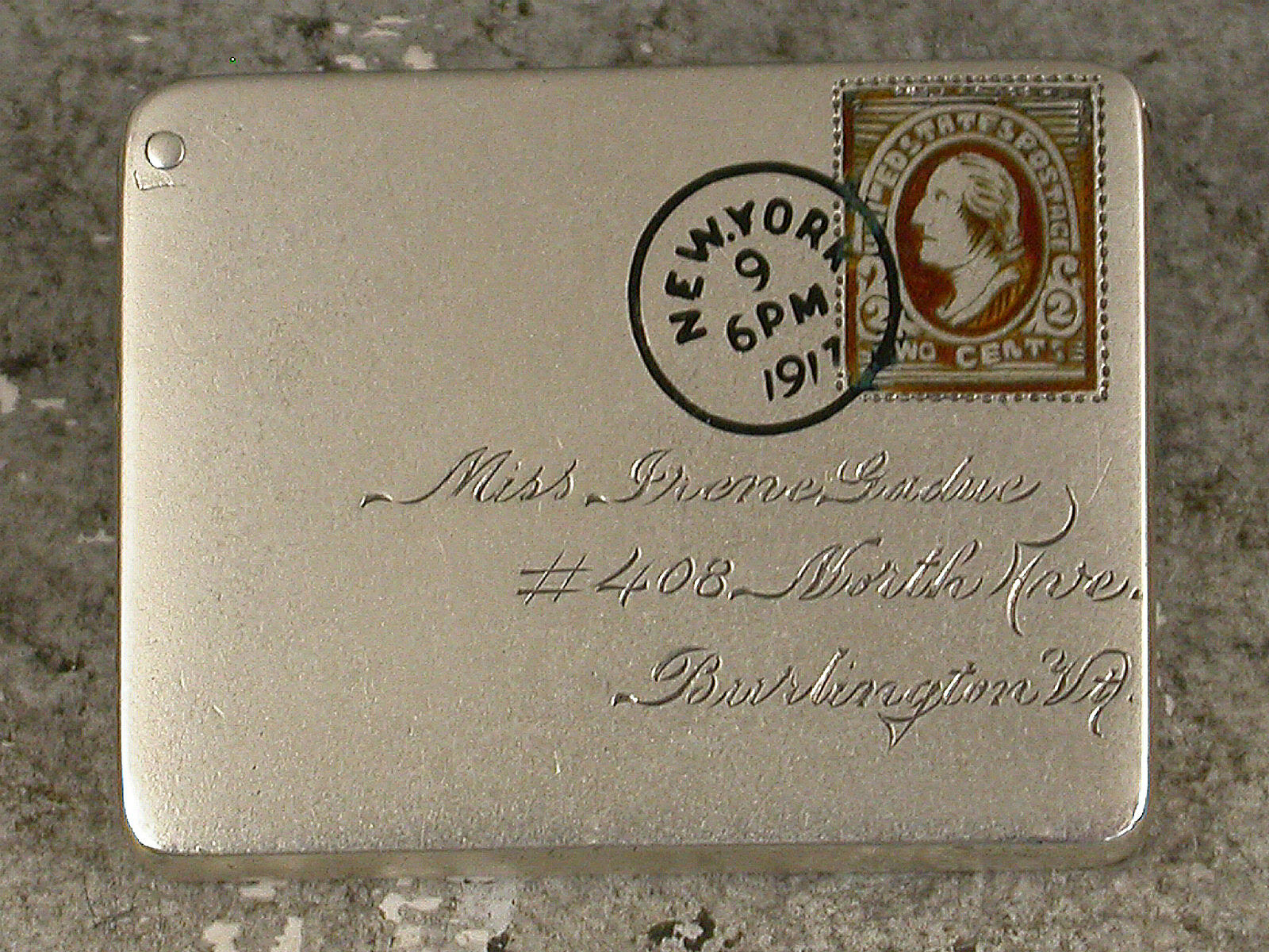 A very fine early 20th century patented American sterling silver and enamel novelty Stamp Case made in the form of an Envelope. The front enamelled with a 2 cents stamp and a New York cancellation mark for 1917, the reverse enamelled with a received mark for 9.14.17, the cover engraved with a name and address for Miss Irene Gadue, No 408 North Ave, Burlington Vt. The silver gilt interior stamped with a makers mark, Sterling and the Patent mark for June 24 90.