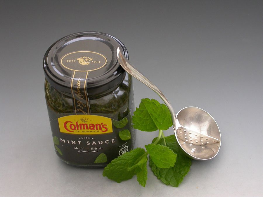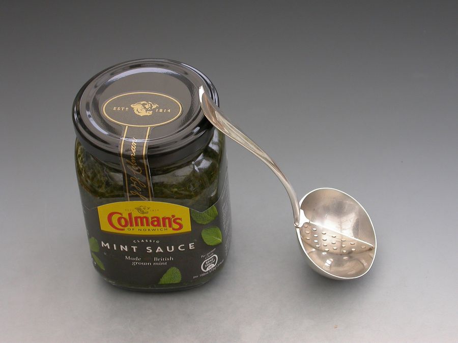 An unusual early 20th century patented silver Mint Sauce Ladle, the bowl divided by a pierced strainer, ribbed Hanoverian pattern handle.