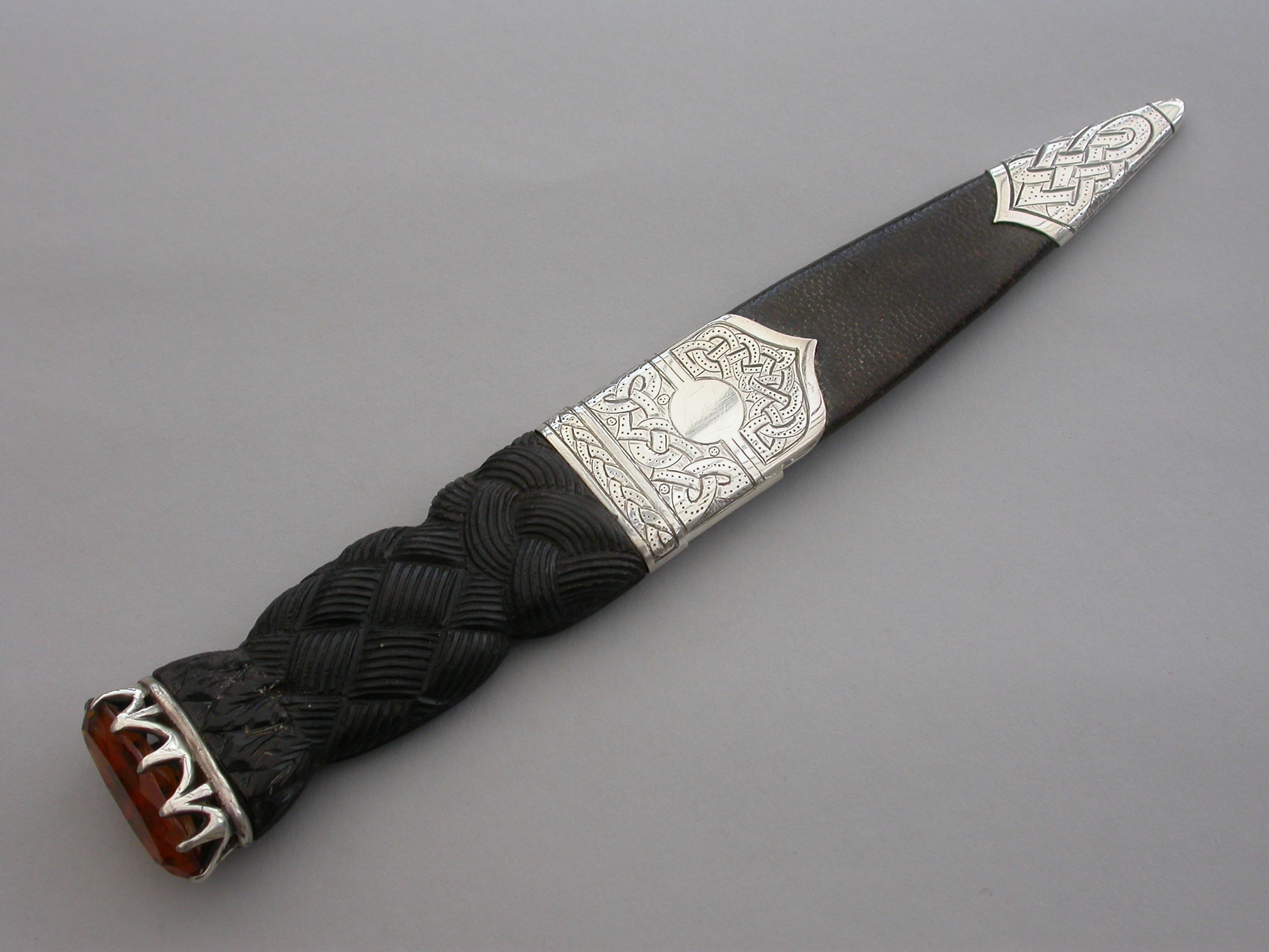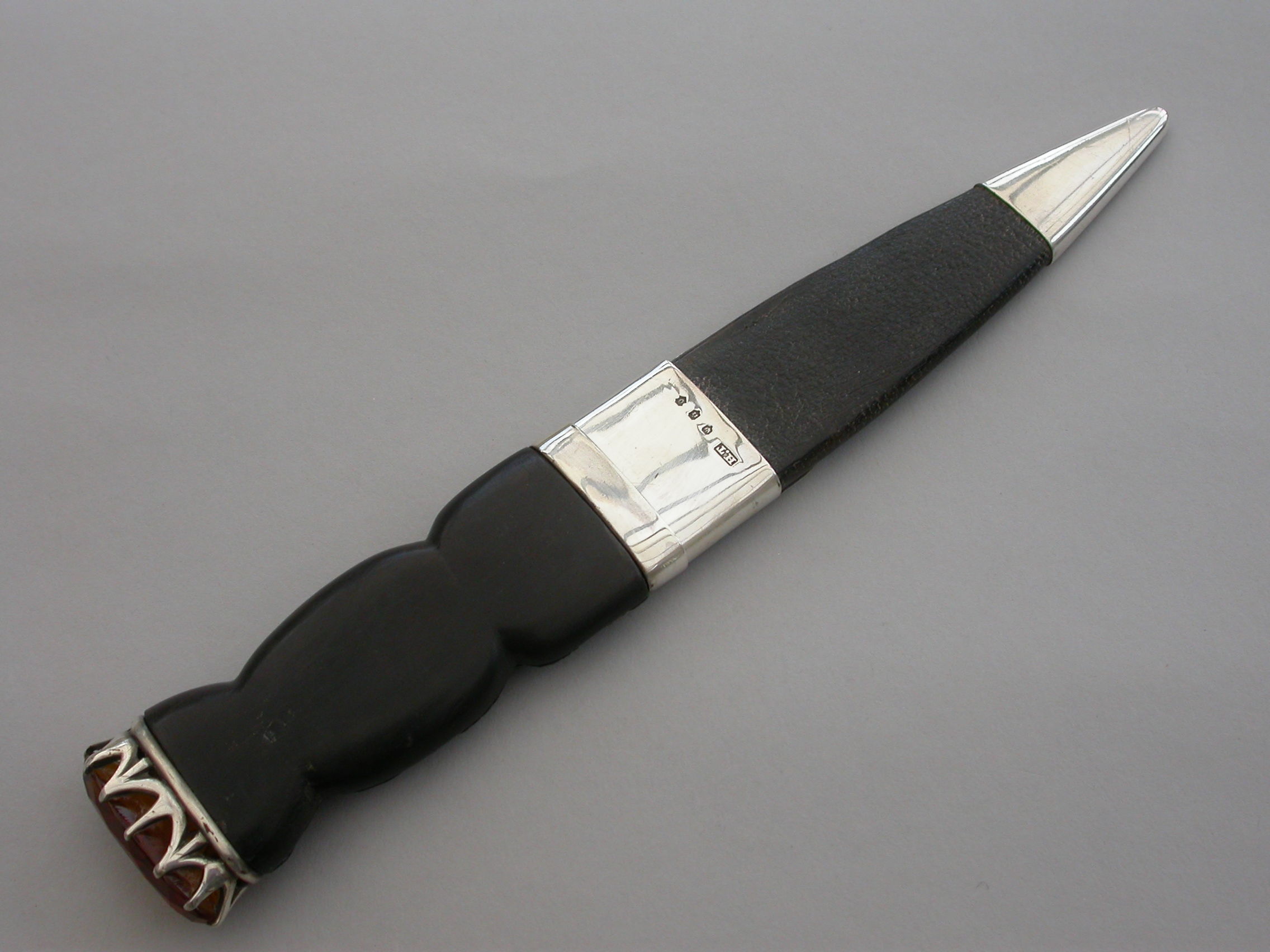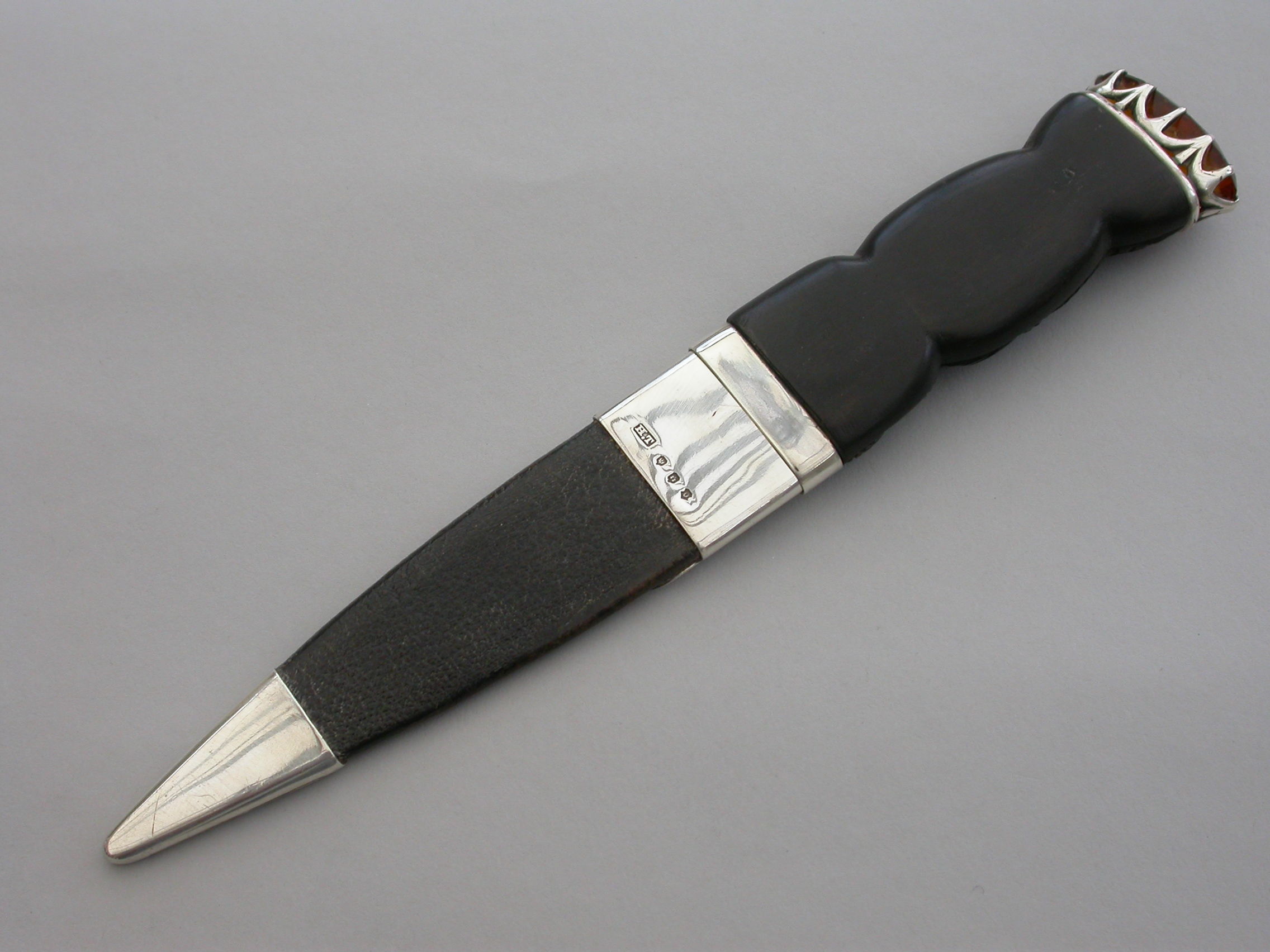 A good quality early 20th century Scottish silver mounted Dirk, with carved handle set with a faceted cairngorm stone finial.