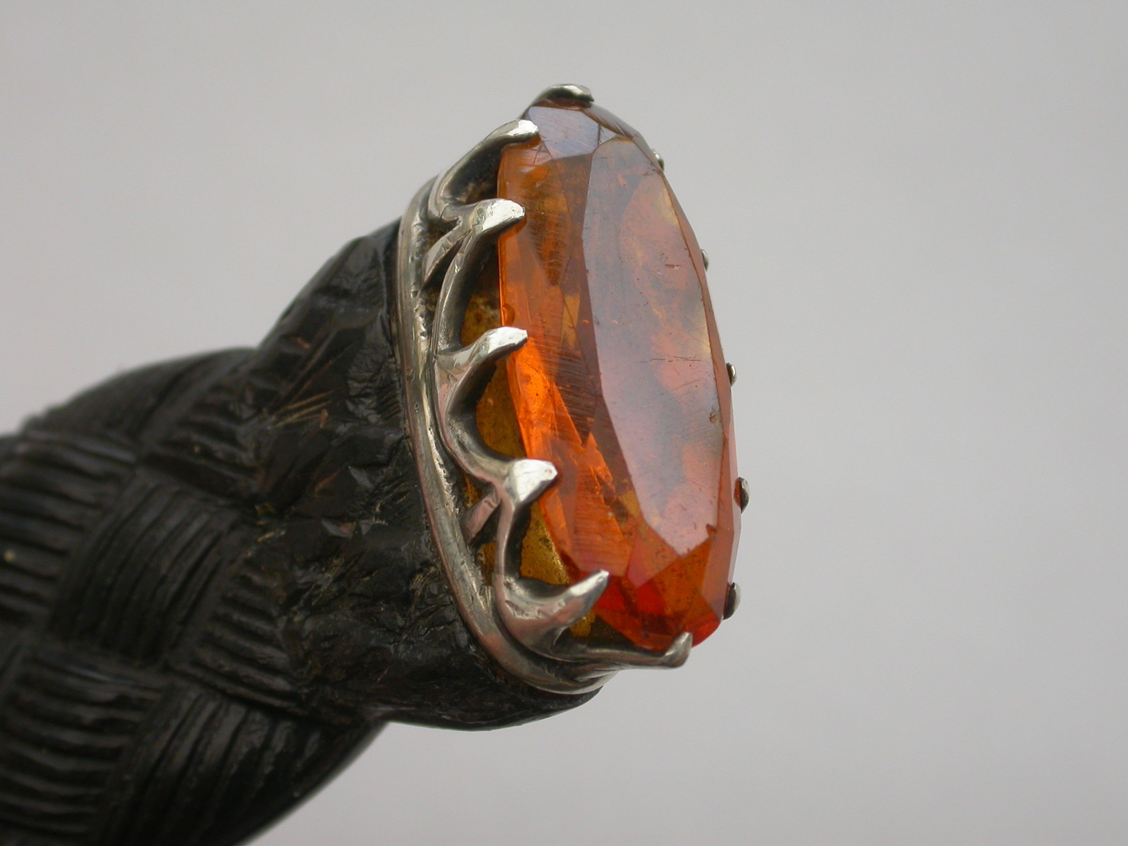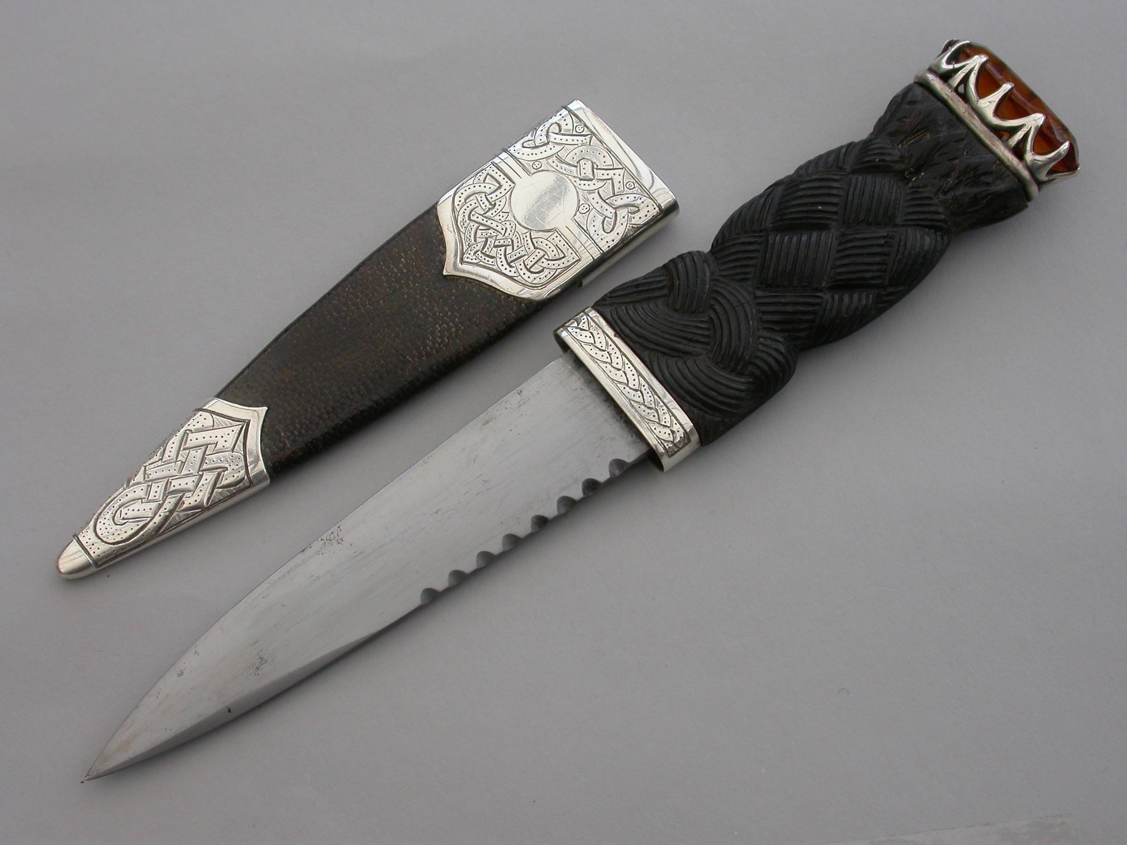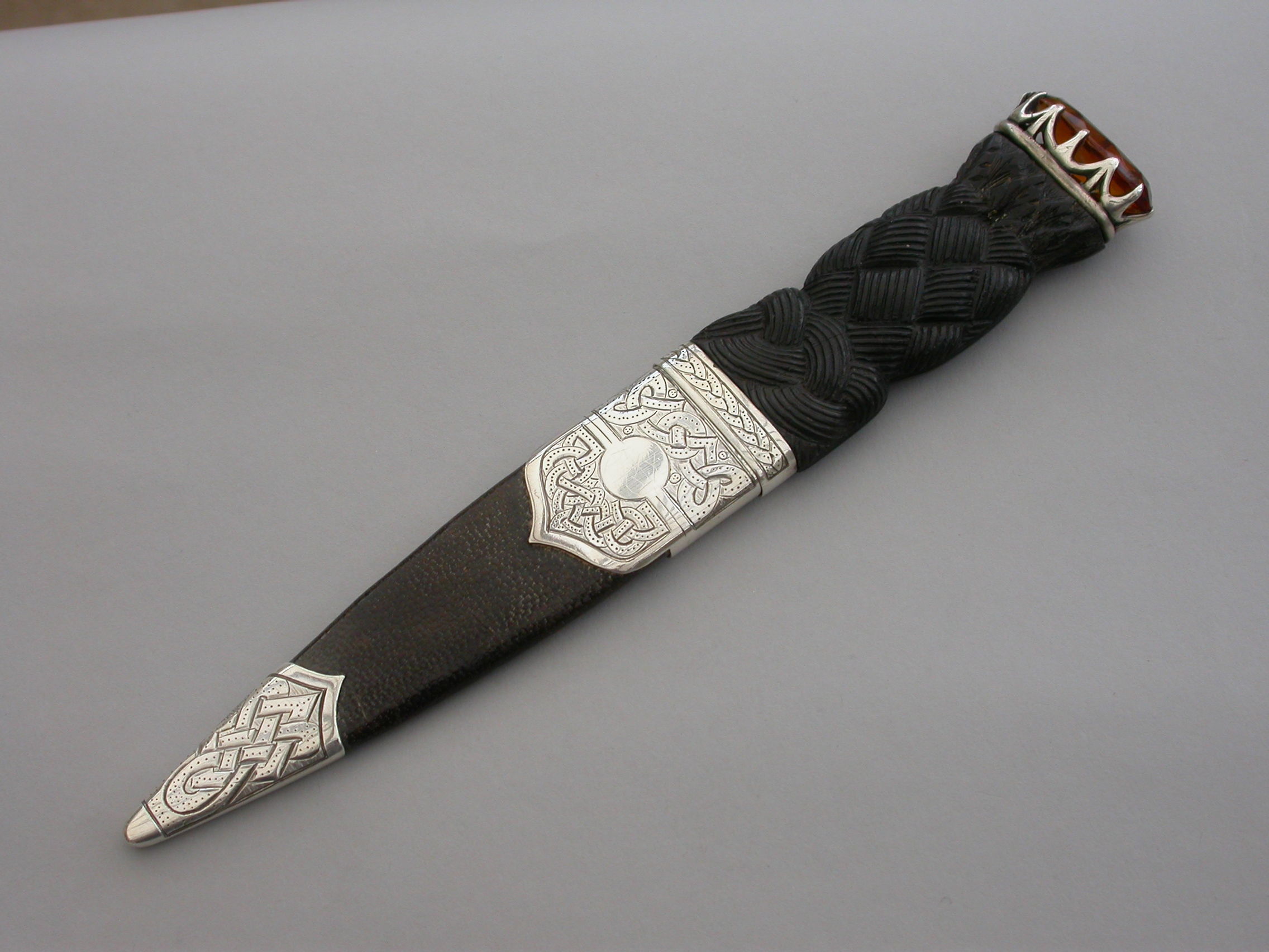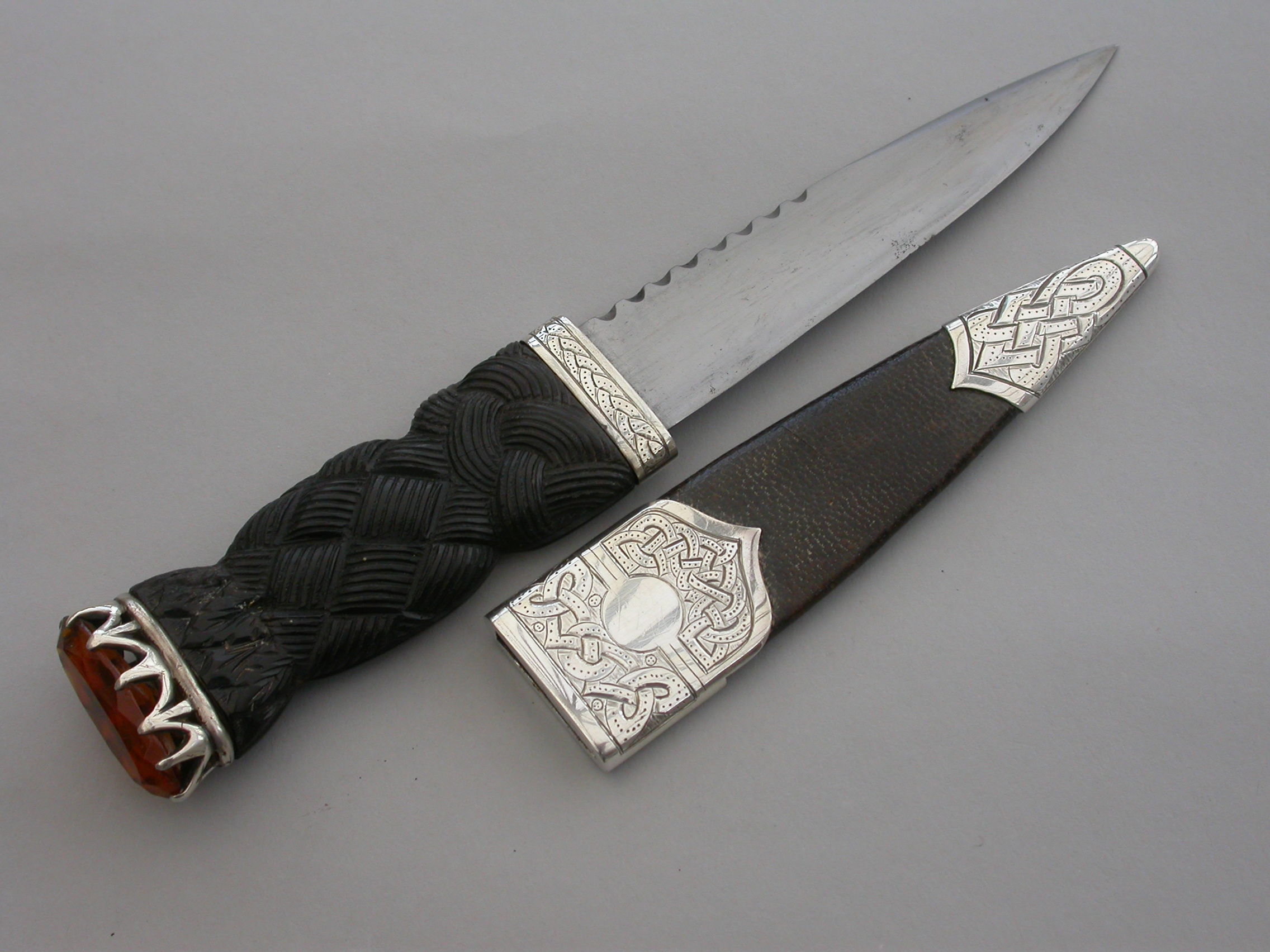 A good quality early 20th century Scottish silver mounted Dirk, with carved handle set with a faceted cairngorm stone finial.