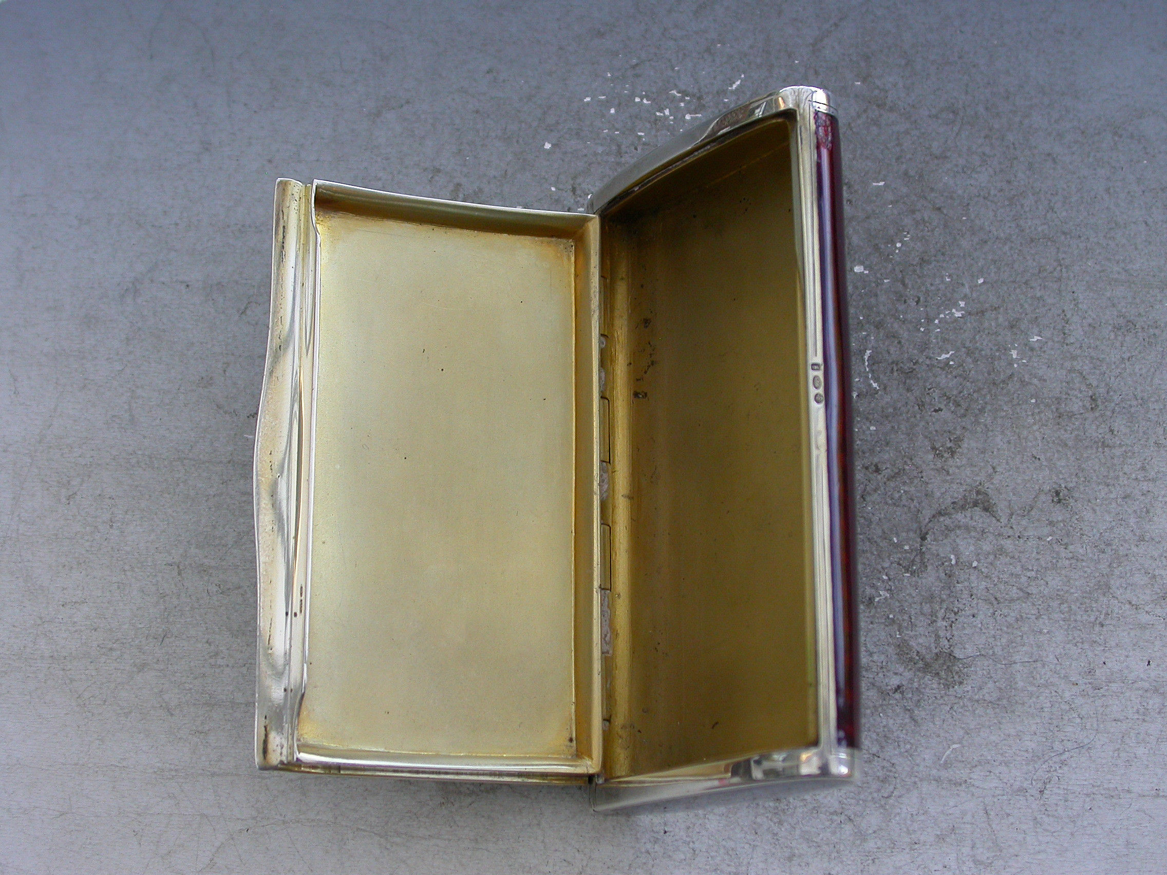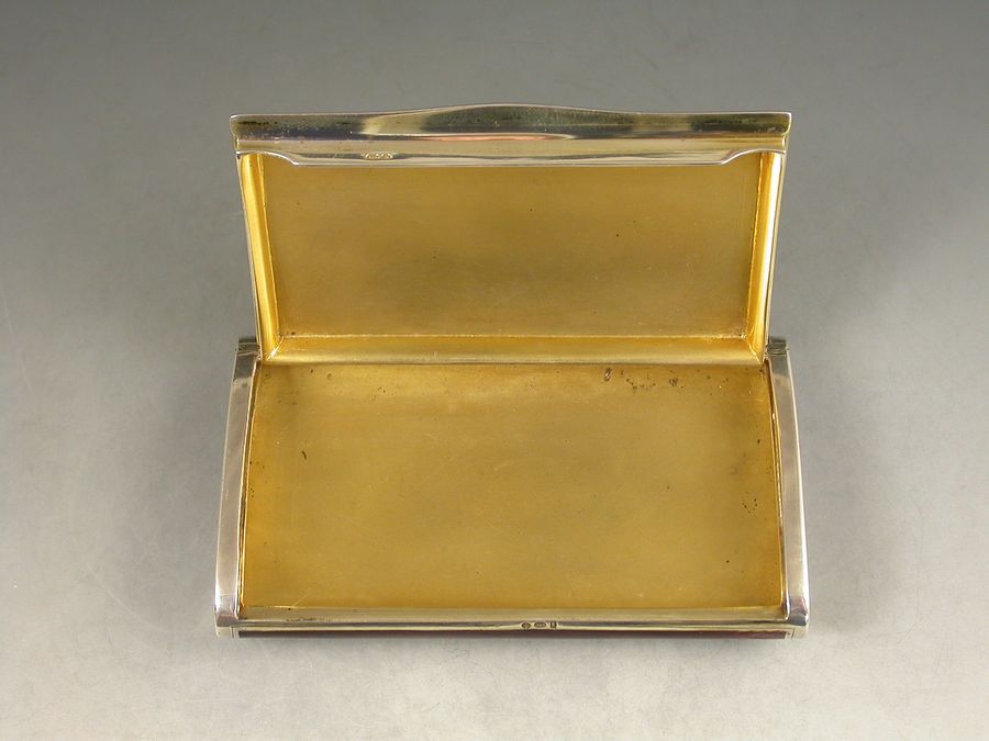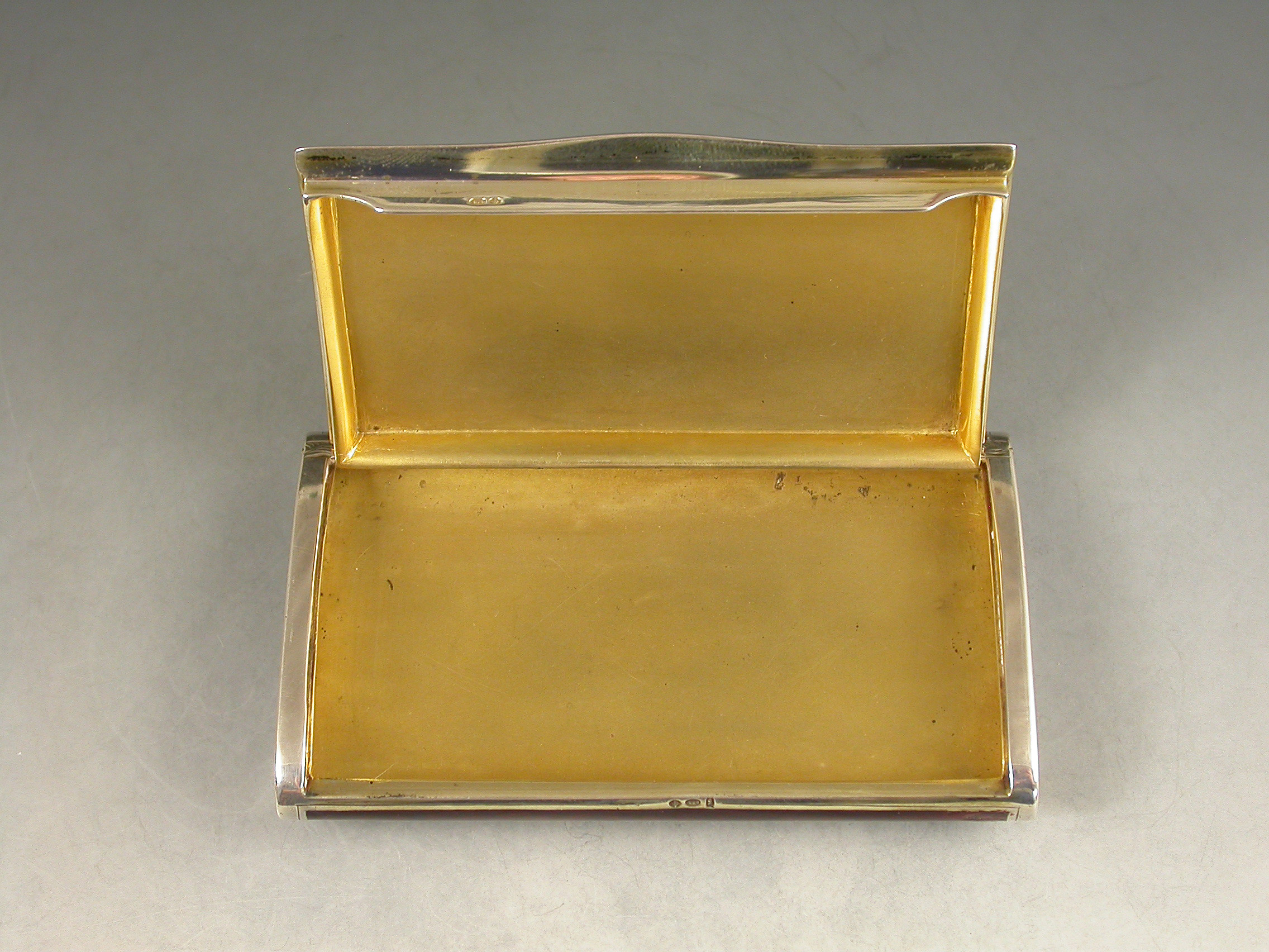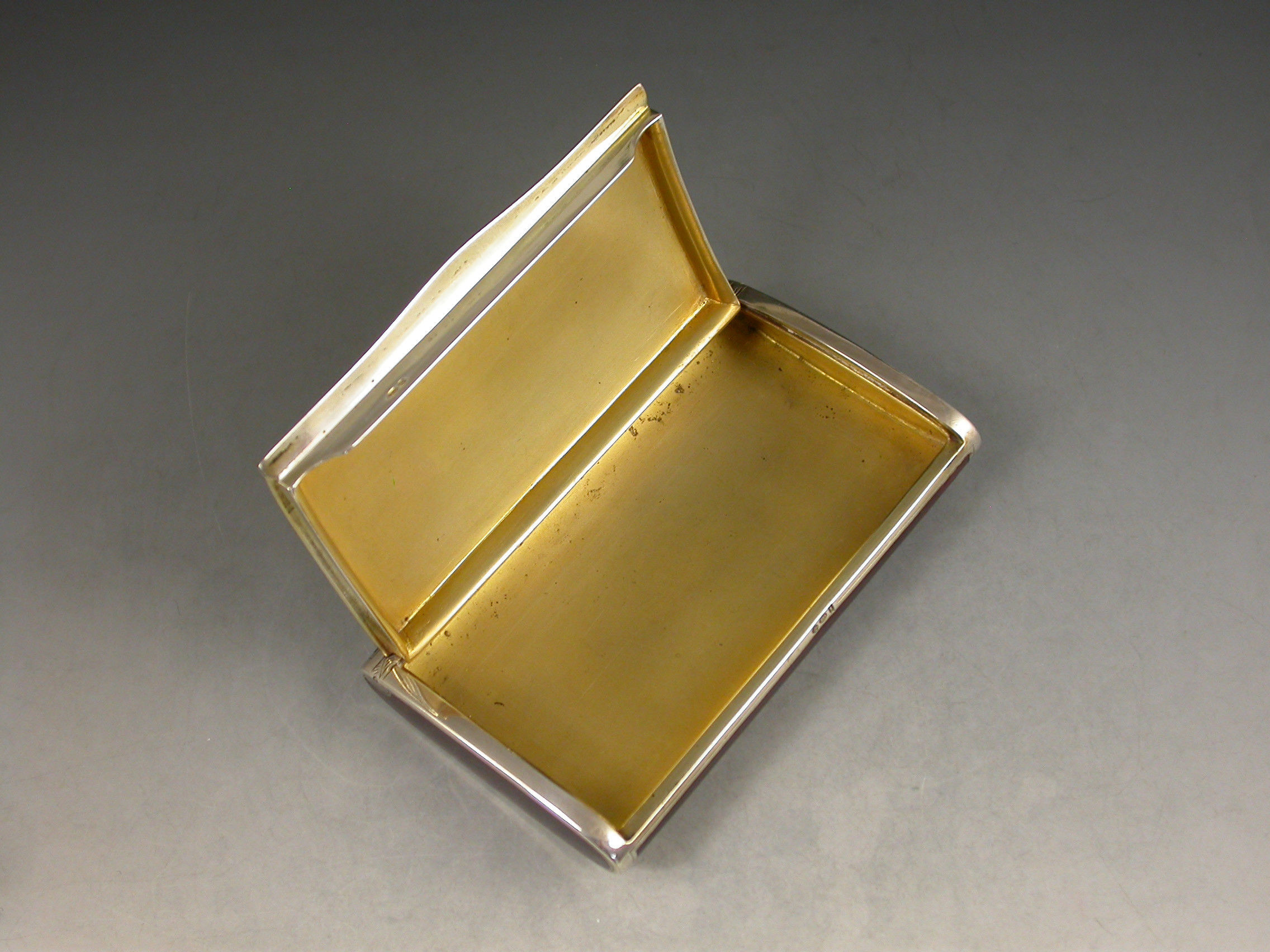 A good quality early 20th century silver and burgundy champleve enamel Snuff Box, of rounded rectangular form, the lid with flat concealed hinge opening to reveal a silver gilt interior. Enameled on all four sides.