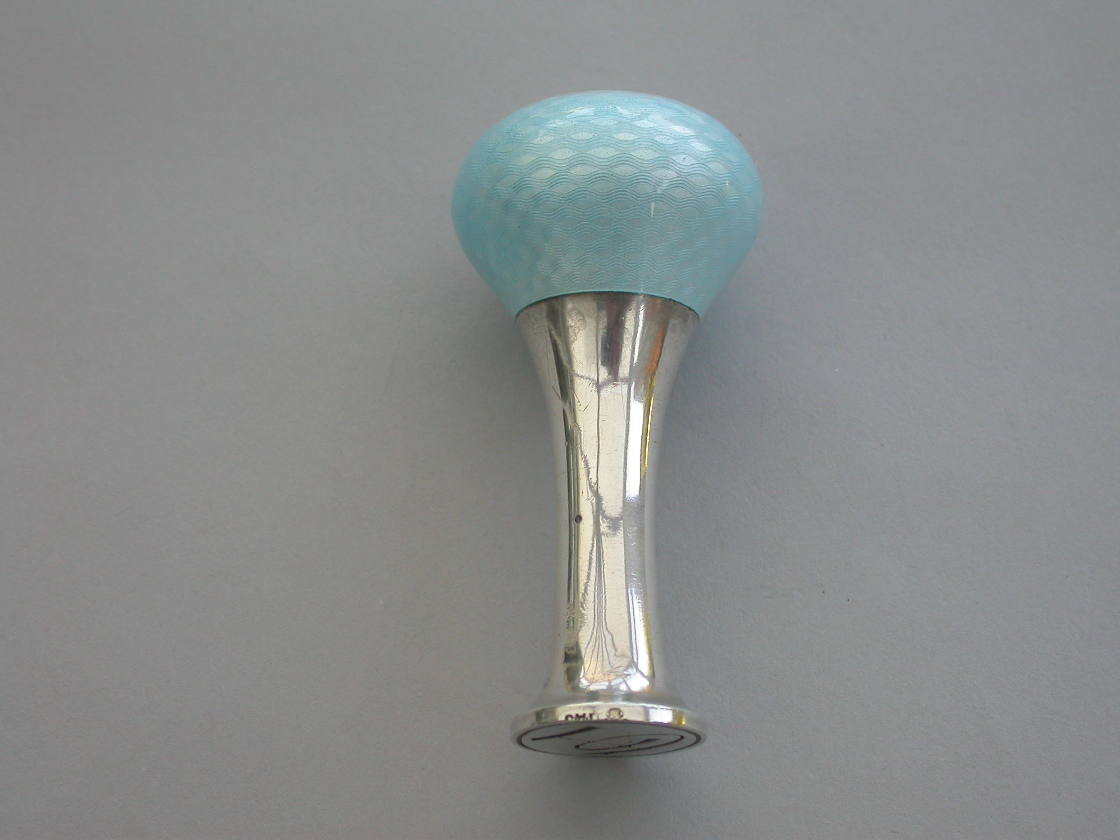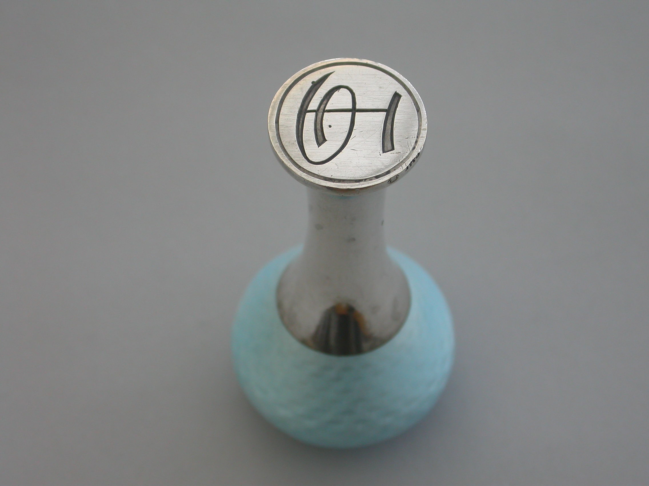 A good quality early 20th century silver and guilloche enamel Desk Seal with pale blue enamel handle and carved initial to the matrix.