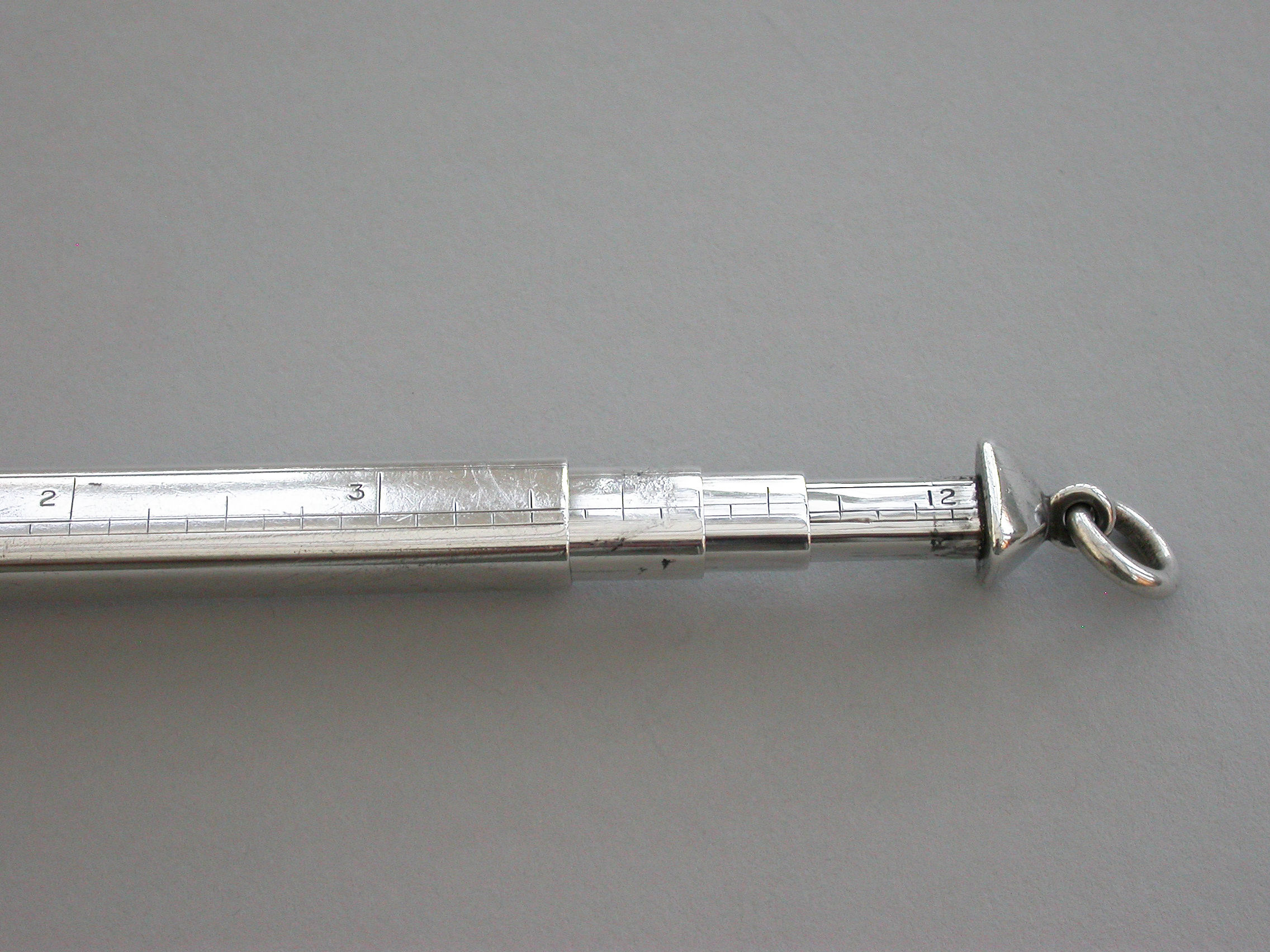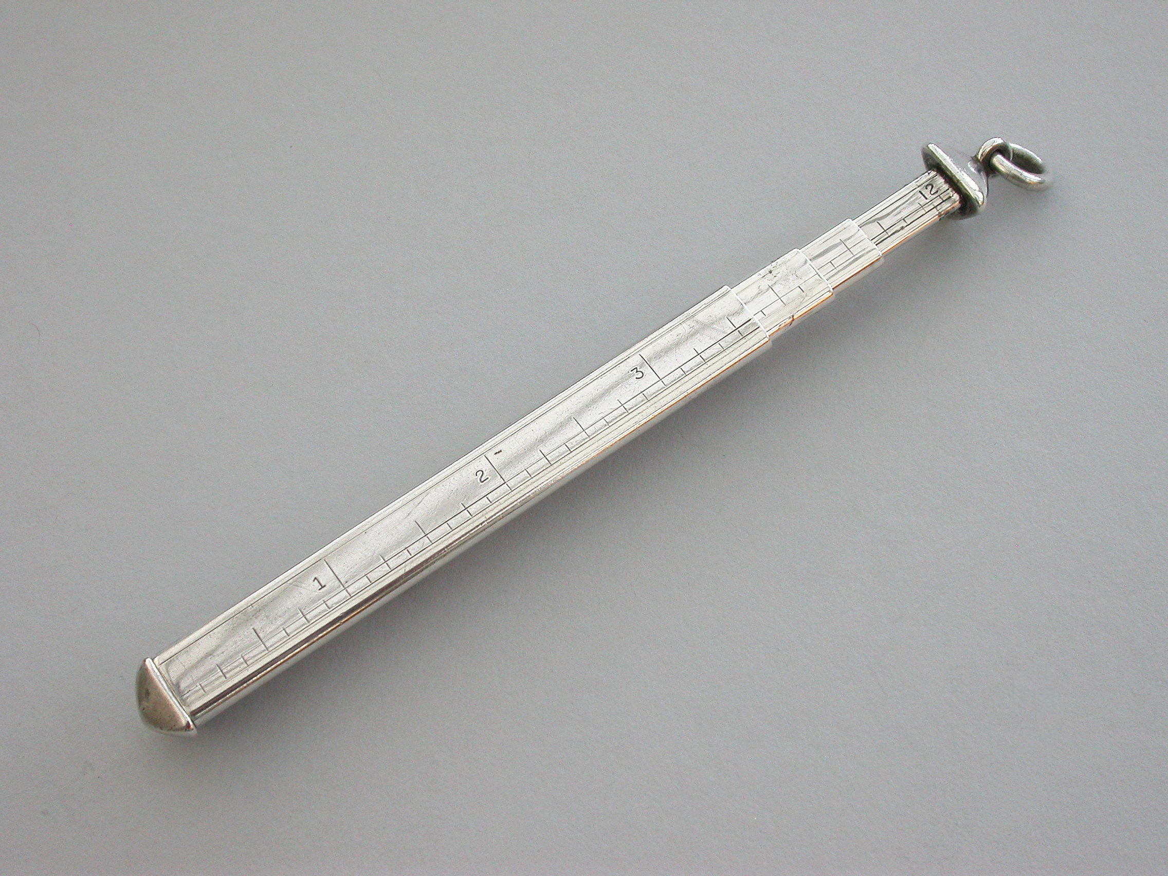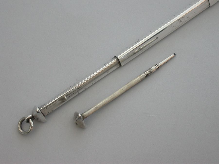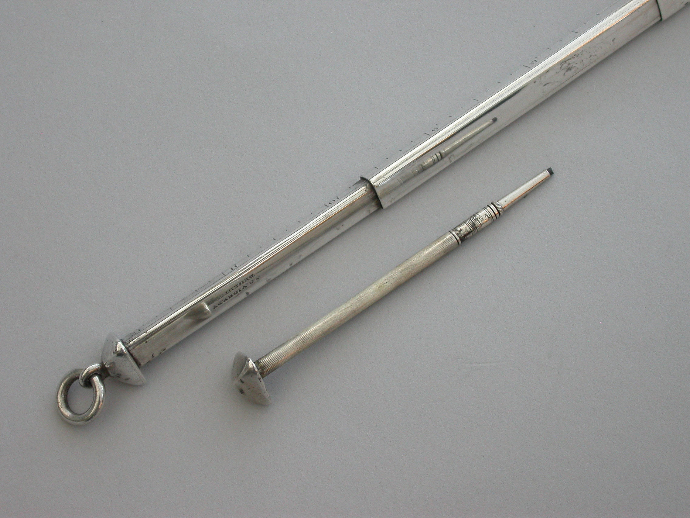 A good quality early 20th Century silver 12 inch extending Ruler with three drawers and engraved calibration, complete with an integral silver Propelling Pencil inserted into one end, the other end with an attached suspension ring.