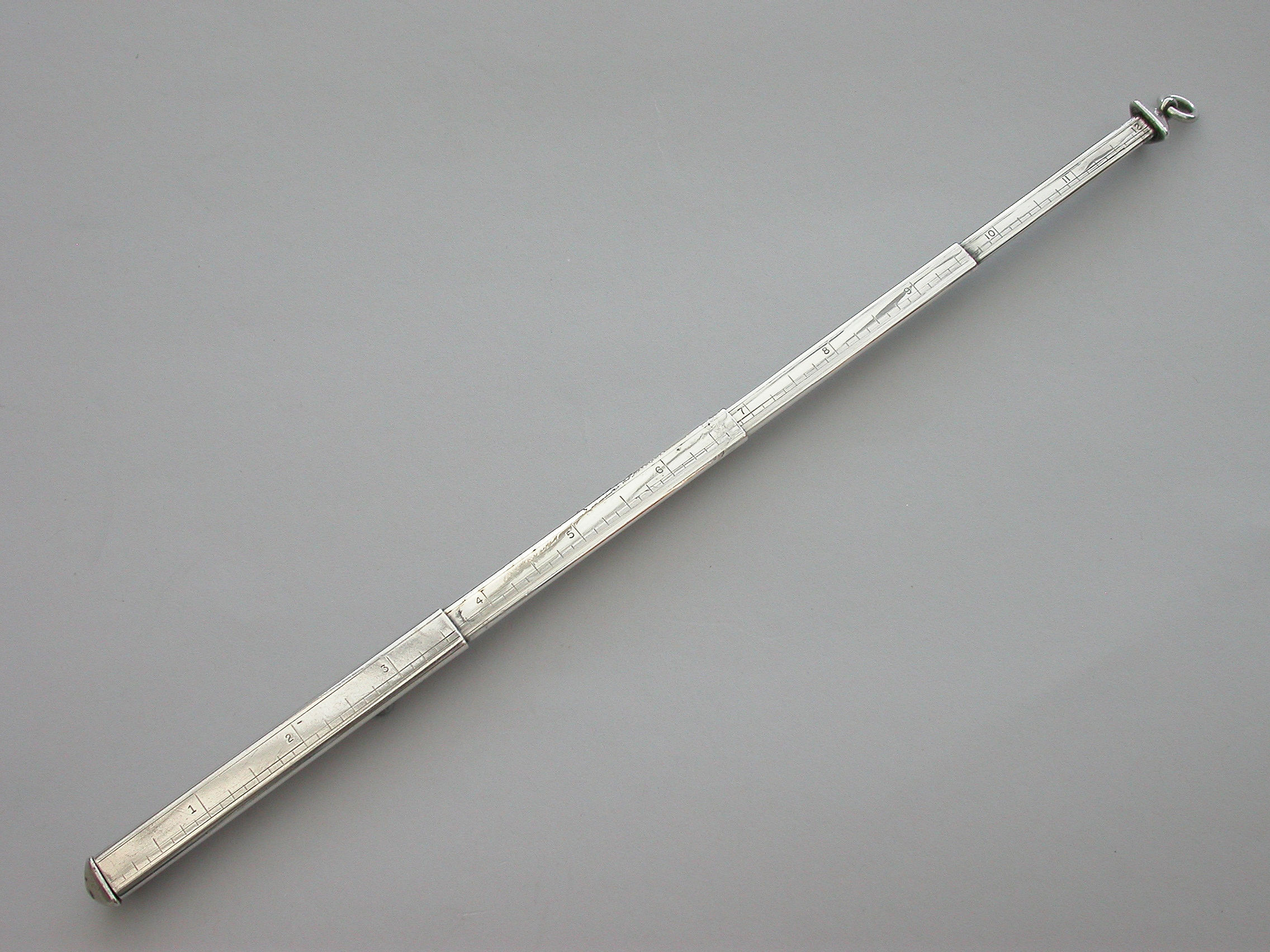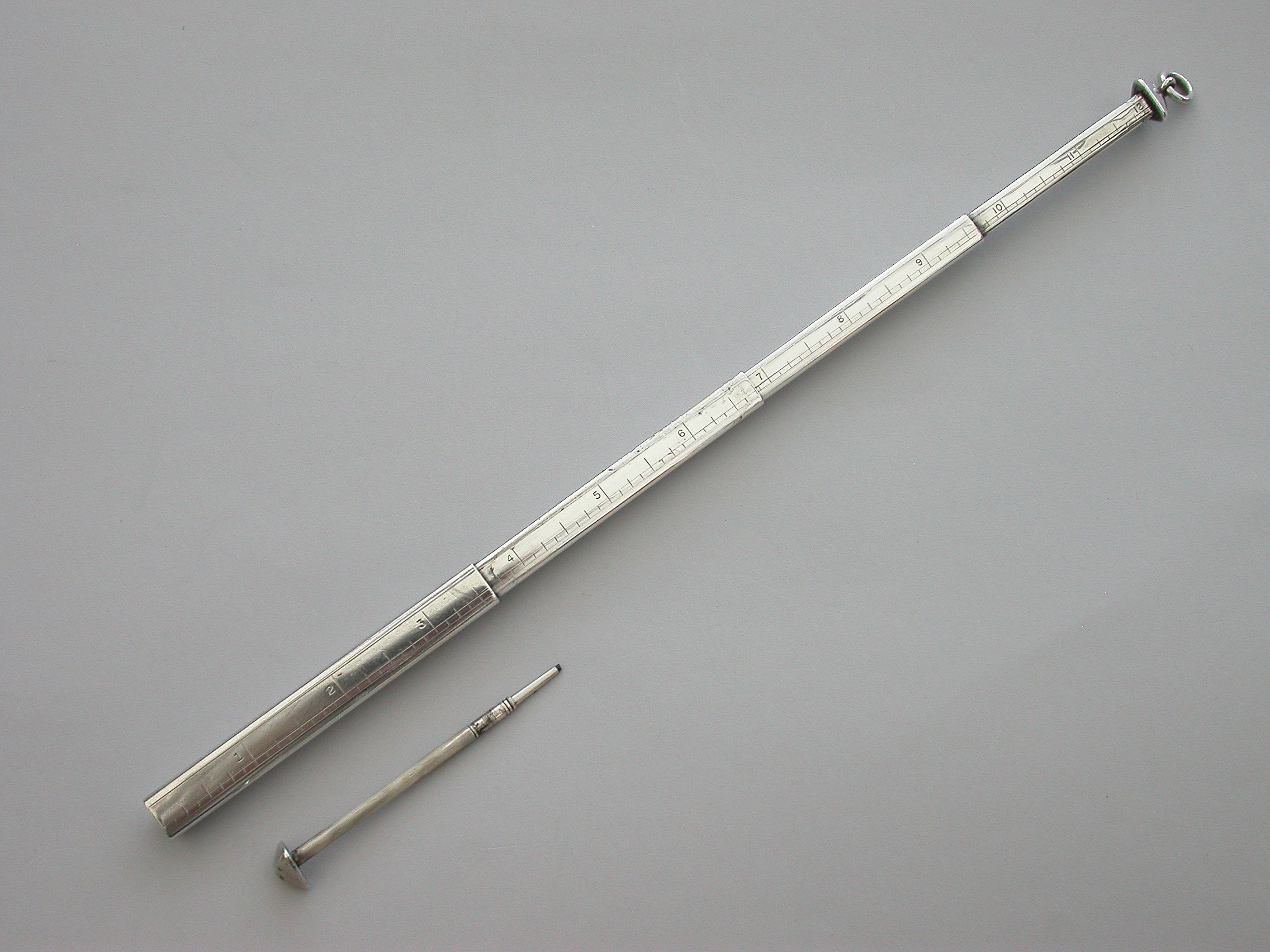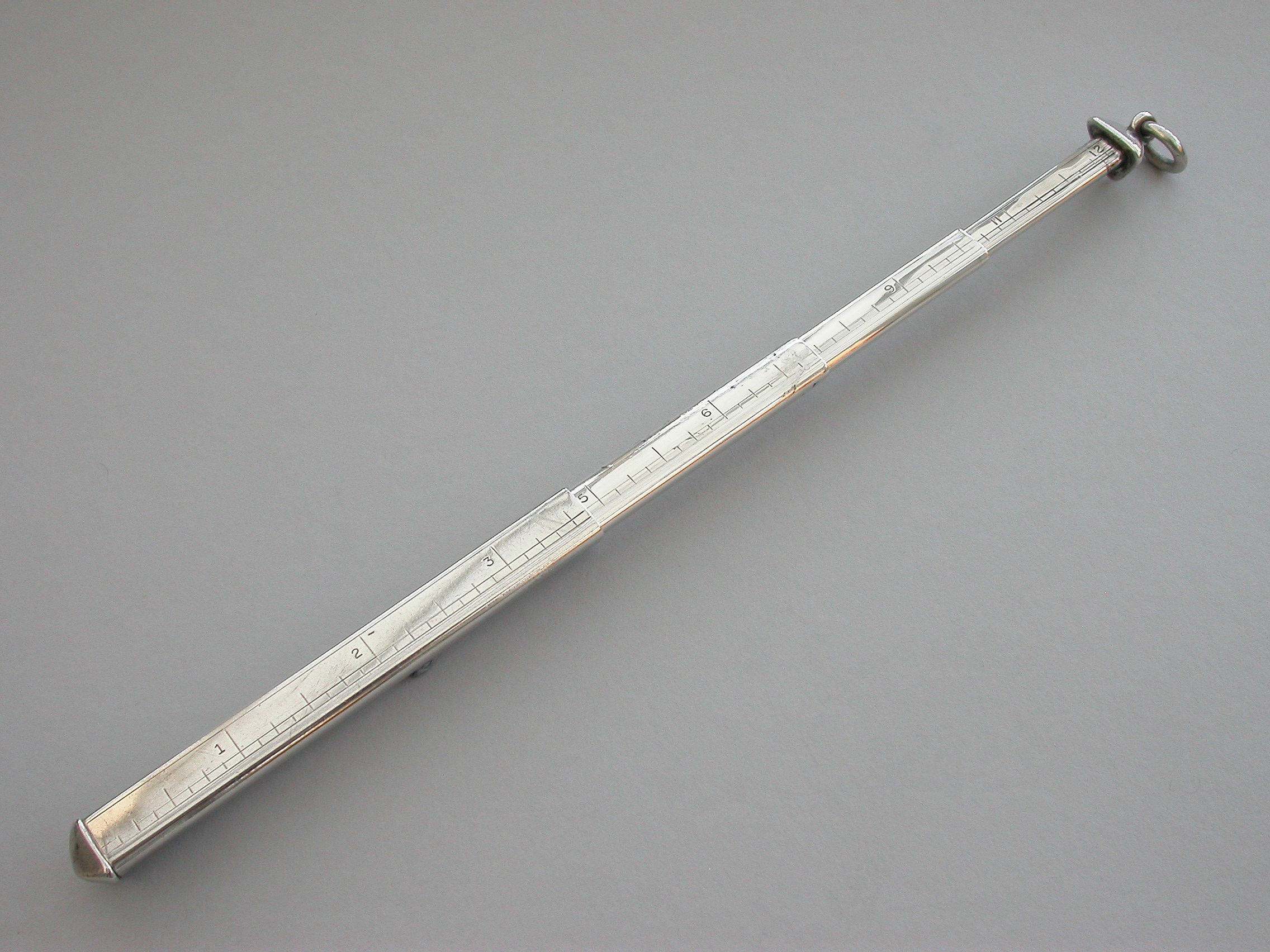 A good quality early 20th Century silver 12 inch extending Ruler with three drawers and engraved calibration, complete with an integral silver Propelling Pencil inserted into one end, the other end with an attached suspension ring.