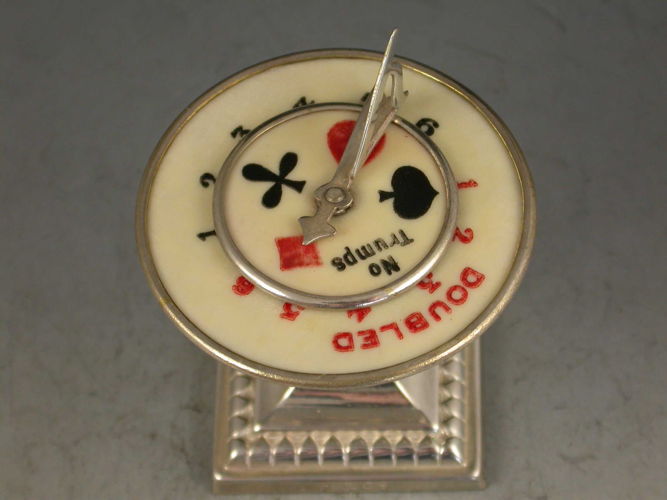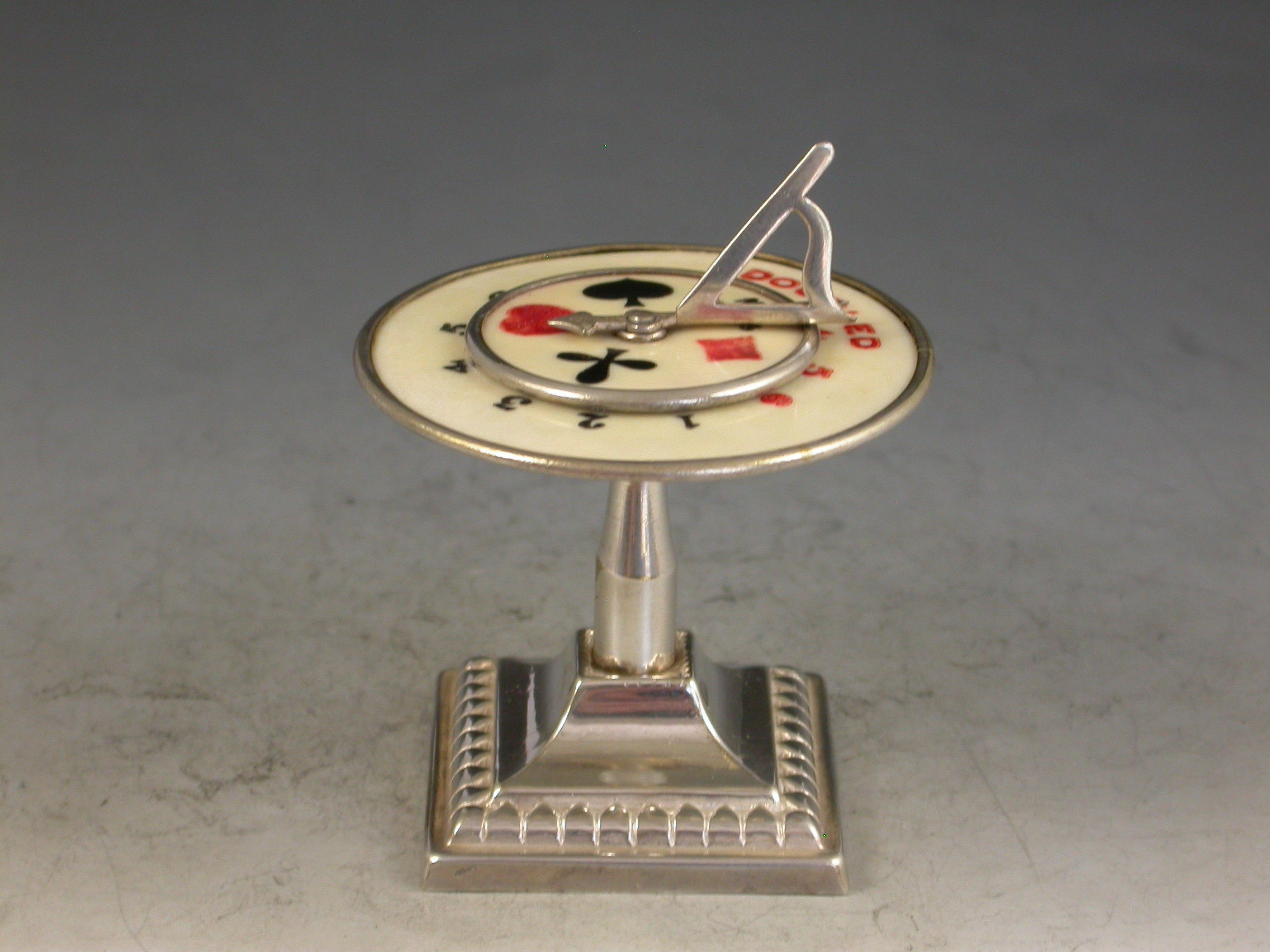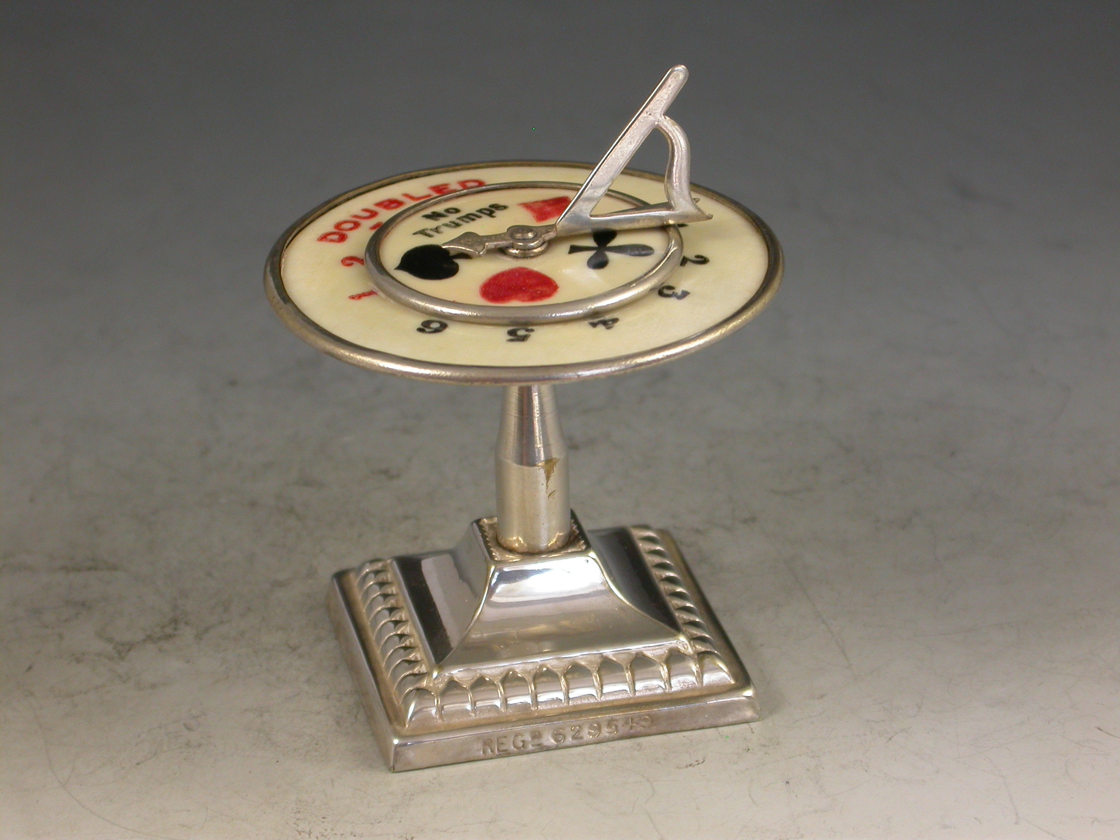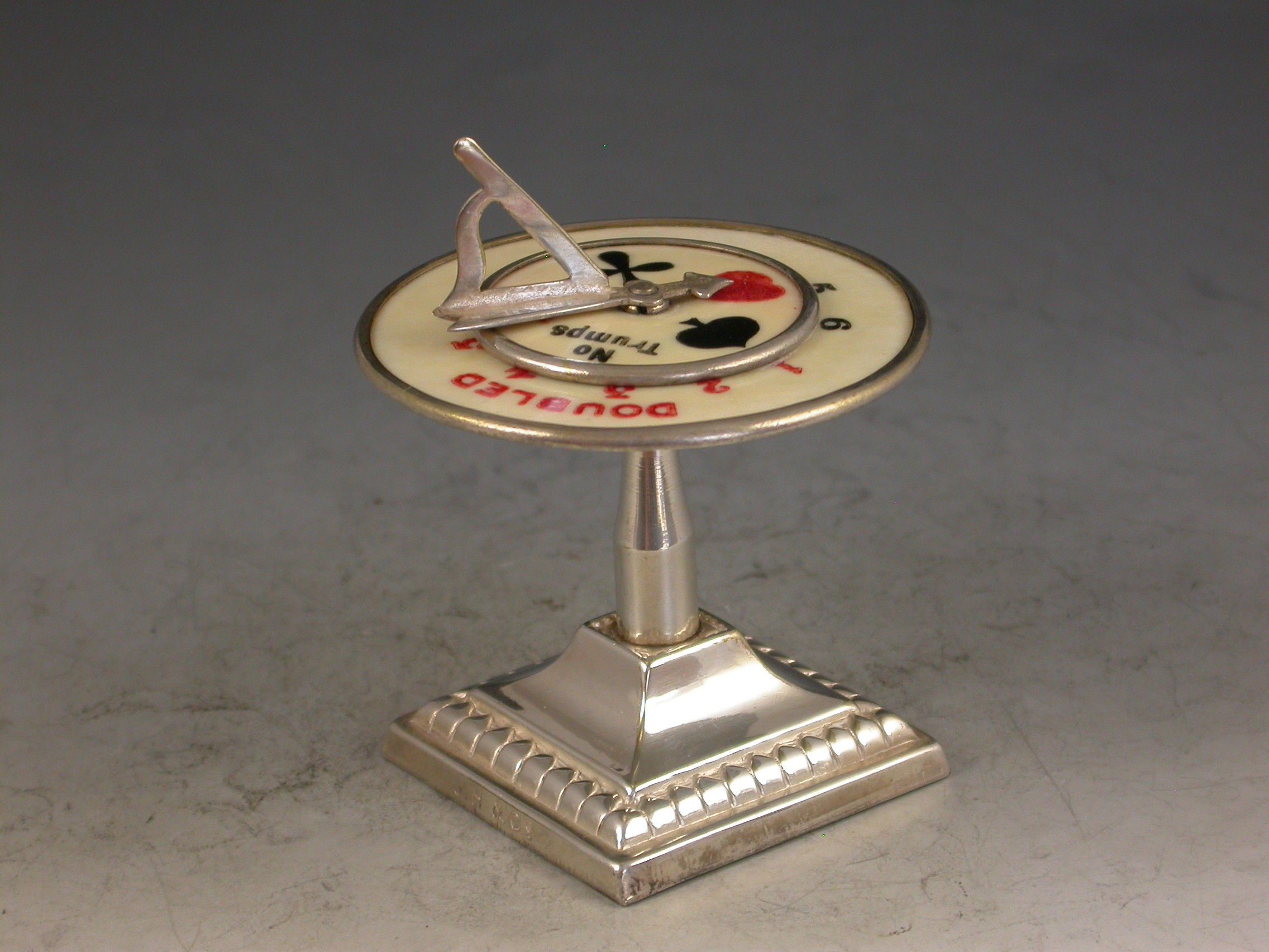 A rare early 20th century electroplated silver Trumps Marker made in the form of a Sun Dial, on square pedestal base with two circular ivory or celluloid discs indicating trumps and doubles. A rotating pointer secured with a pin.