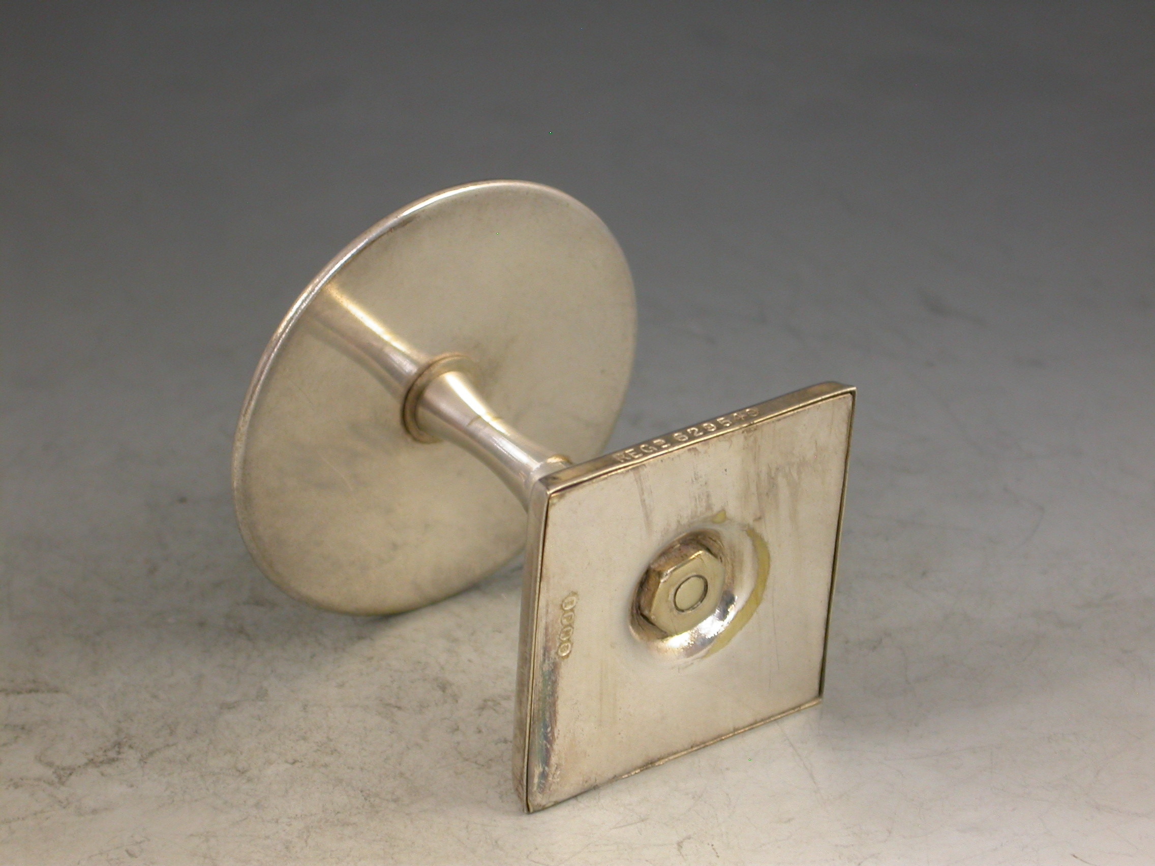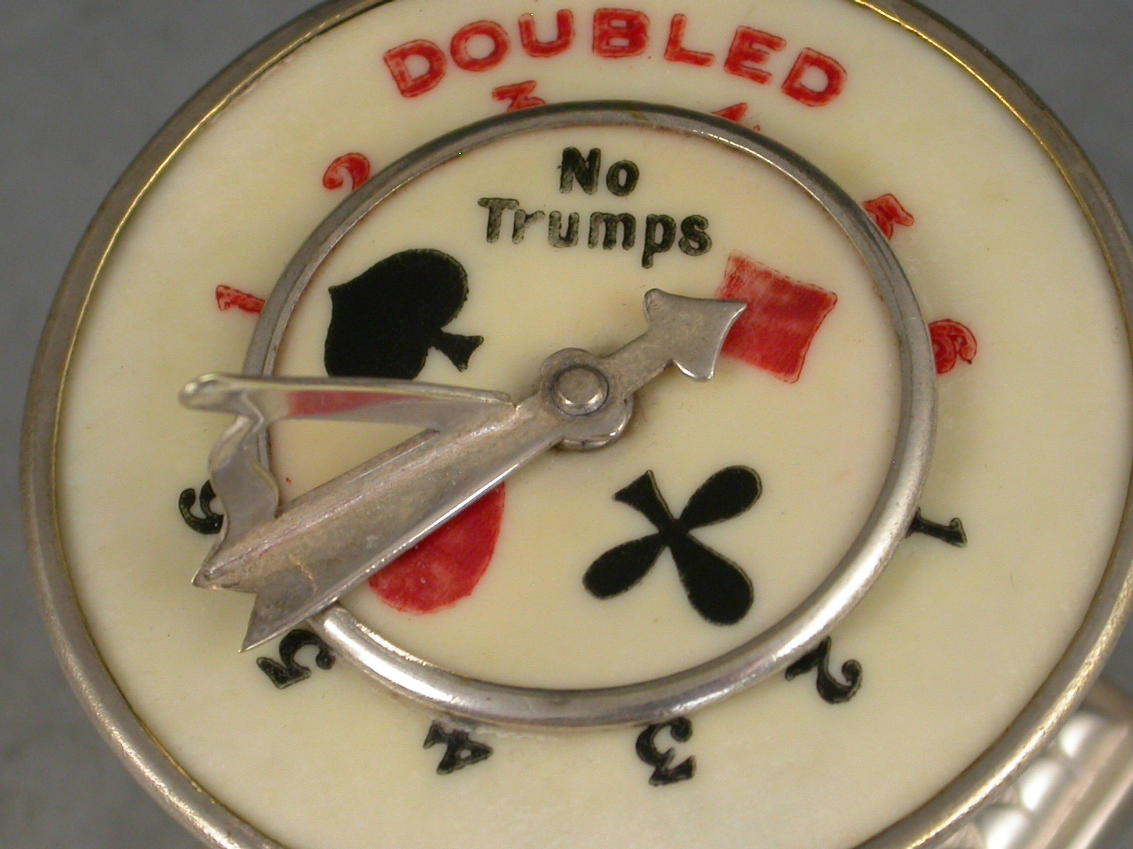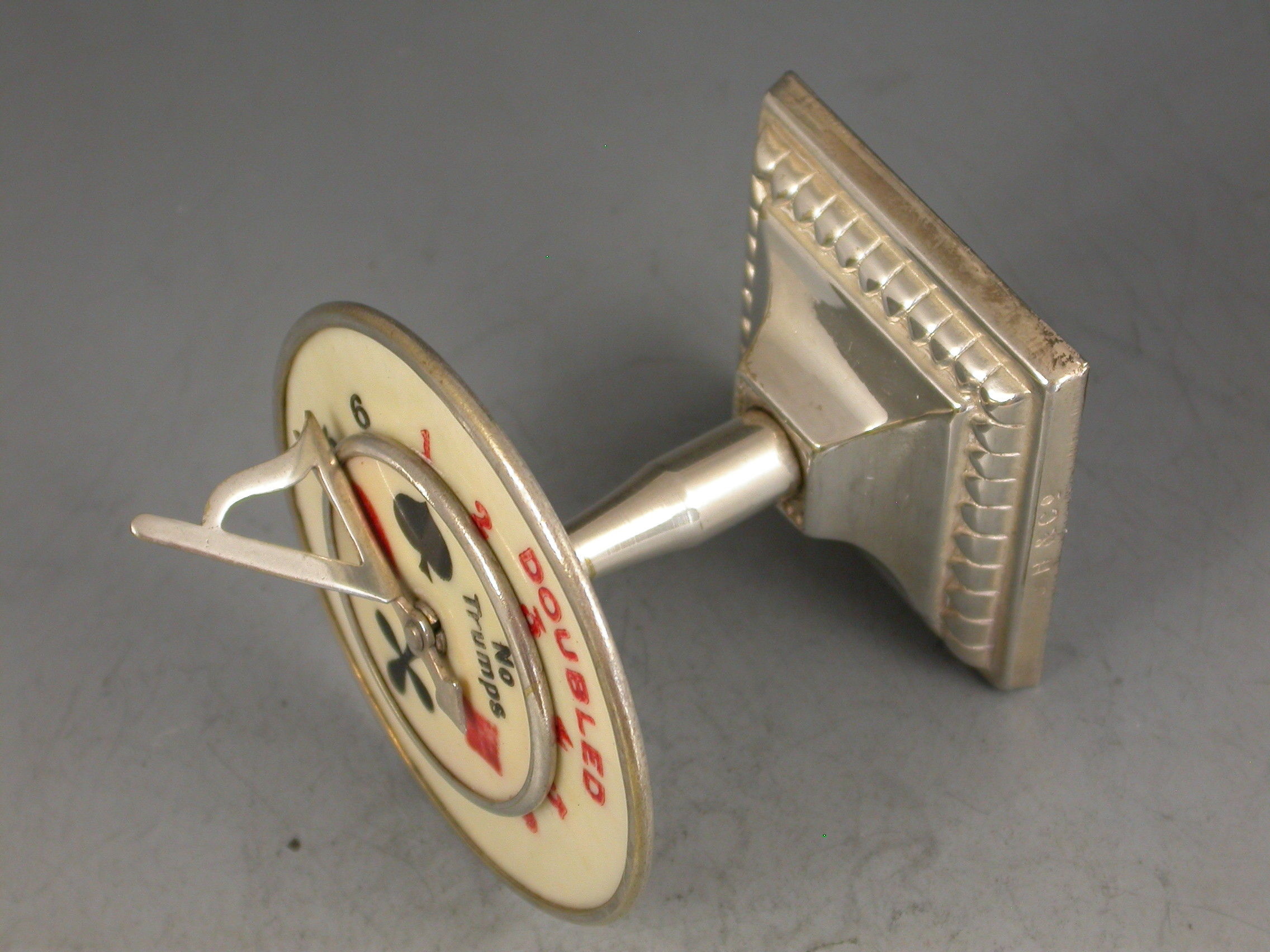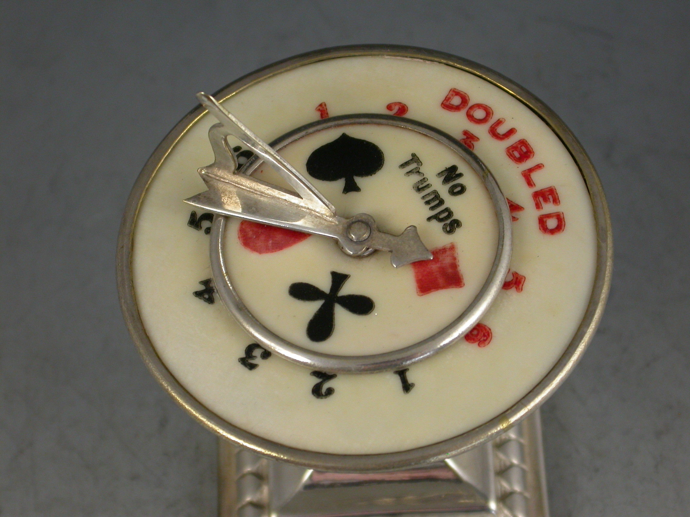 A rare early 20th century electroplated silver Trumps Marker made in the form of a Sun Dial, on square pedestal base with two circular ivory or celluloid discs indicating trumps and doubles. A rotating pointer secured with a pin.