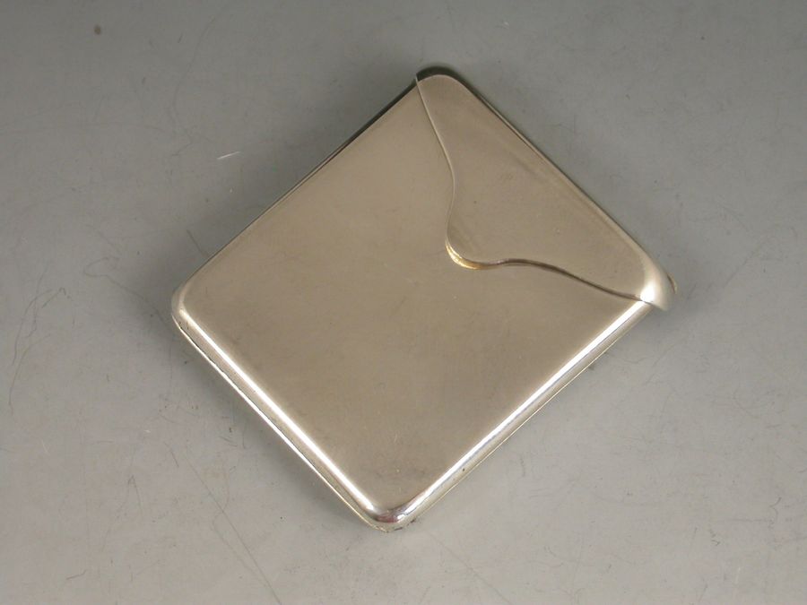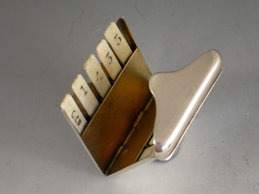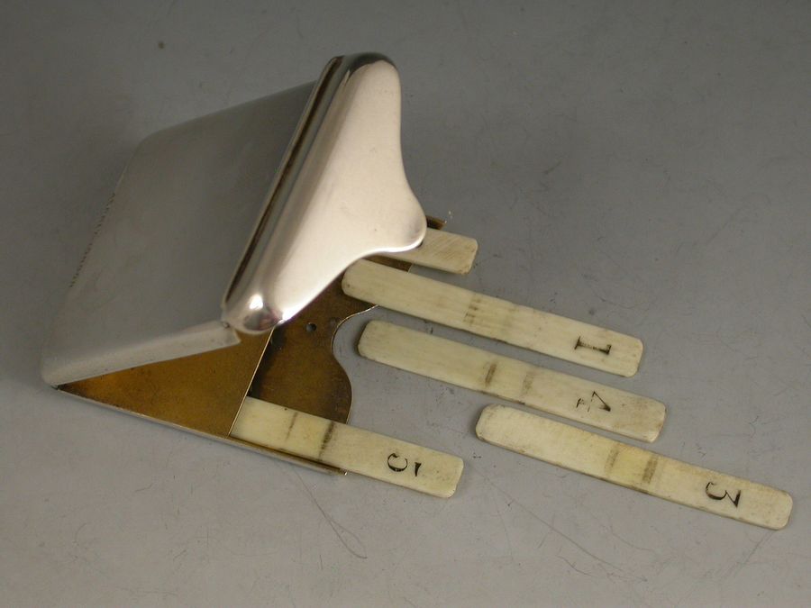 A good early 20th century silver Butt Marker of slim pouch form with hinged flap cover, springing open to reveal two sections each with five slots and containing ten numbered ivory or bone pegs. Silver gilt interior.