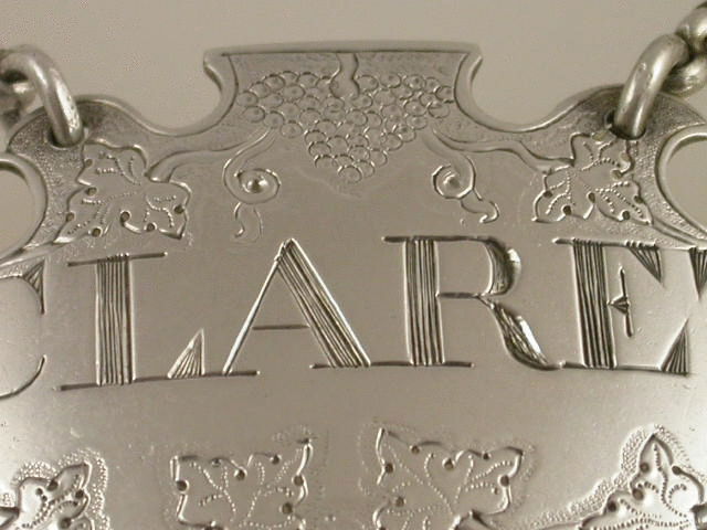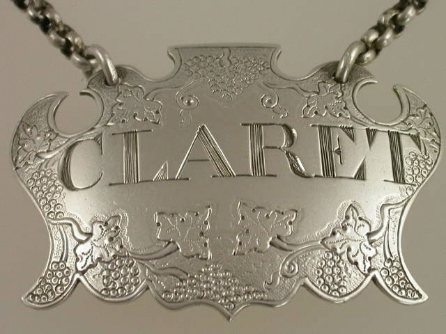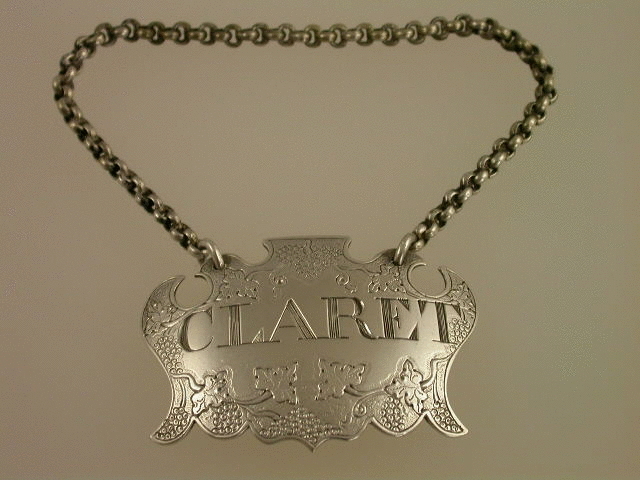 A superb George II silver Wine Label of unusual chased escutcheon form with distinctive flattened top, chased and engraved with vine leaves and grapes. Incised for CLARET.