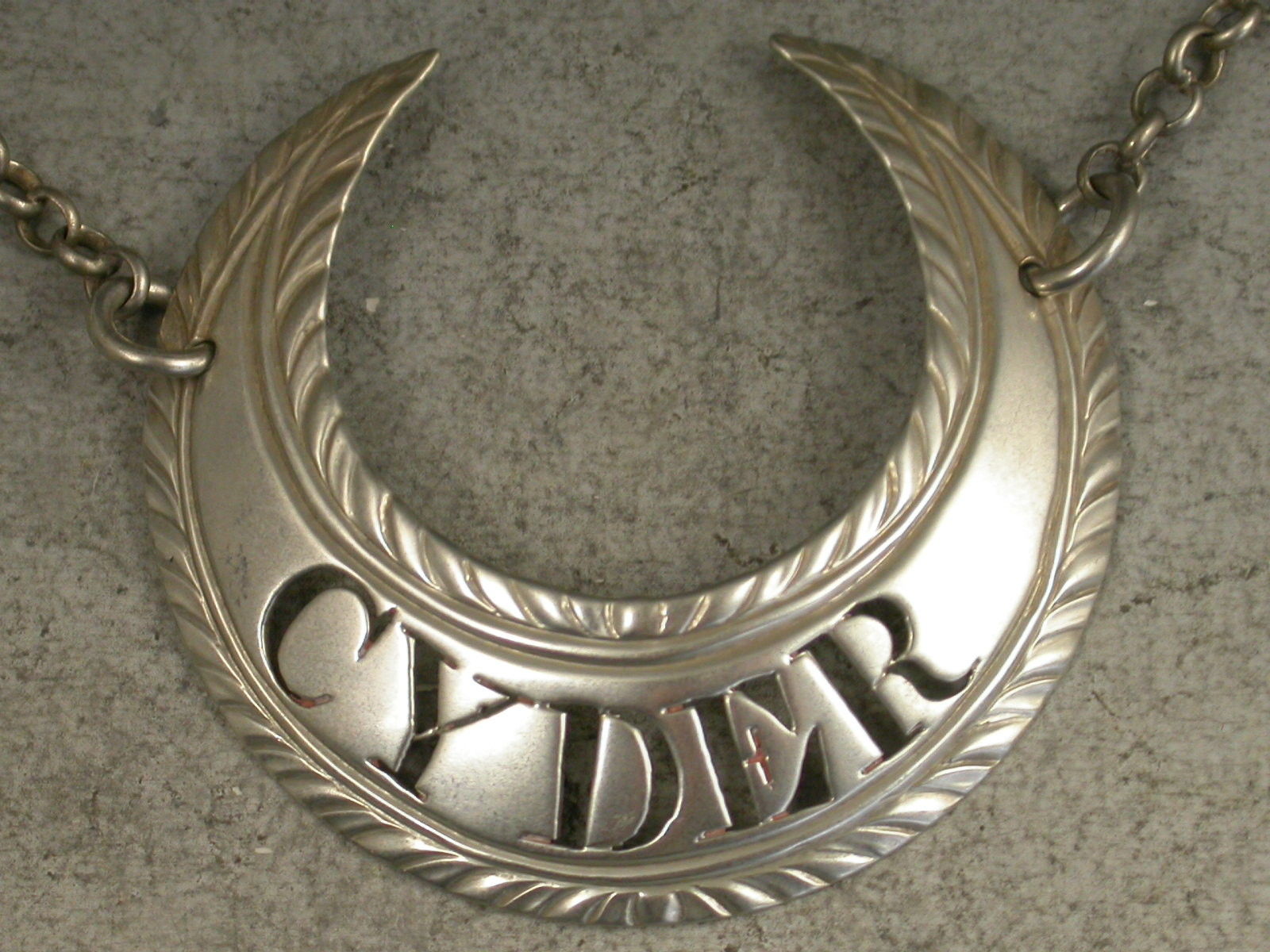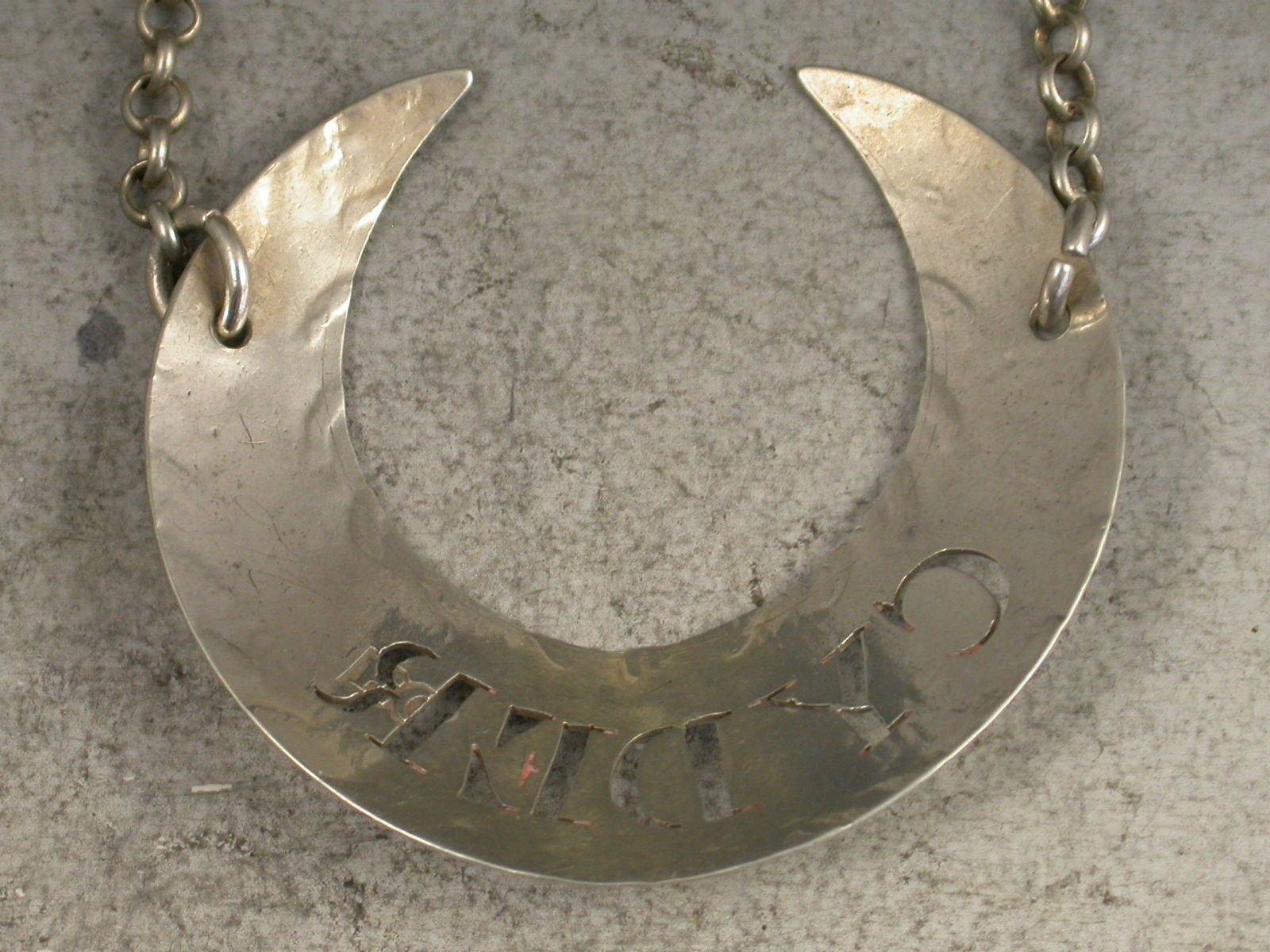 A rare early George III silver Wine Label of crescent form with feather edge border, pierced for Cyder.