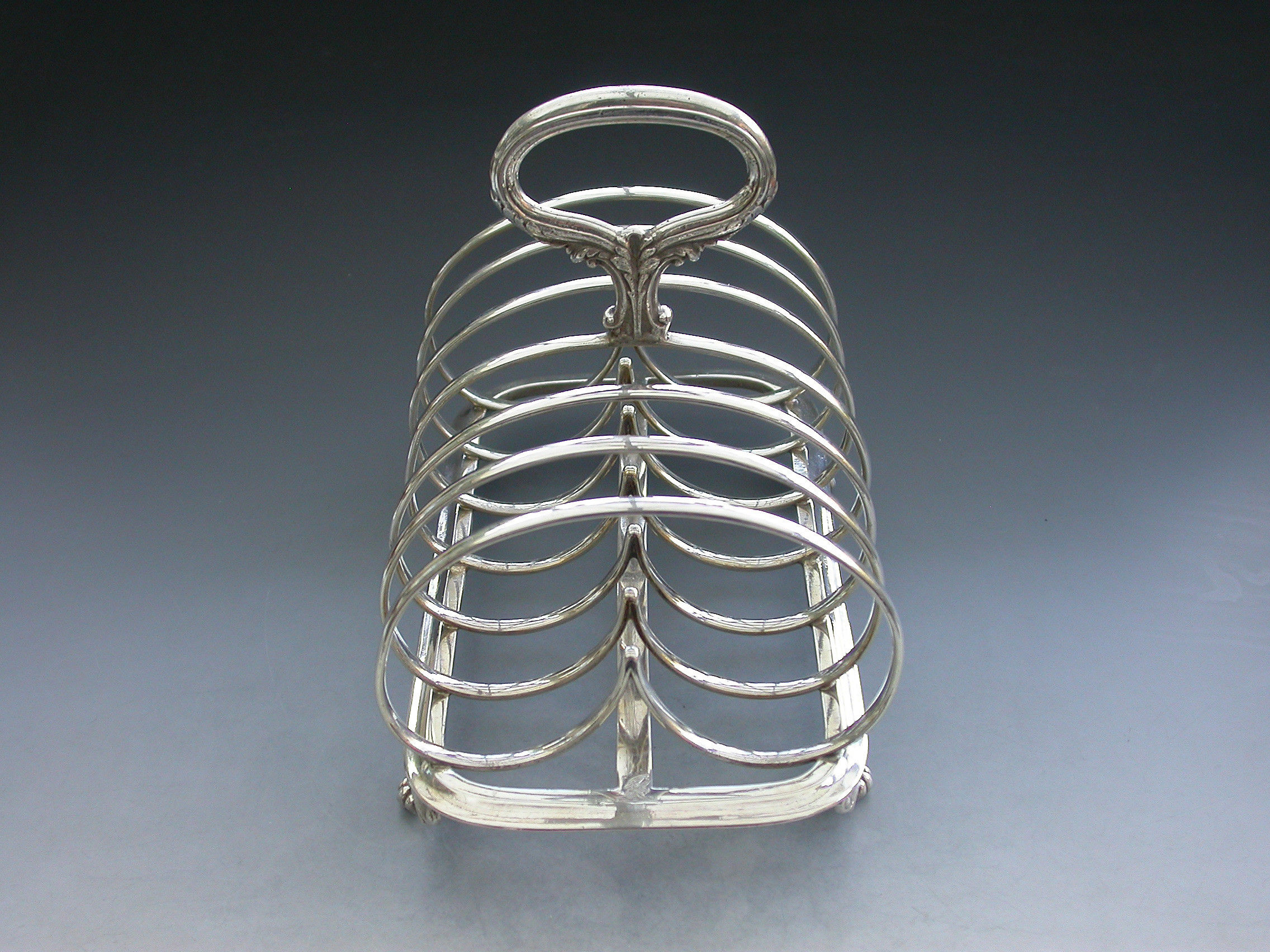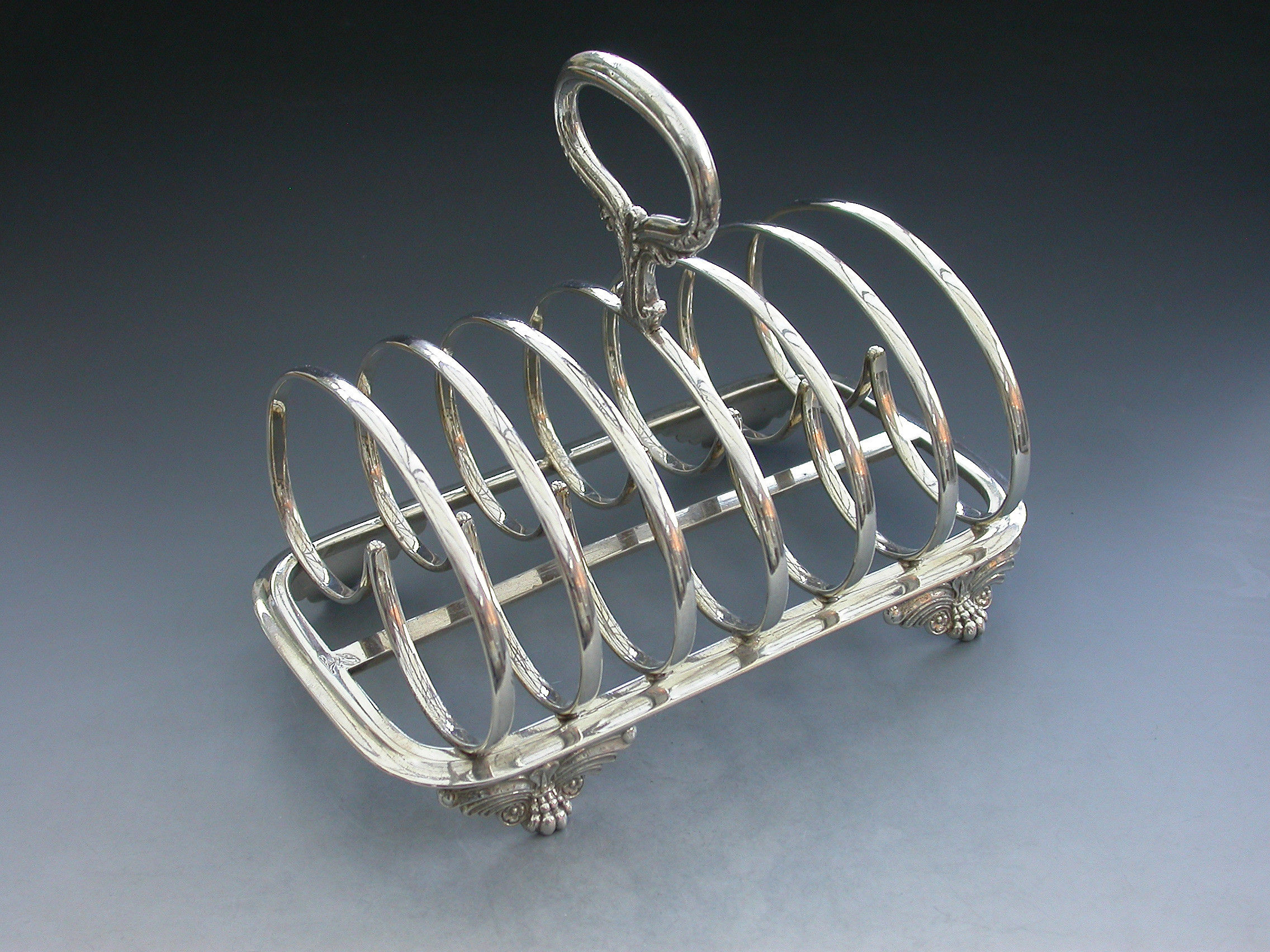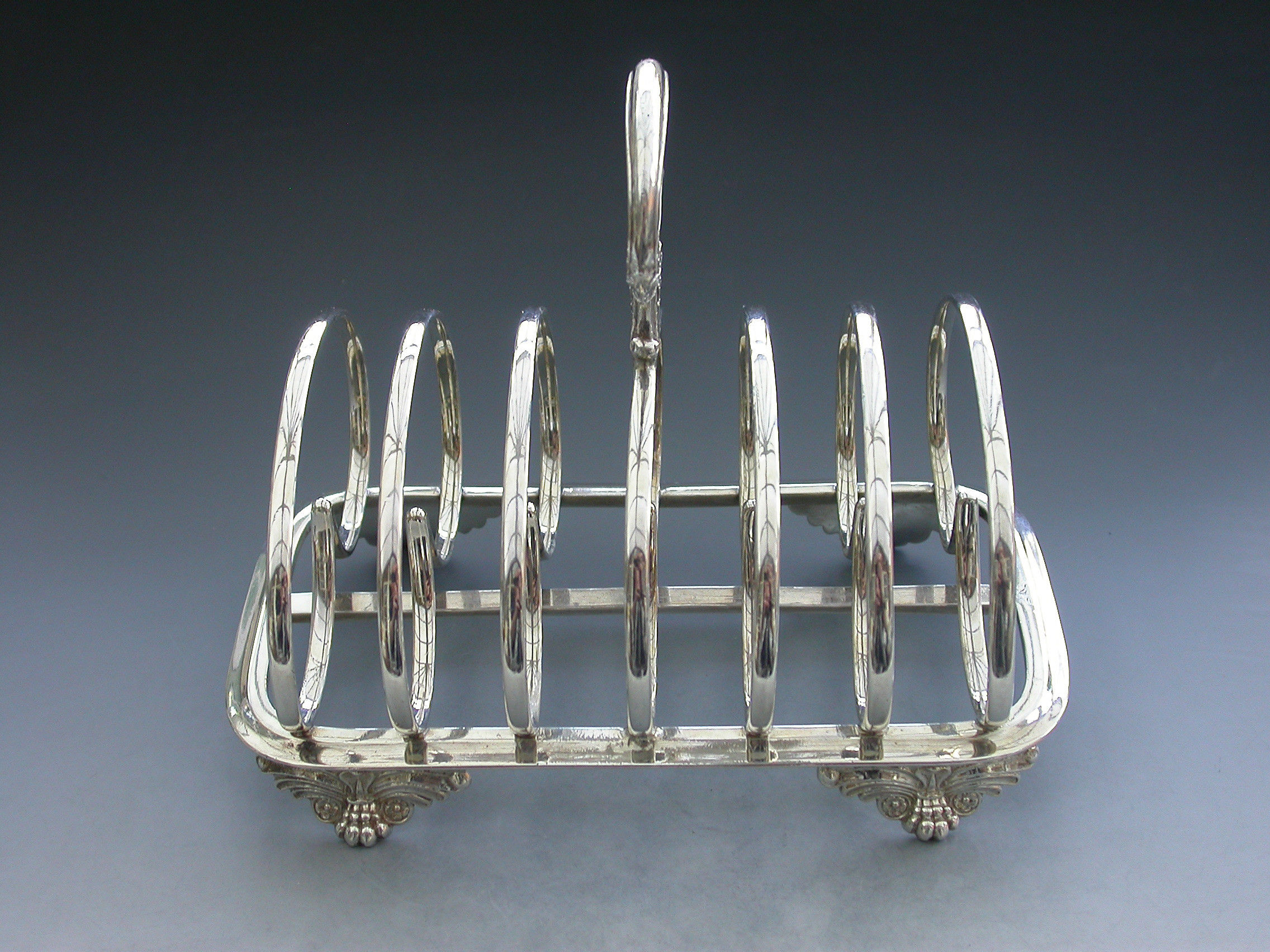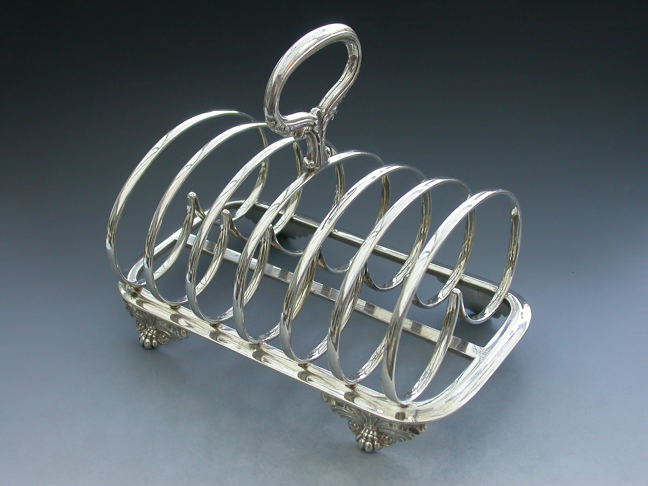 A fine quality and rare early Victorian Provincial silver Toast Rack, standing on a rounded rectangular platform with four cast winged paw feet, six heart shaped divisions and an oval carrying handle decorated with scrolls and leaves.