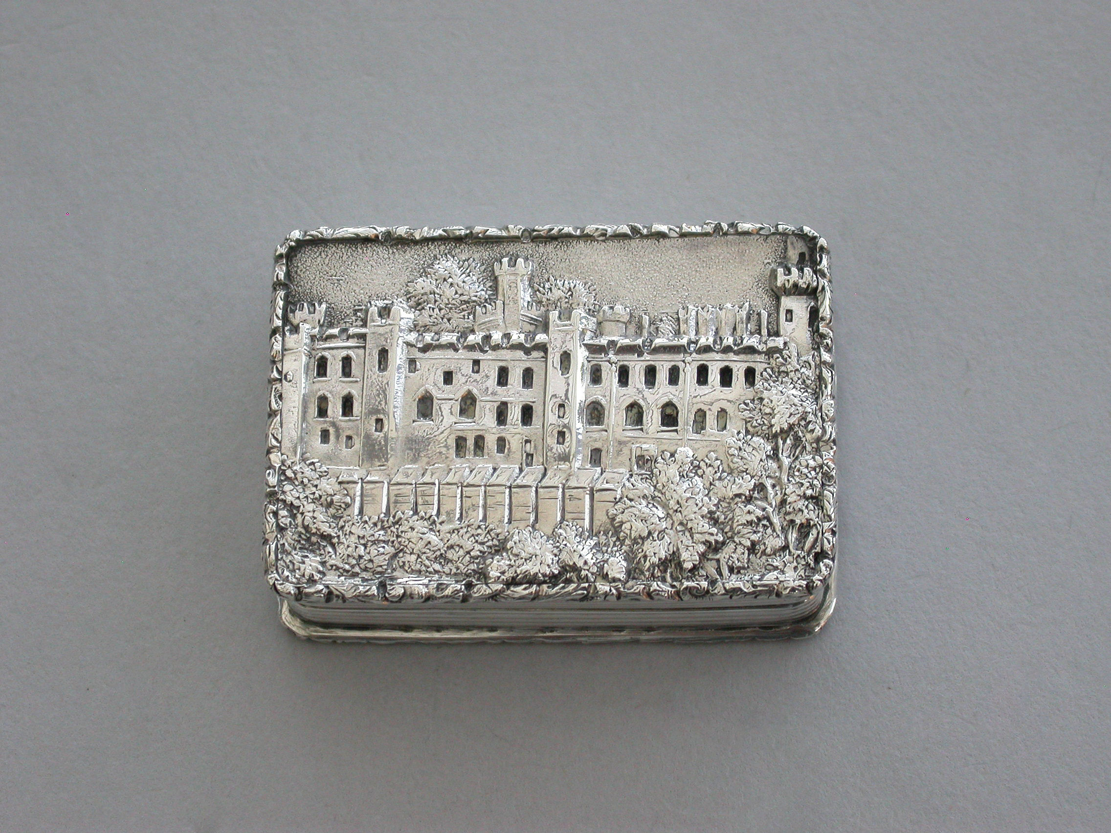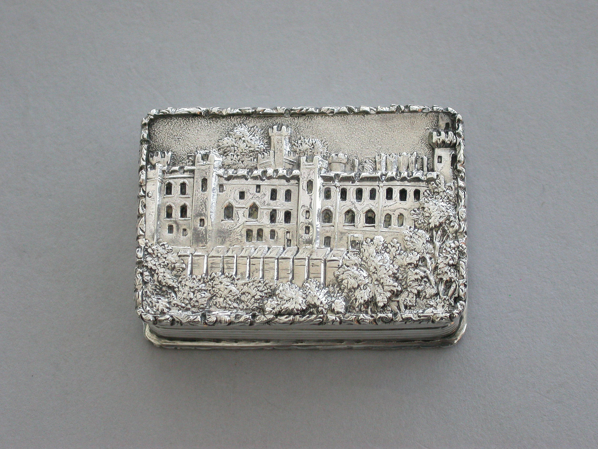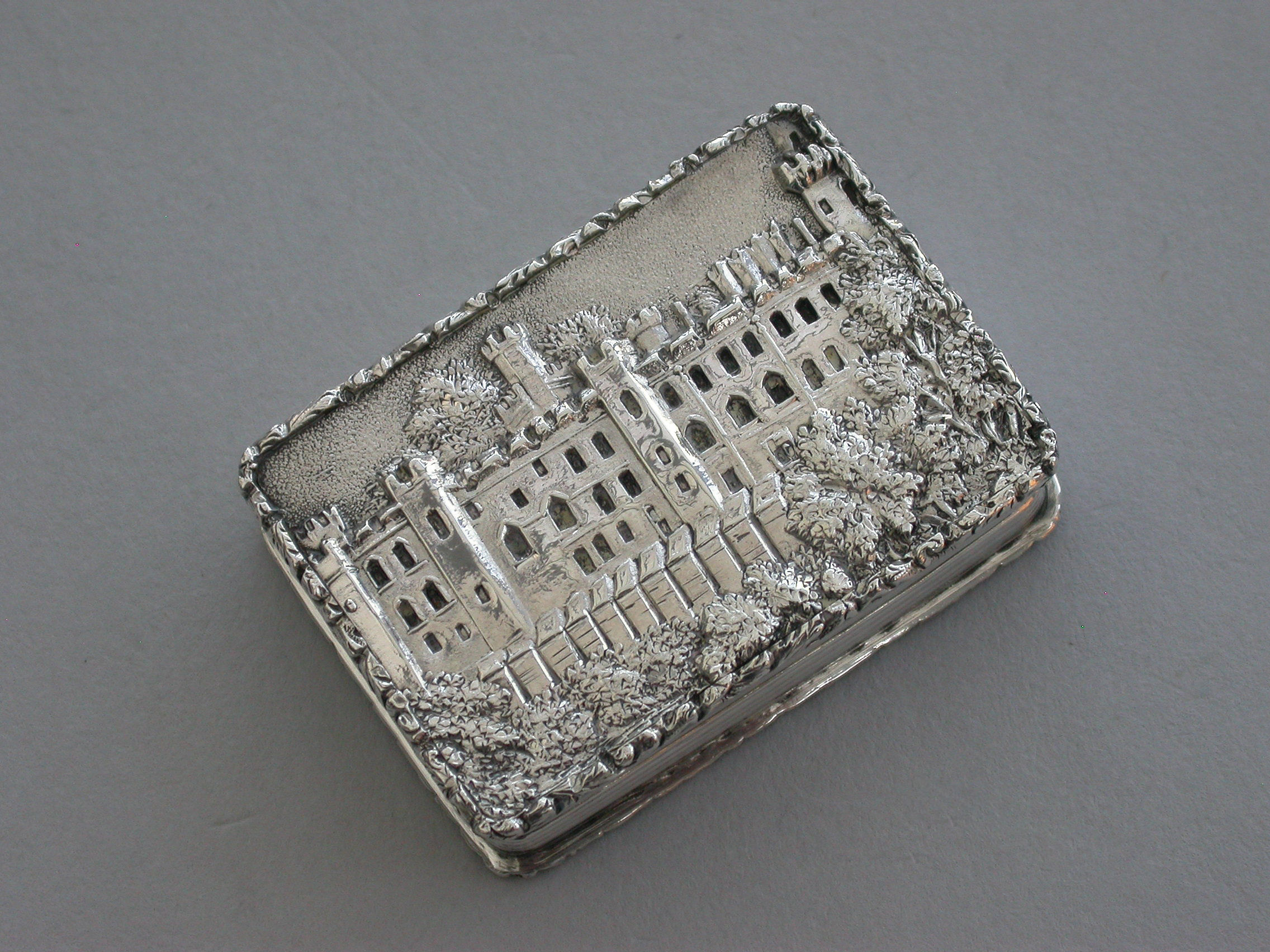 A very fine early Victorian silver 'Castle Top' Vinaigrette, of rectangular form with engine turned decoration to the base and reeded sides, raised foliate borders, the lid depicting a view of Warwick Castle in high relief, silver gilt interior with foliate scroll pierced grille.