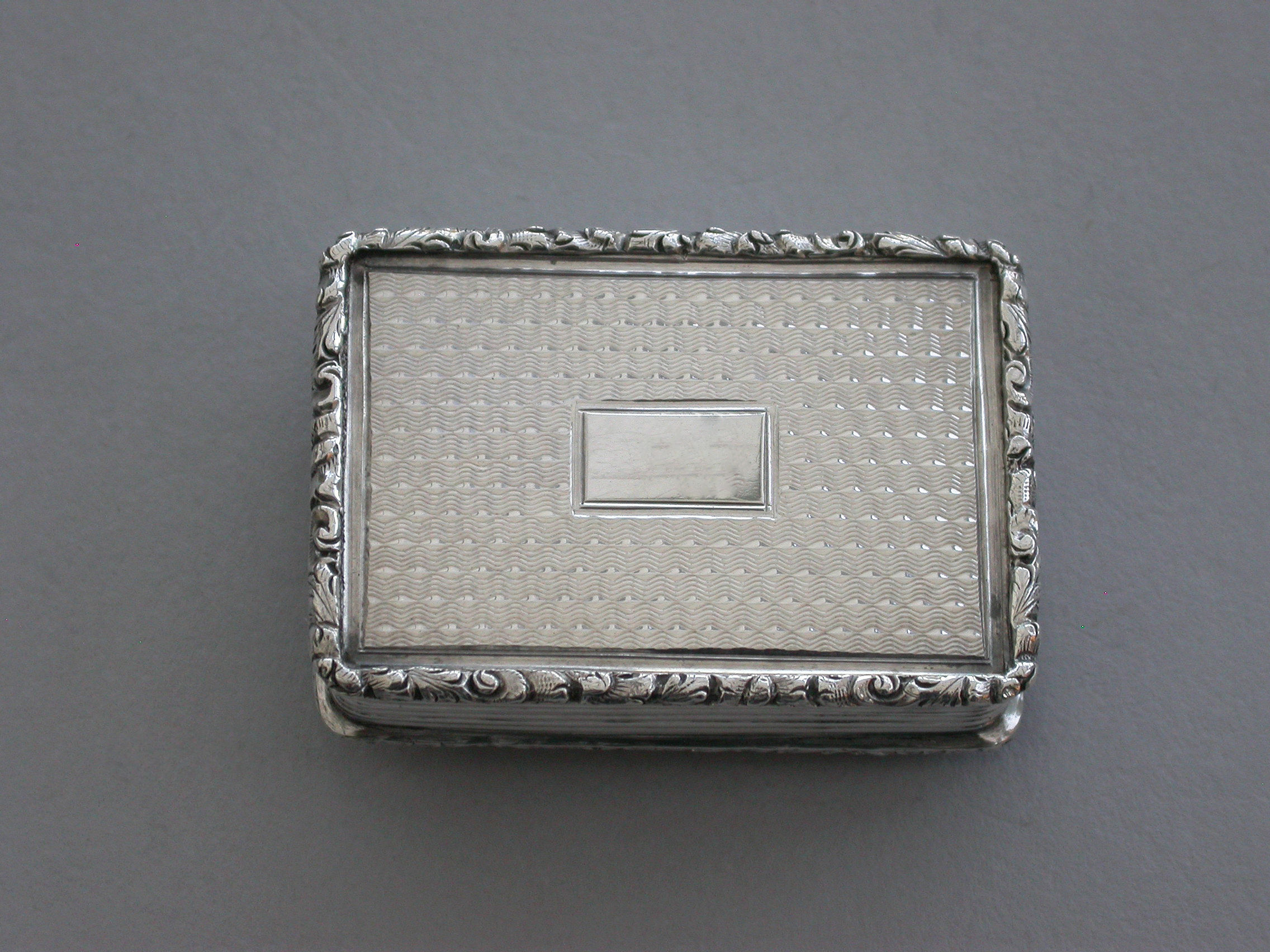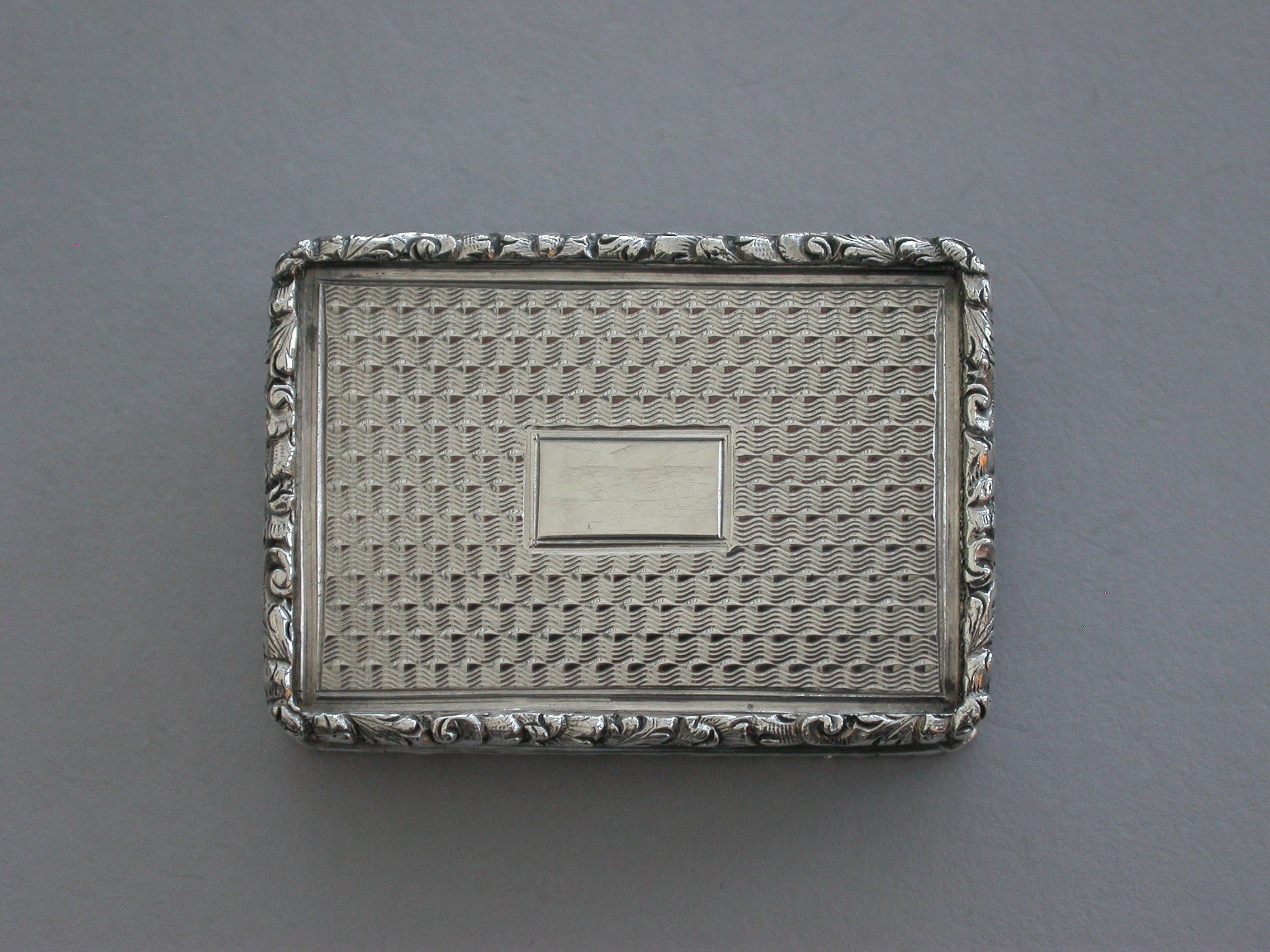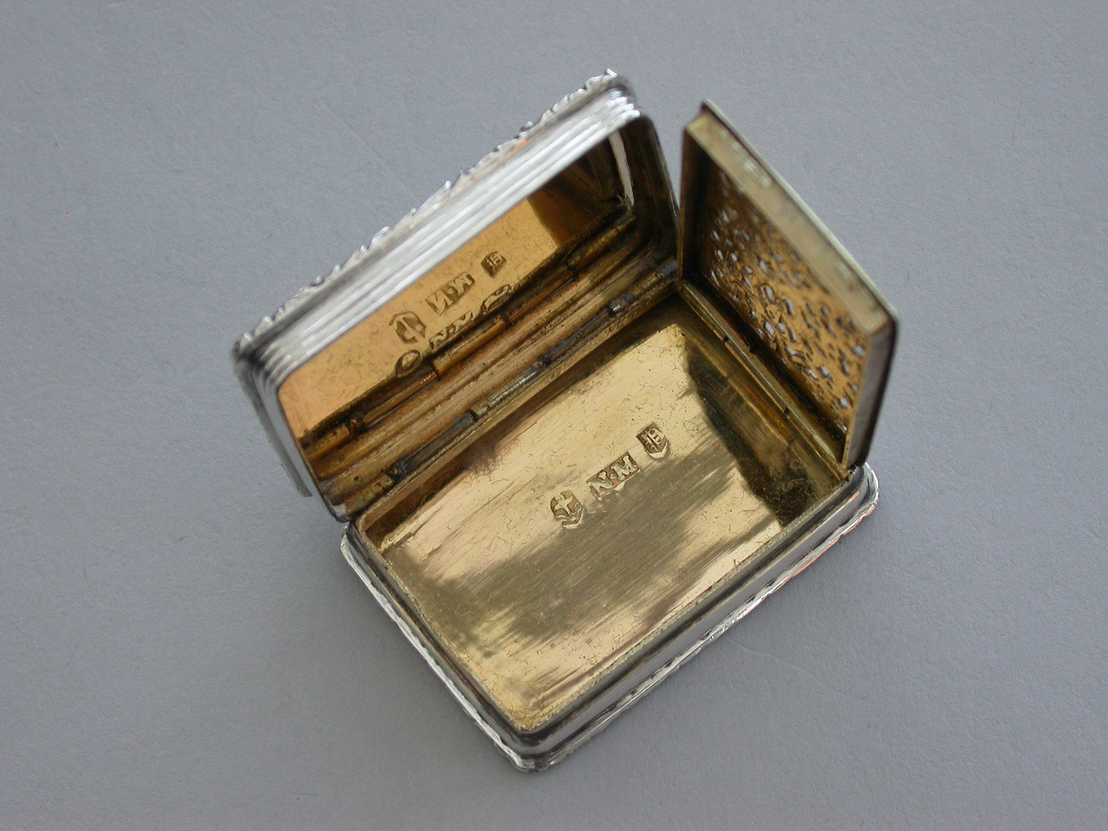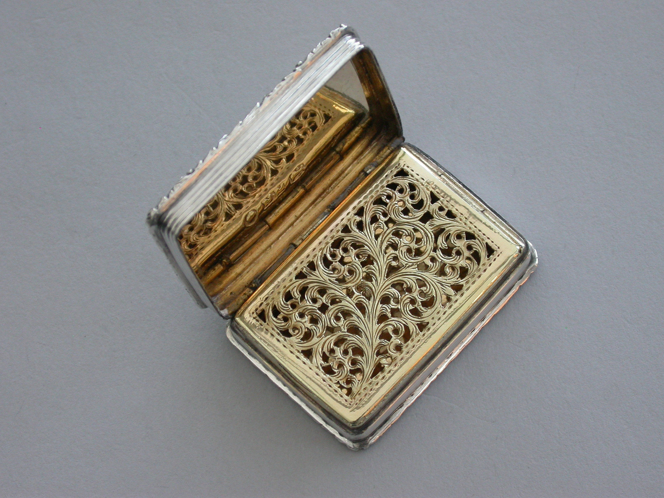 A very fine early Victorian silver 'Castle Top' Vinaigrette, of rectangular form with engine turned decoration to the base and reeded sides, raised foliate borders, the lid depicting a view of Warwick Castle in high relief, silver gilt interior with foliate scroll pierced grille.