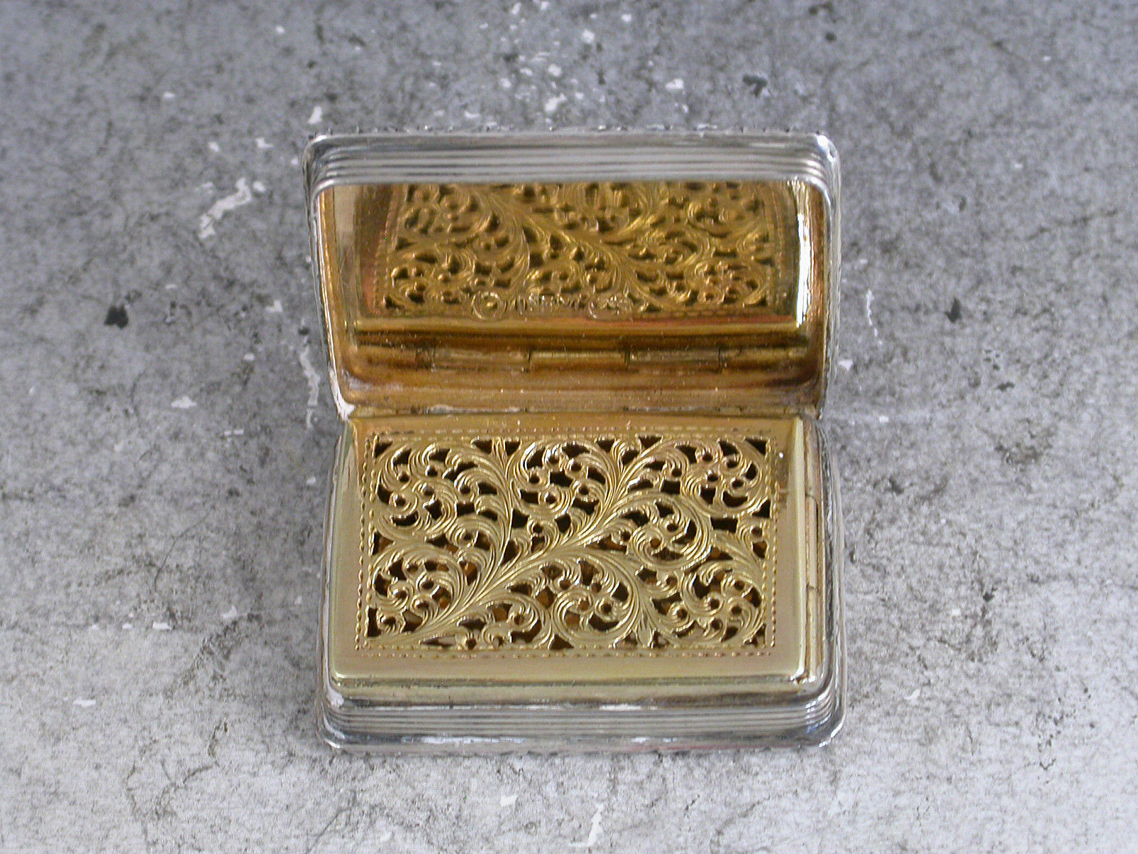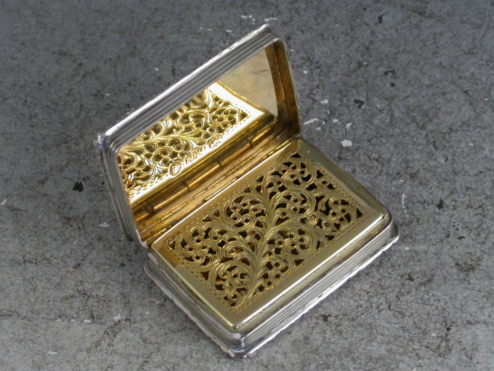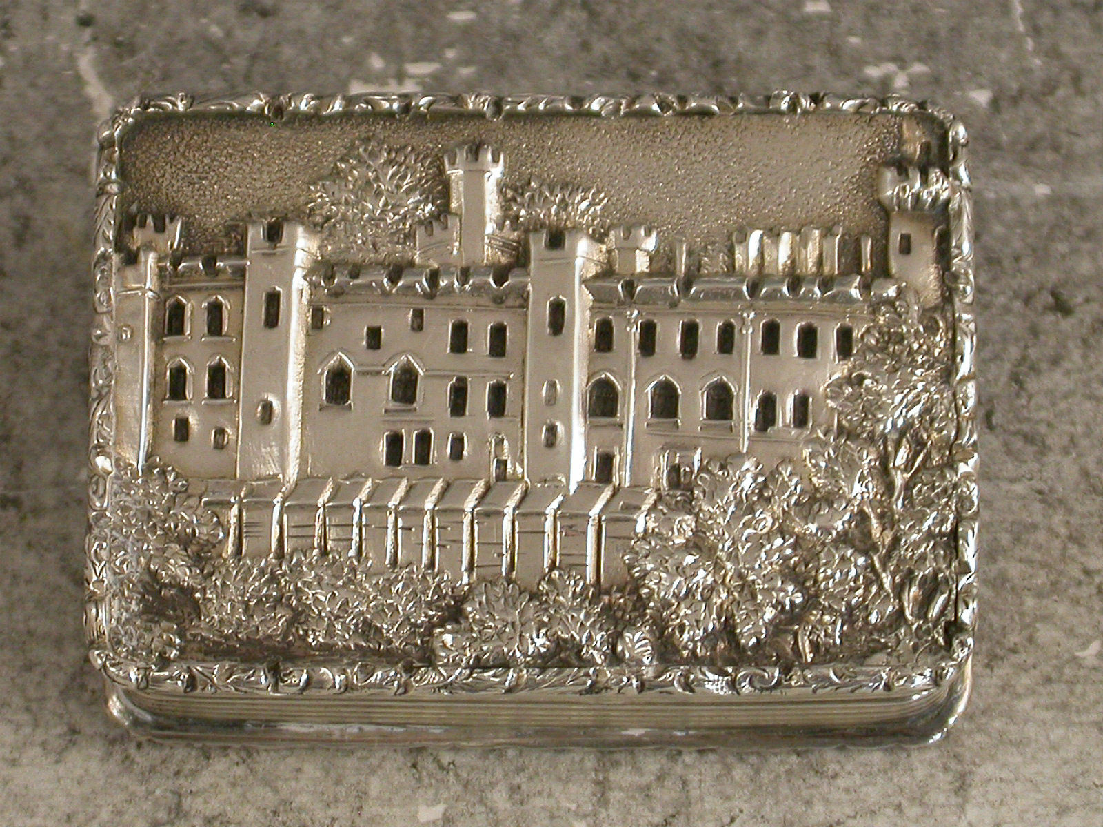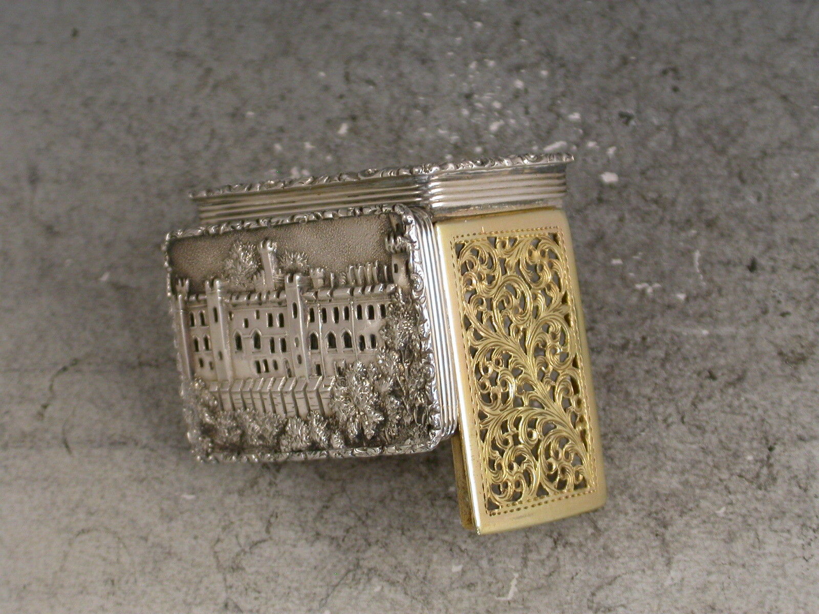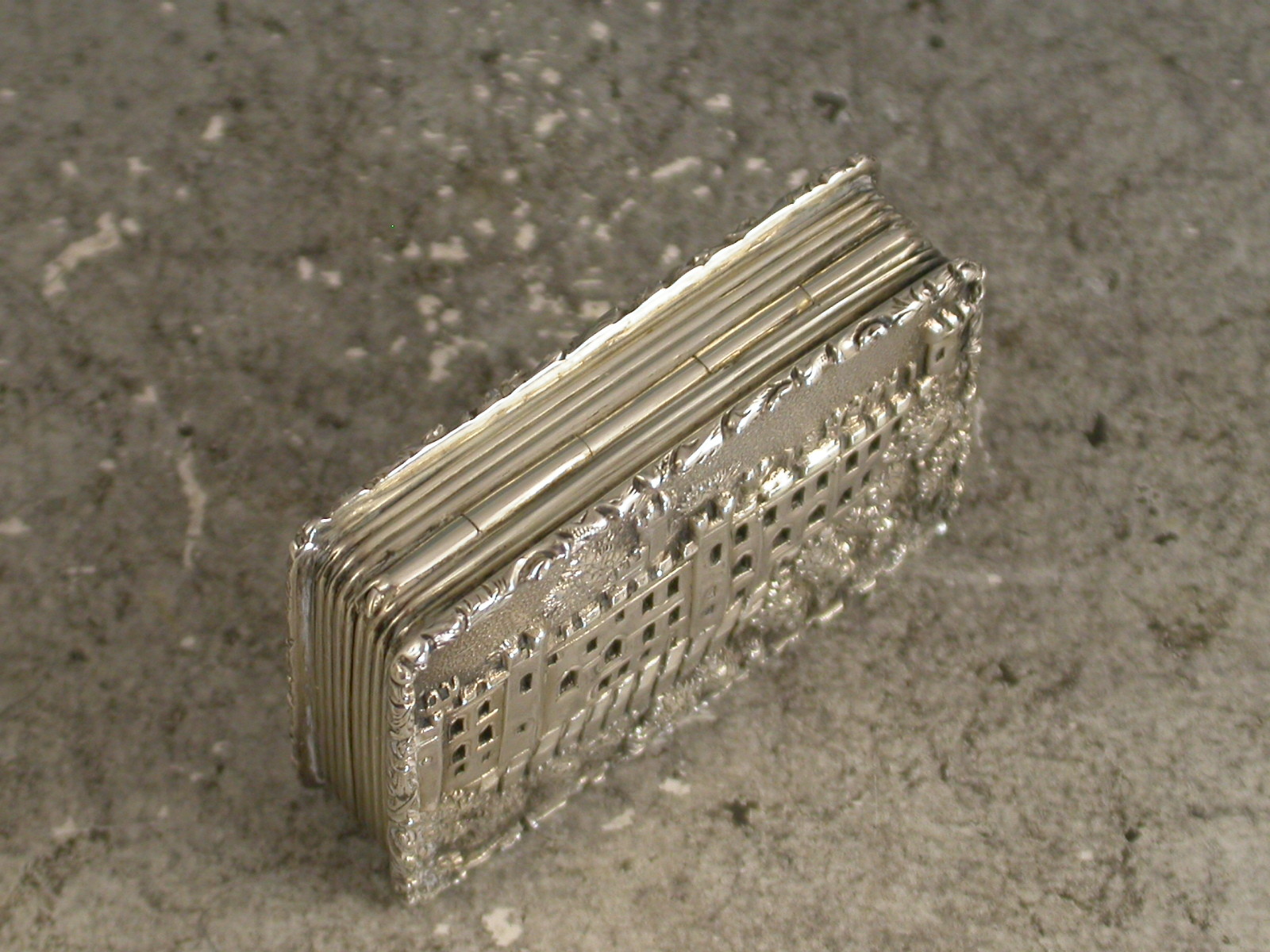 A very fine early Victorian silver 'Castle Top' Vinaigrette, of rectangular form with engine turned decoration to the base and reeded sides, raised foliate borders, the lid depicting a view of Warwick Castle in high relief, silver gilt interior with foliate scroll pierced grille.