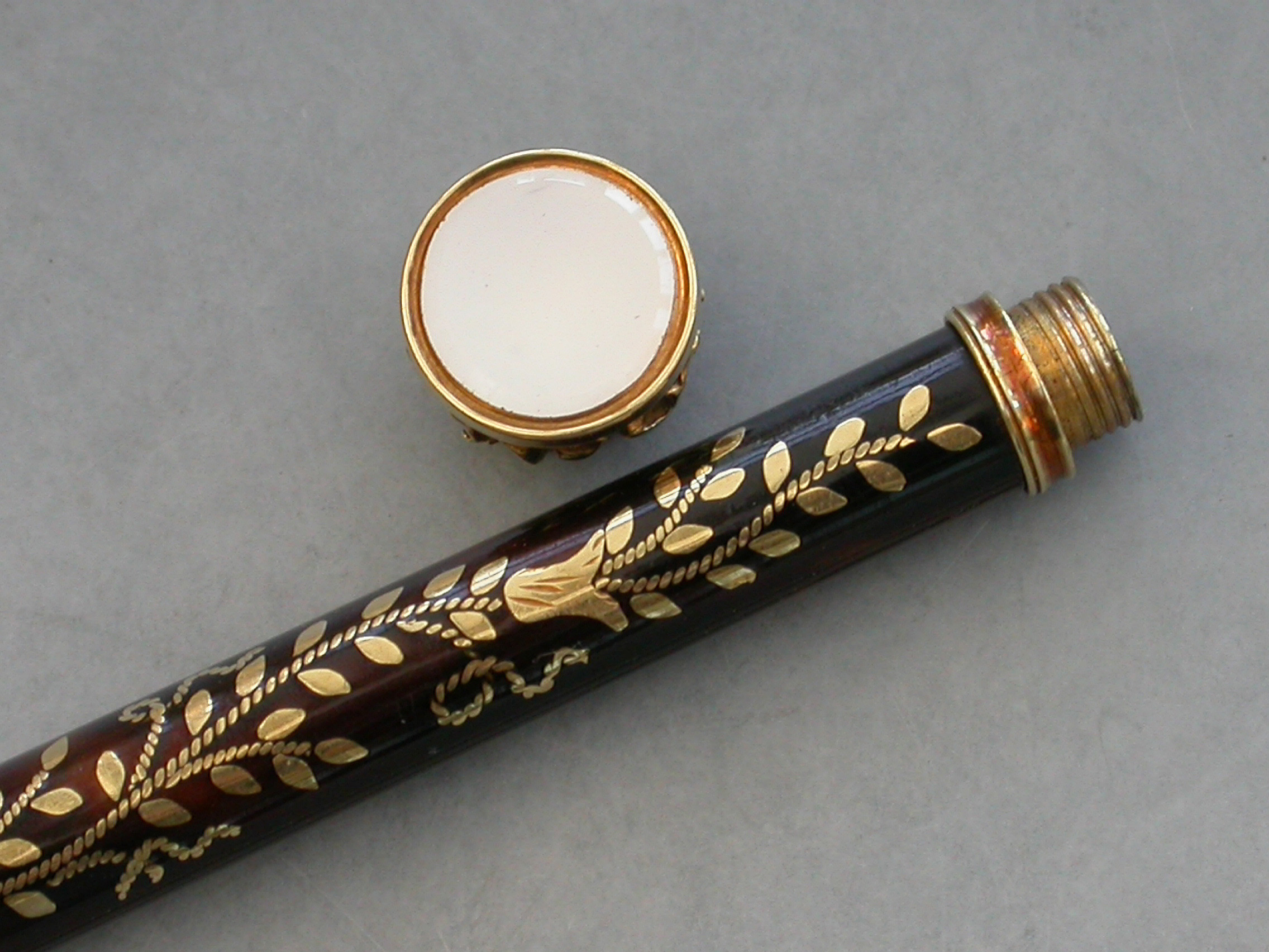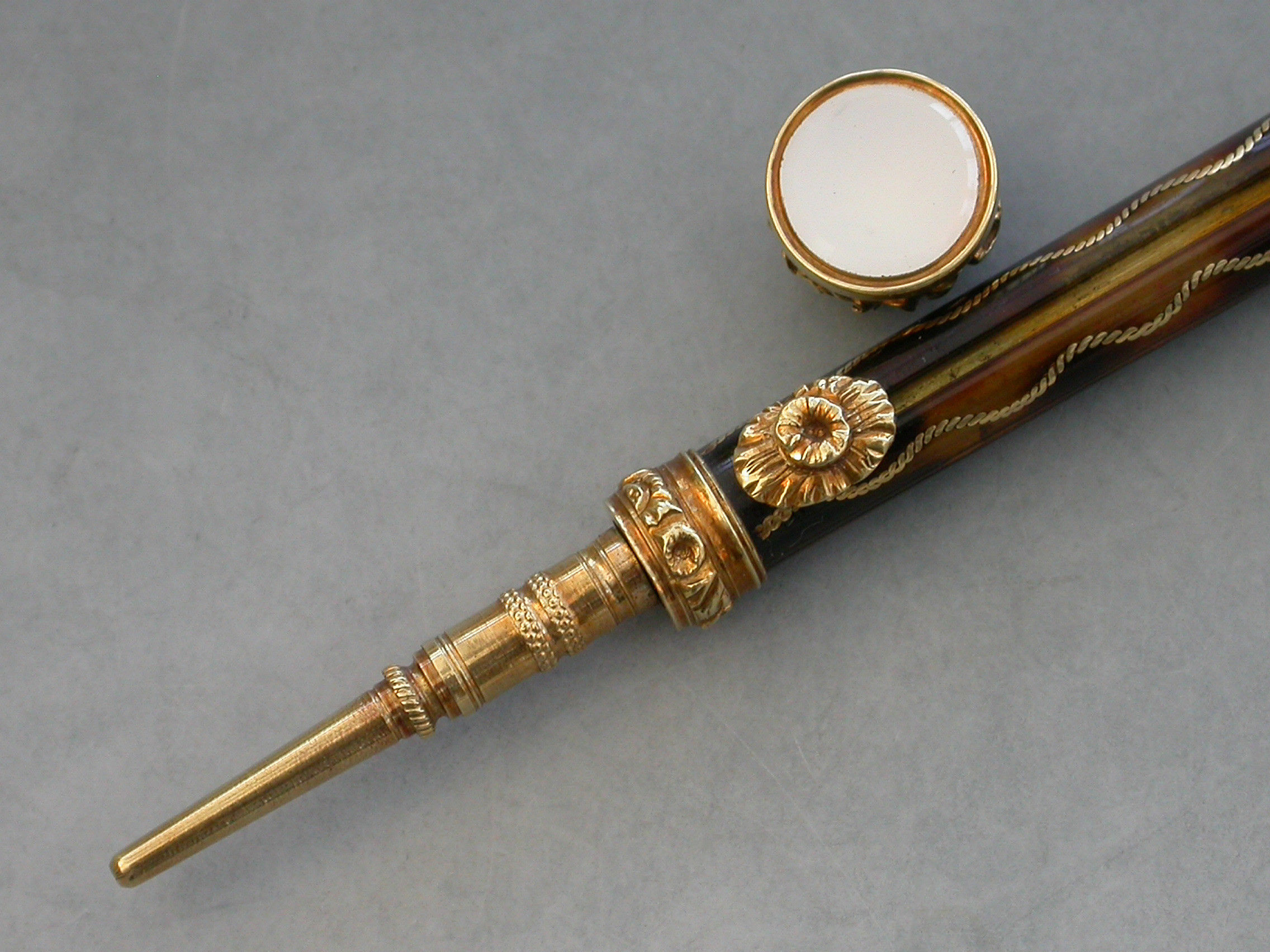 A very fine quality gold mounted tortoiseshell and pique work sliding Propelling Pencil with inlaid foliate motifs, the chased terminal set with a white agate seal stone.