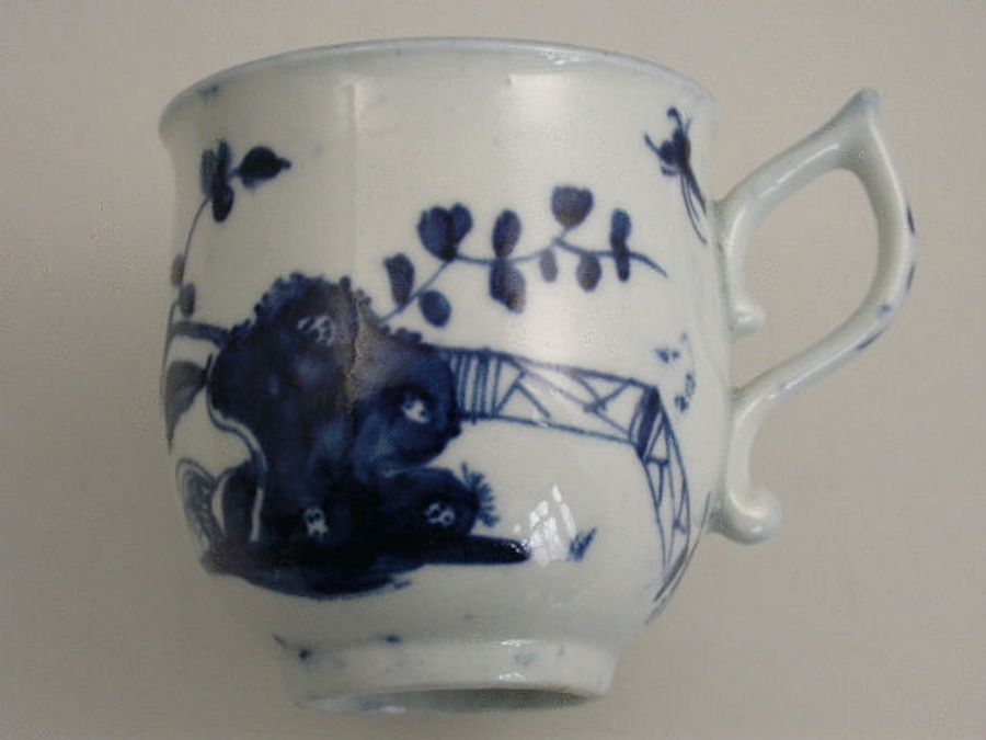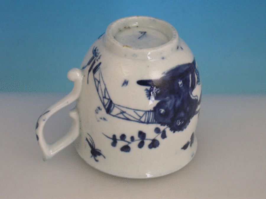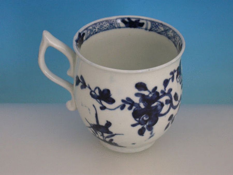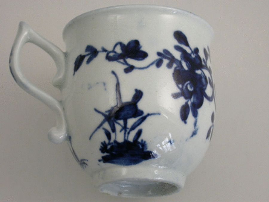 A good early Worcester bell shaped Coffee Cup with pixie ear handle, painted in underglaze blue with the ‘Warbler’ pattern depicting a Warbler type bird perched in reeds flanked by a flying insect within trailing foliate sprays and a garden fence, the interior with a cross hatched and leaf panel border.