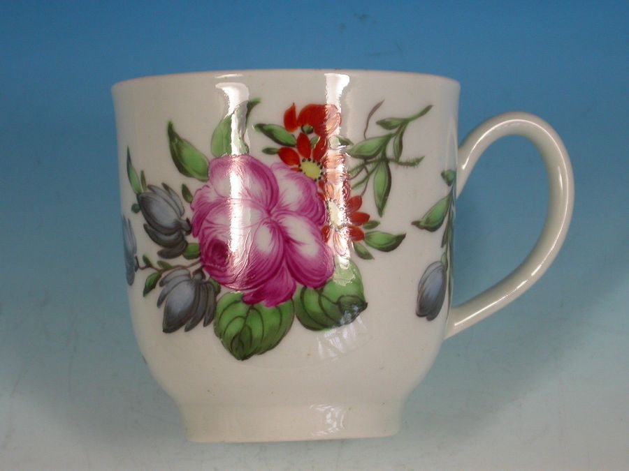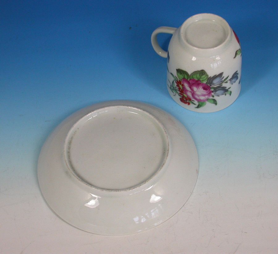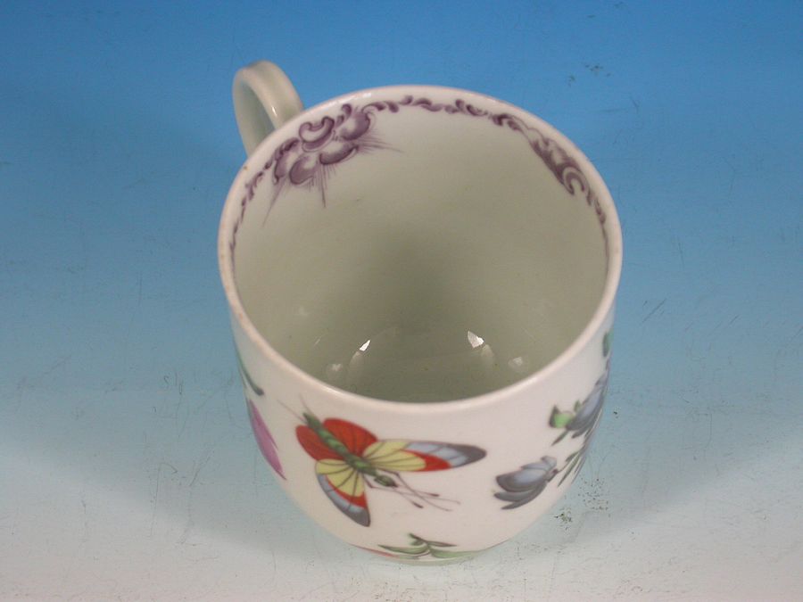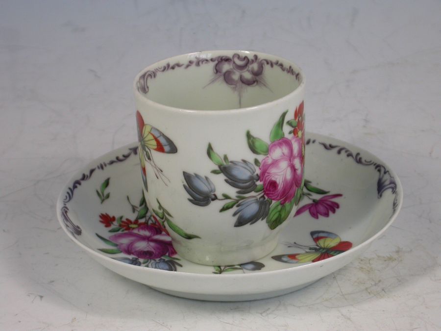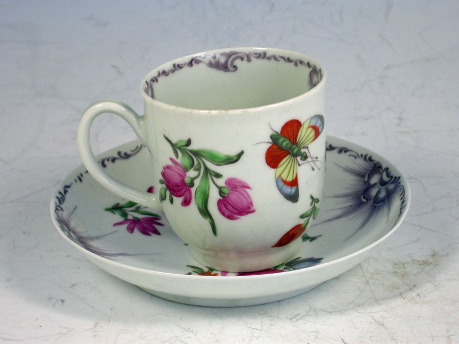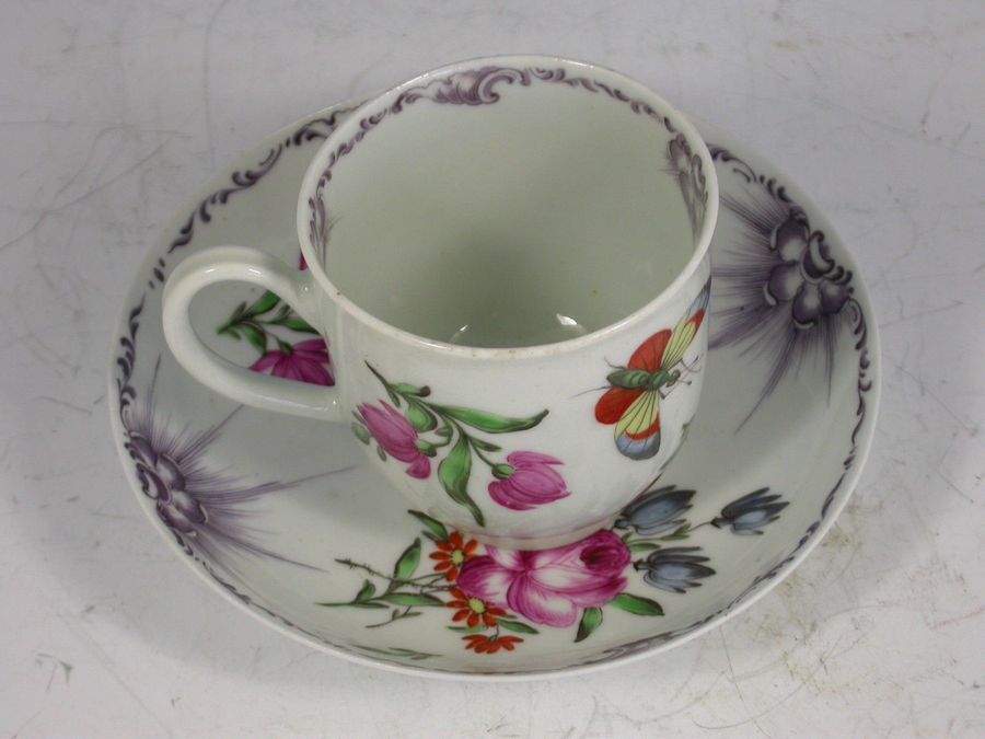 A very fine and rare Early Worcester Coffee Cup and Saucer, the cup with grooved strap handle, painted in polychrome enamels in the Meisson style with bouquets and sprays of English flowers, moths and sprigs within a purple monochrome border including sunbursts and half of a flowerhead radiating from the rims.