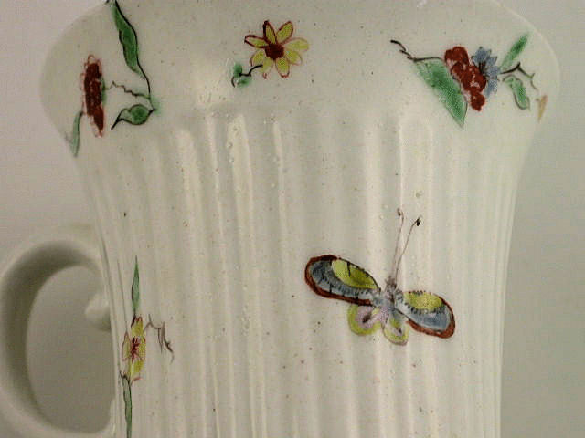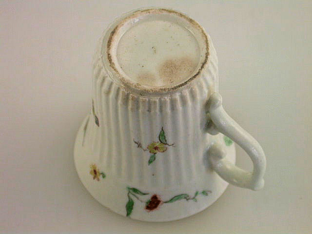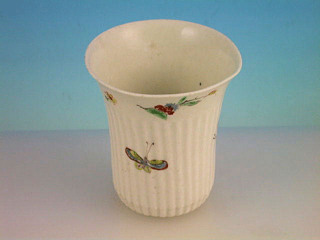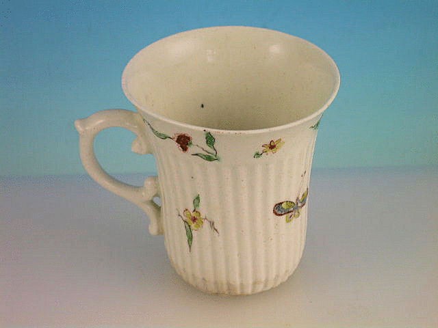A good early Worcester Coffee Cup of reeded form with double scroll handle, painted in polychrome enamels with insects and floral sprays.