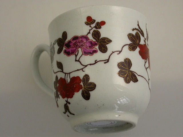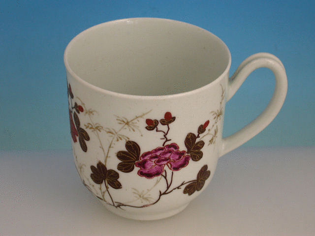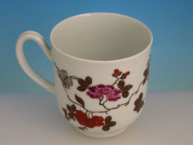 A fine early Worcester Coffee Cup with everted rims and grooved strap handle, painted in the Chinese manner with famille rose peony blooms with brown leaves, a spray of bamboo and a pencilled butterfly to the reverse.