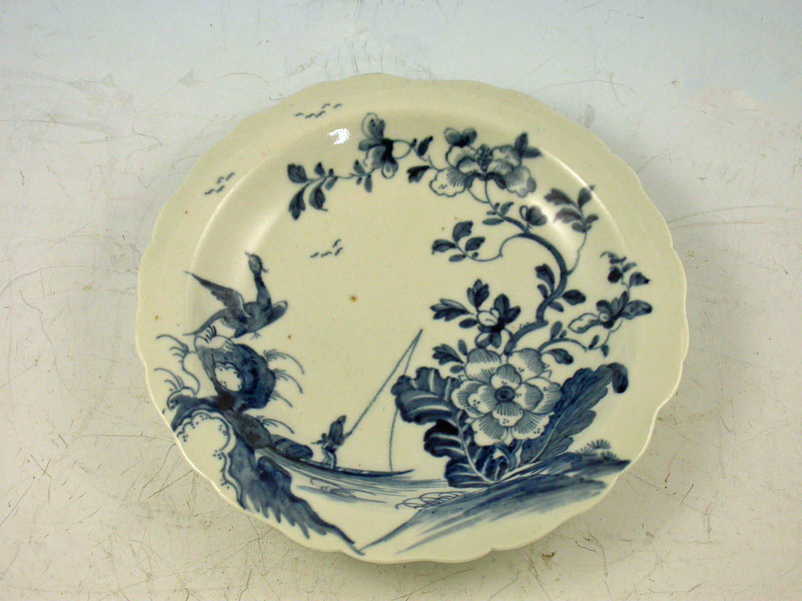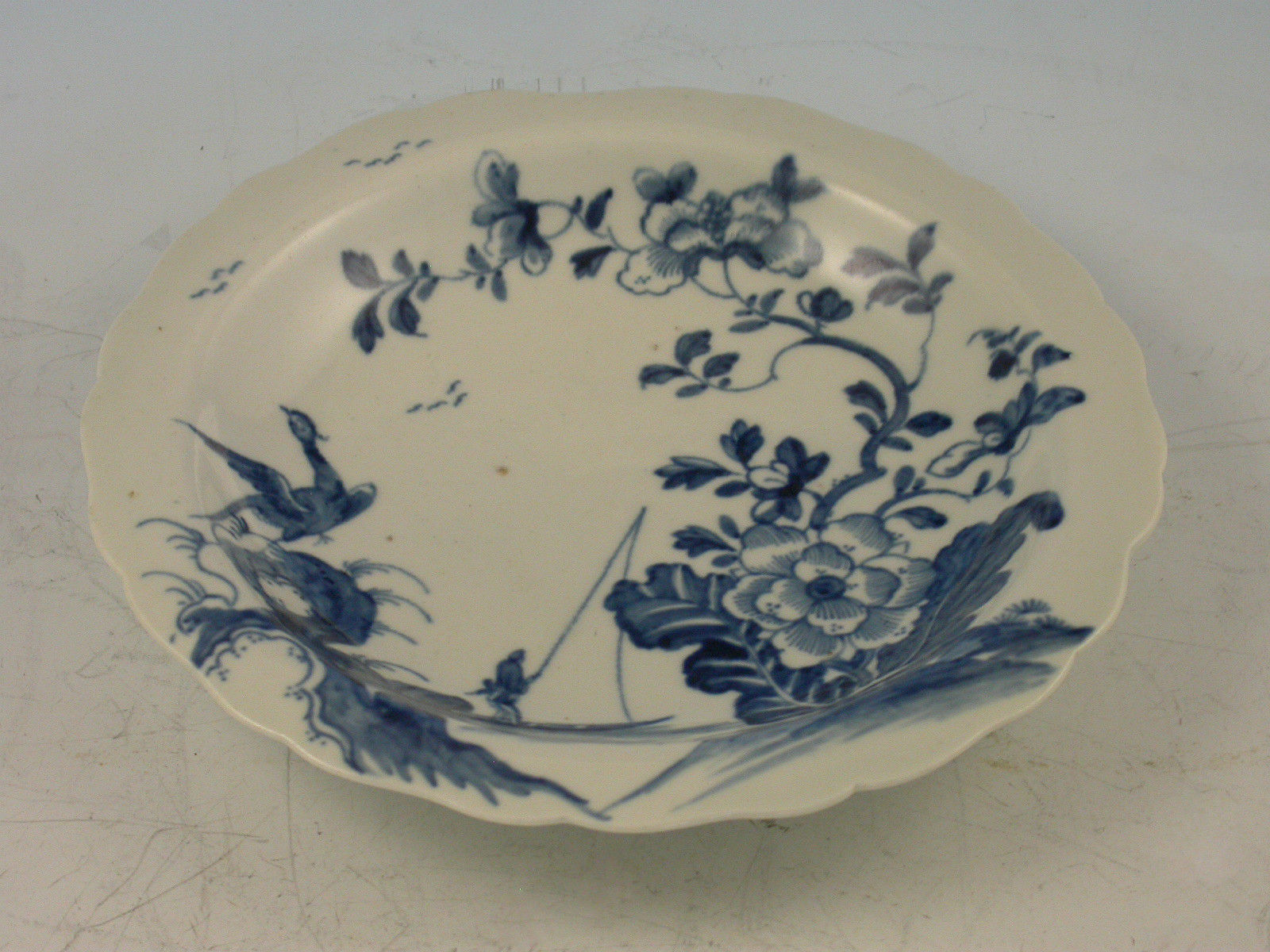 A very fine circular Worcester shallow Finger Bowl Stand with an irregularly-cut lobed rim and carefully painted in pale blue in the Chinese style with a cormorant perched on a tall rock, its wings outstretched, observing a man fishing from a sampan. To the right is a flowering tree peony growing from the river bank and flanked by large leaves. The ""Cormorant"" pattern I.B. 28.