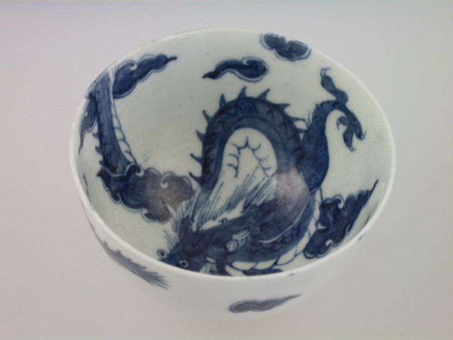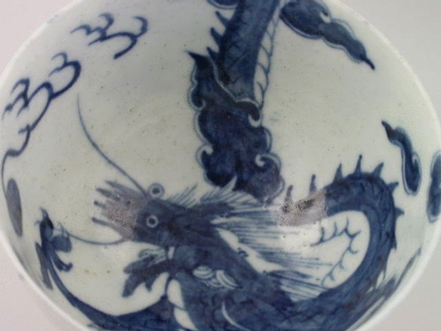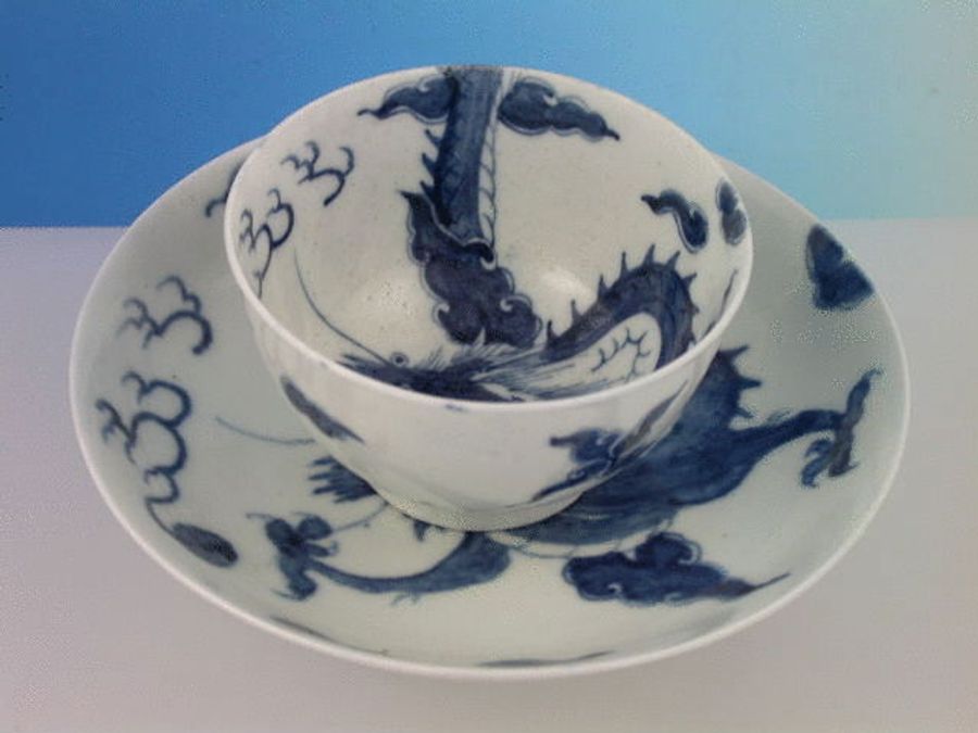 A fine early Worcester Tea Bowl and Saucer, painted in under glazed blue with the so called “Dragon” pattern, depicting a coiled beast pursuing a flaming pearl amongst clouds with its tail curling over the rim. c1758.