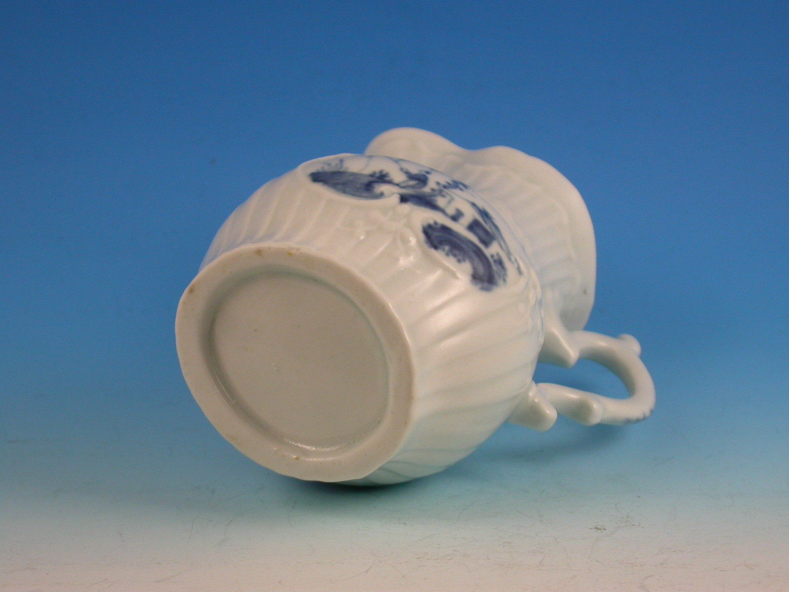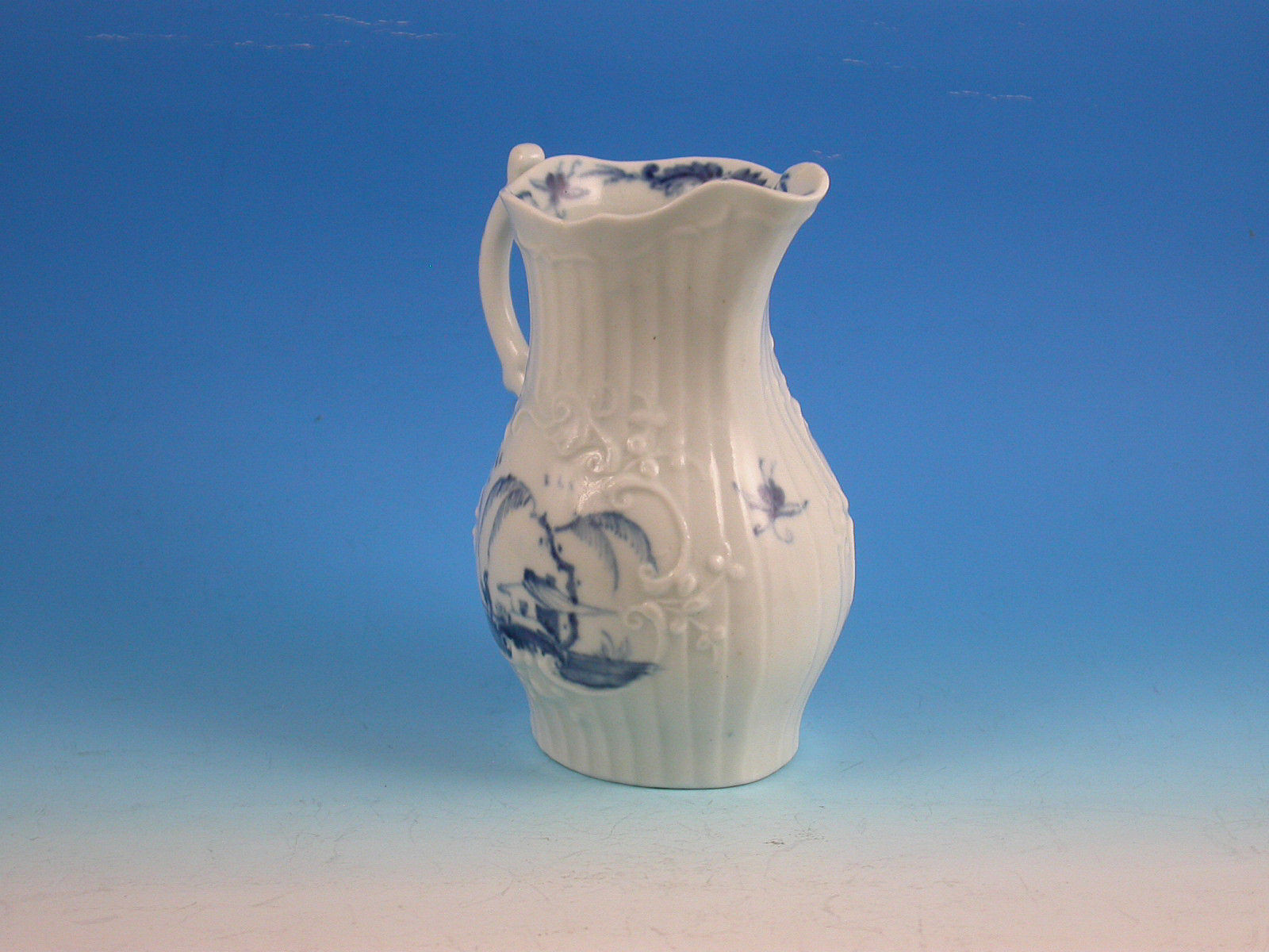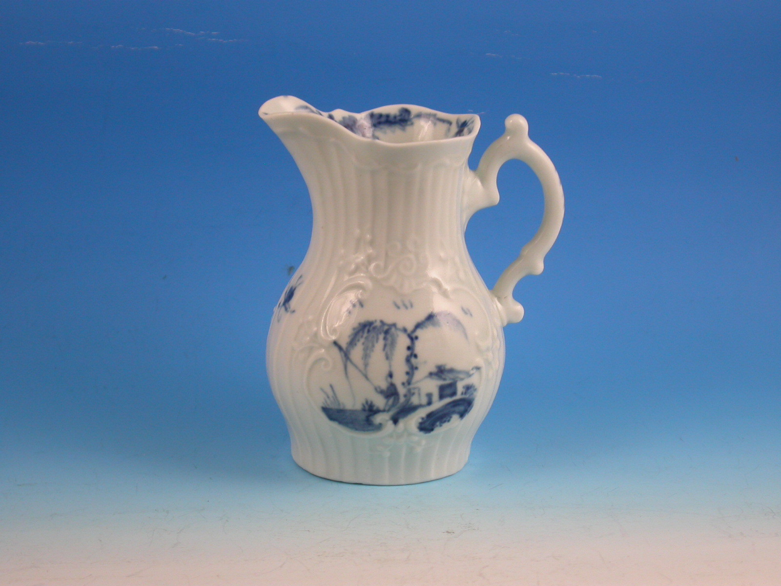 A good early Worcester spiral moulded Cream Jug of small size with scrolled handle and thumb piece, painted in the mirror shaped reserves with the ""Fisherman and Willow Pavilion pattern"", depicting a fisherman seated under a willow tree and a house to the side, the interior border with a leaf garland.